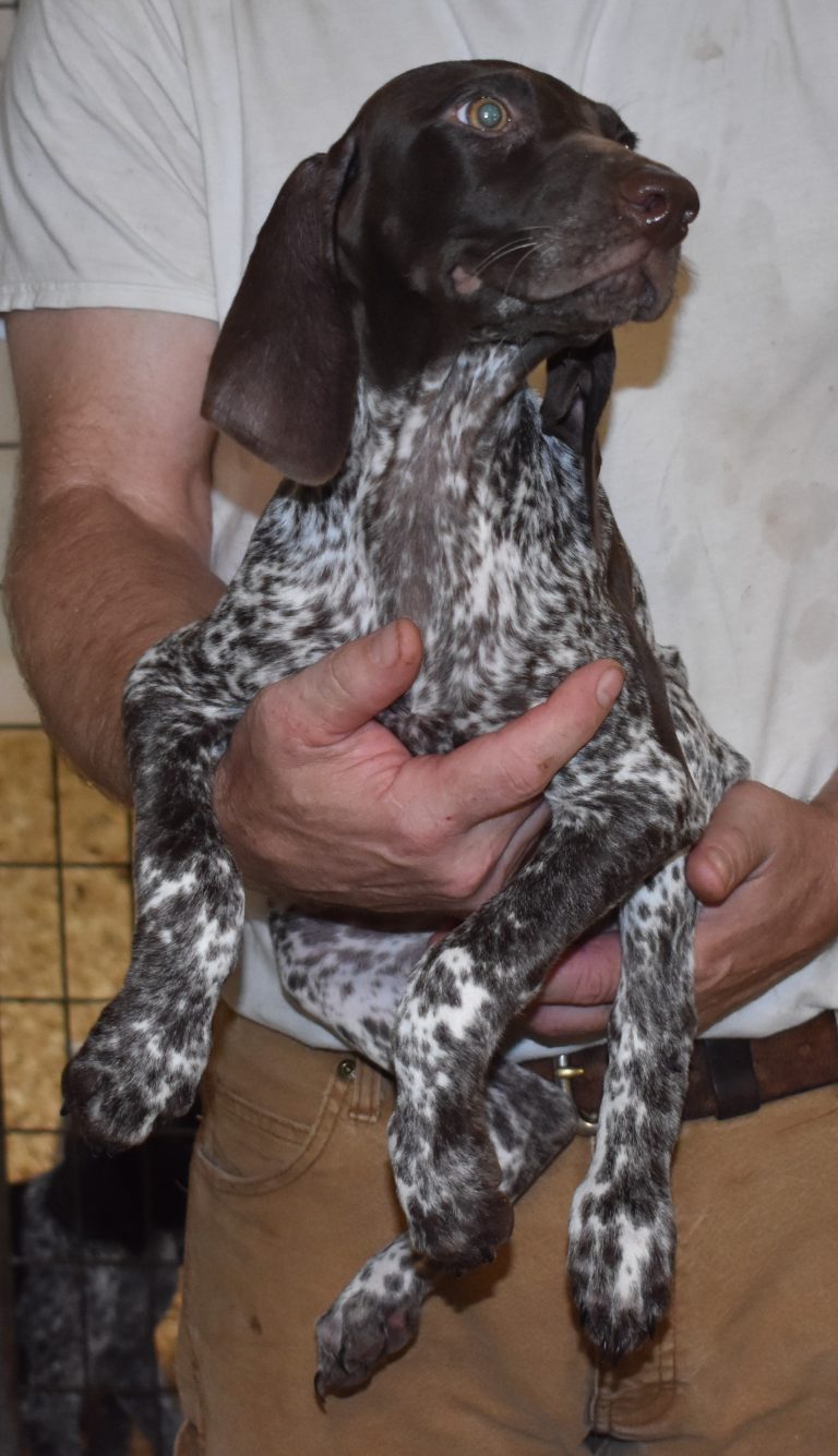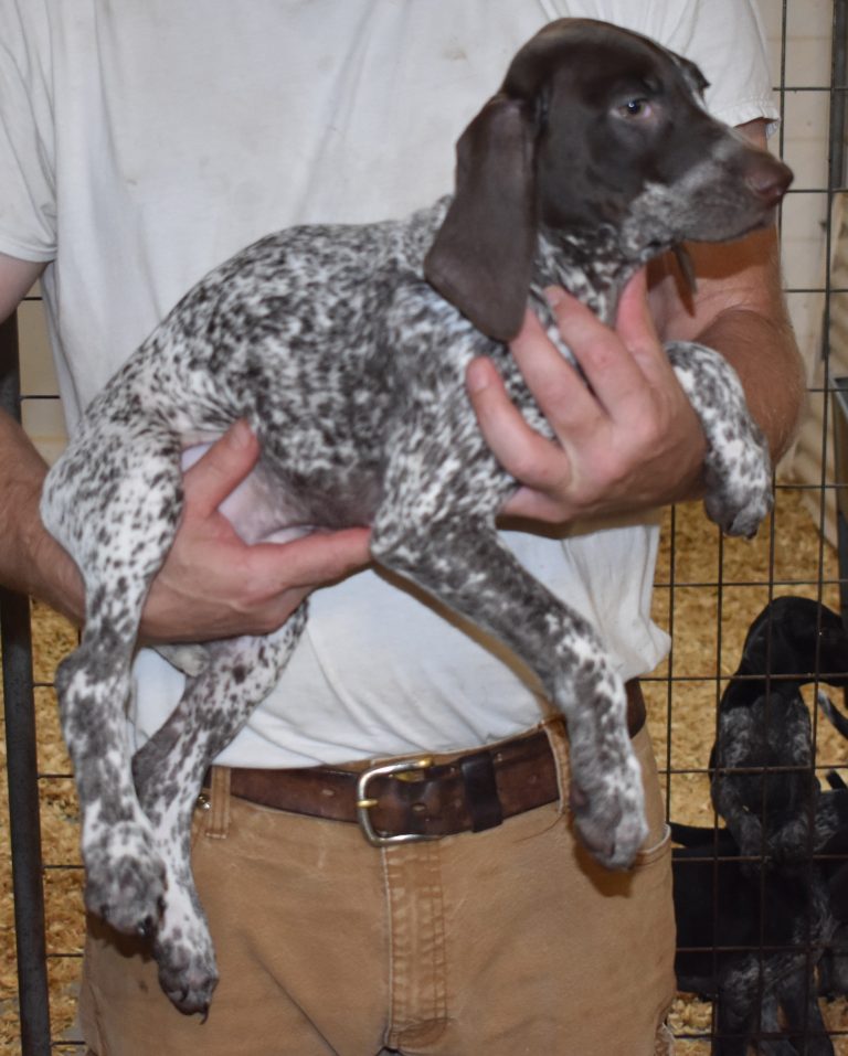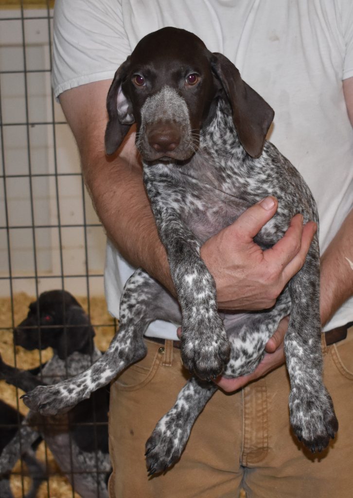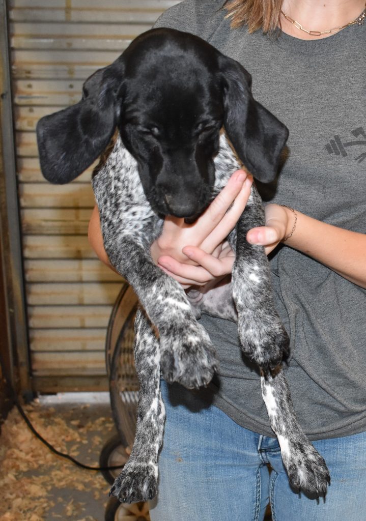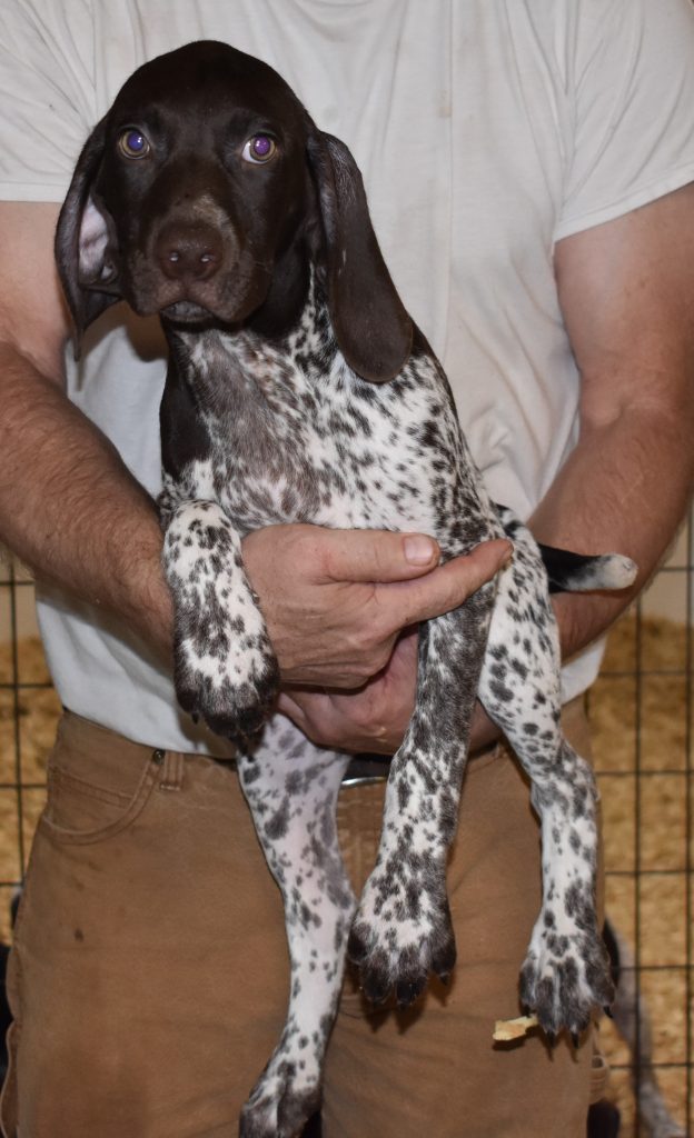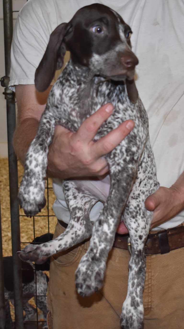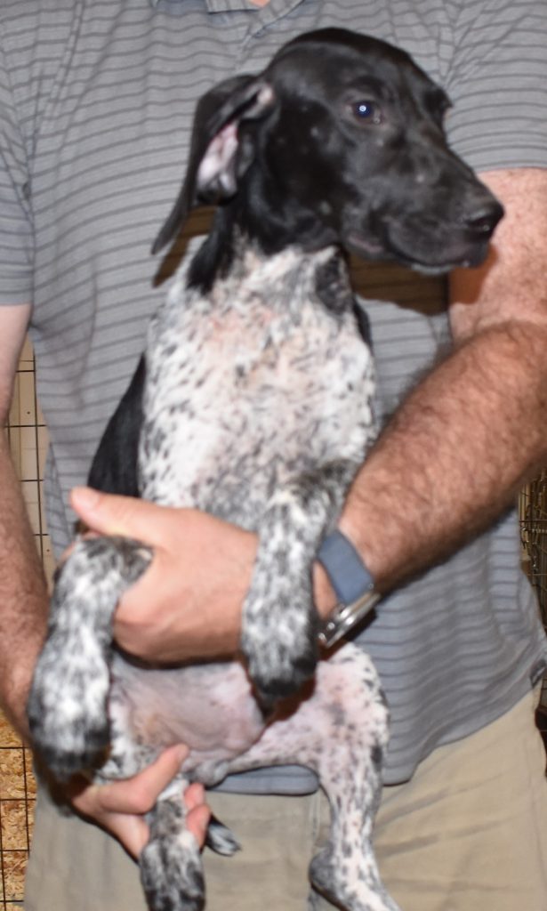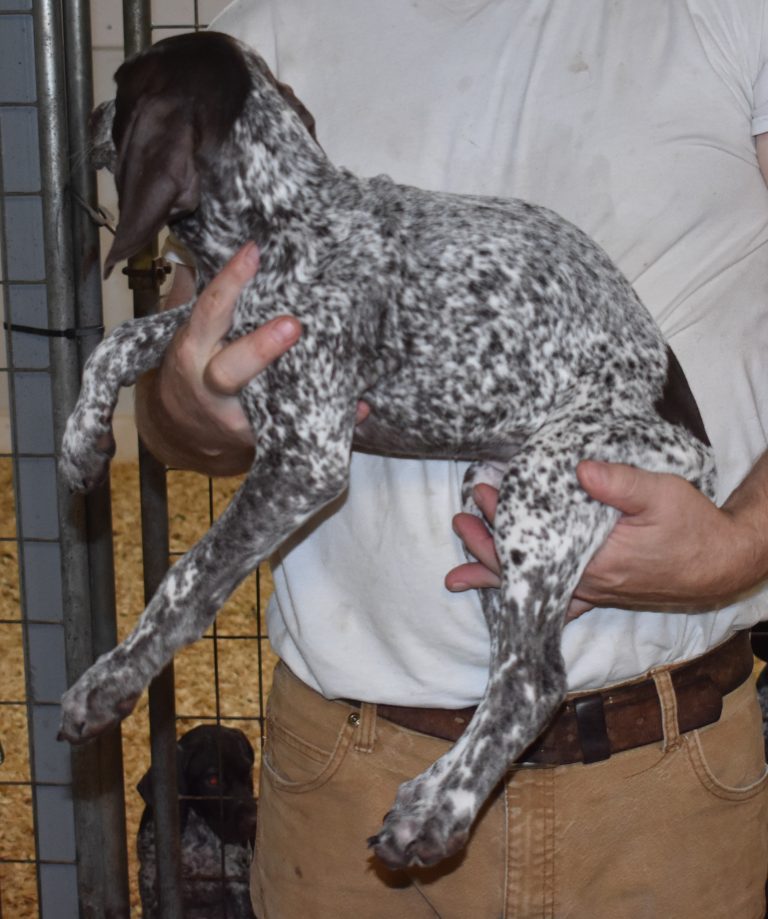 A-Sis F2 is available. She is gorgeous from Sis and Atlas. The sire is a European import with the Deutsch Keuzar. The dam is from a long line of great GSPs. The dam’s dad is a top field trial dog in the country. These pups will be great companions and great in the field. The pup’s body is going to become more black ticked as she grows. She is a great looking pup with a mostly black head. She is beautiful. Becky chose this striking pup that will turn into a strikingly beautiful adult. Great choice.