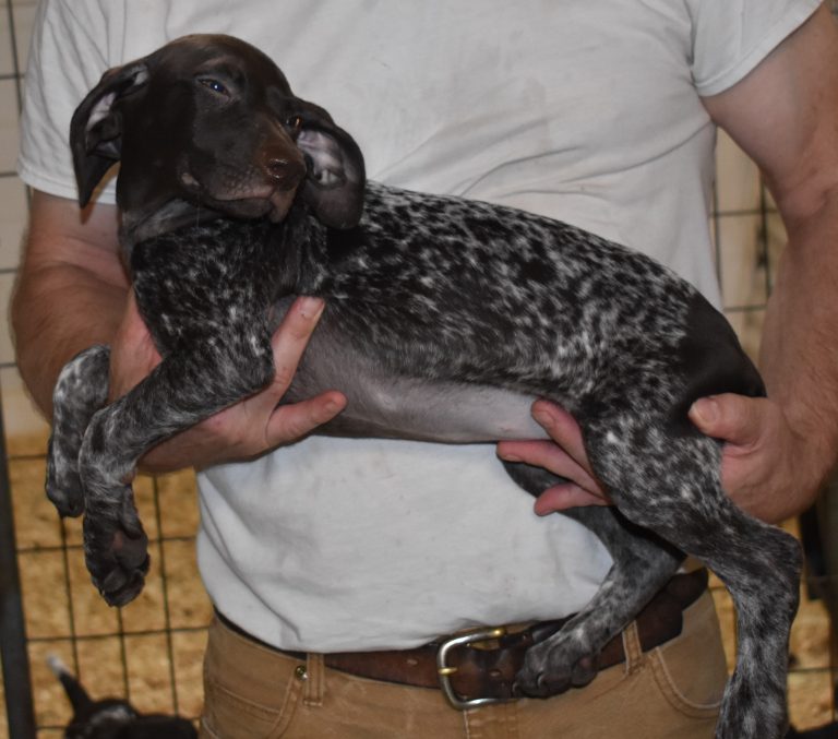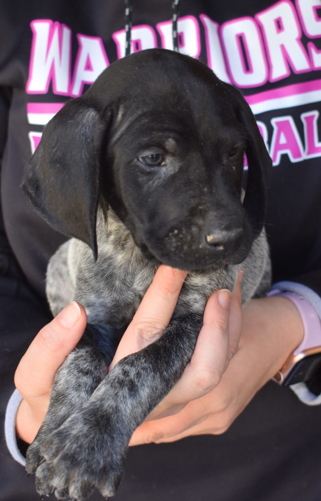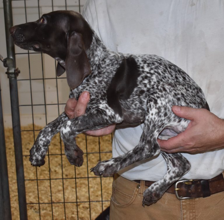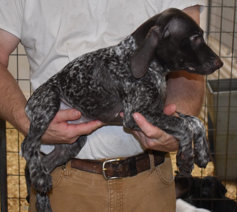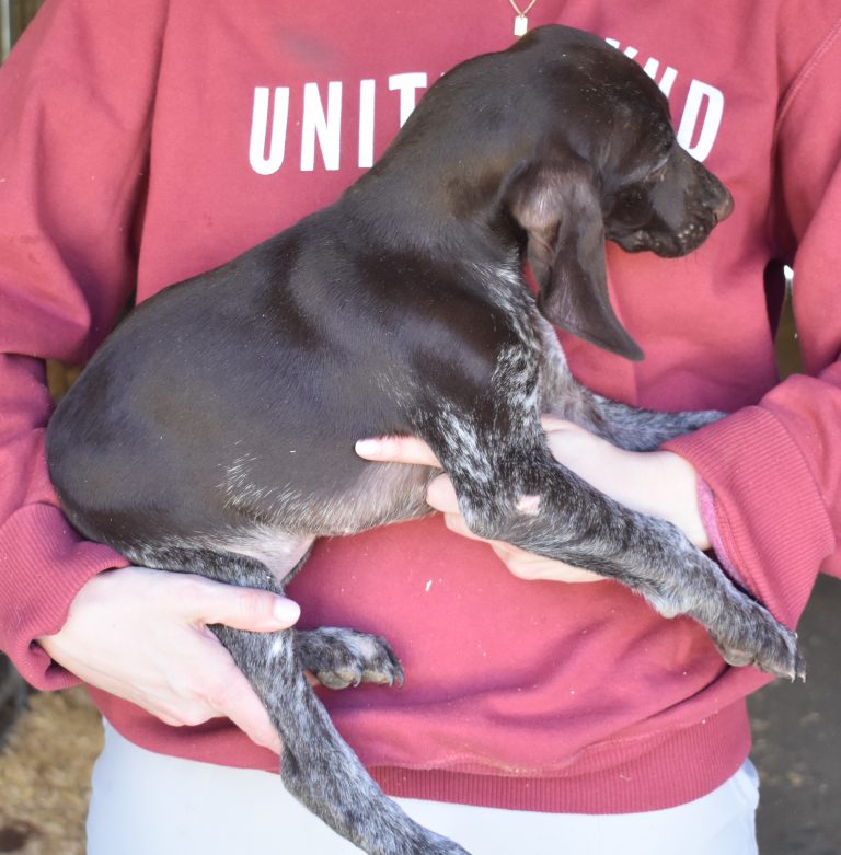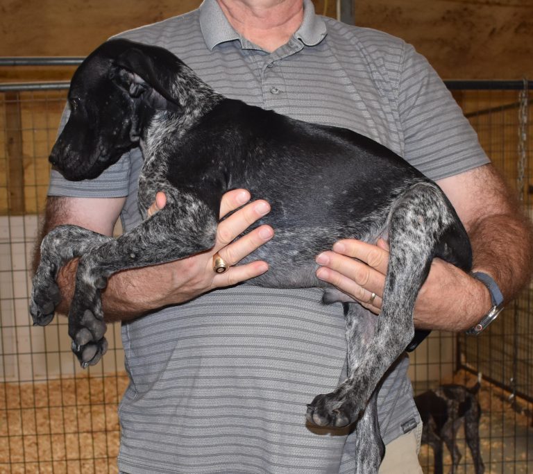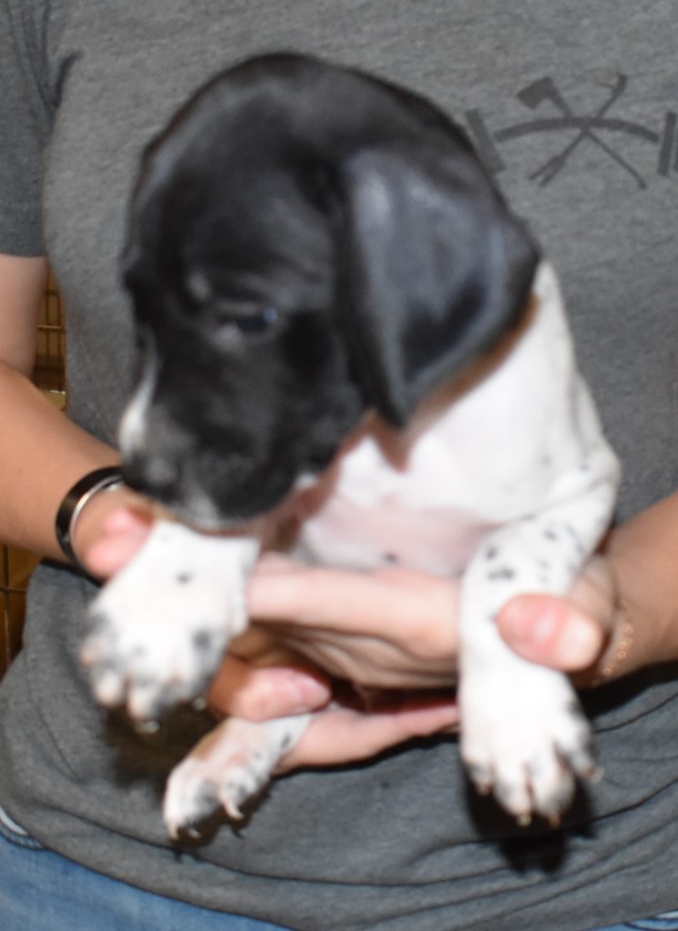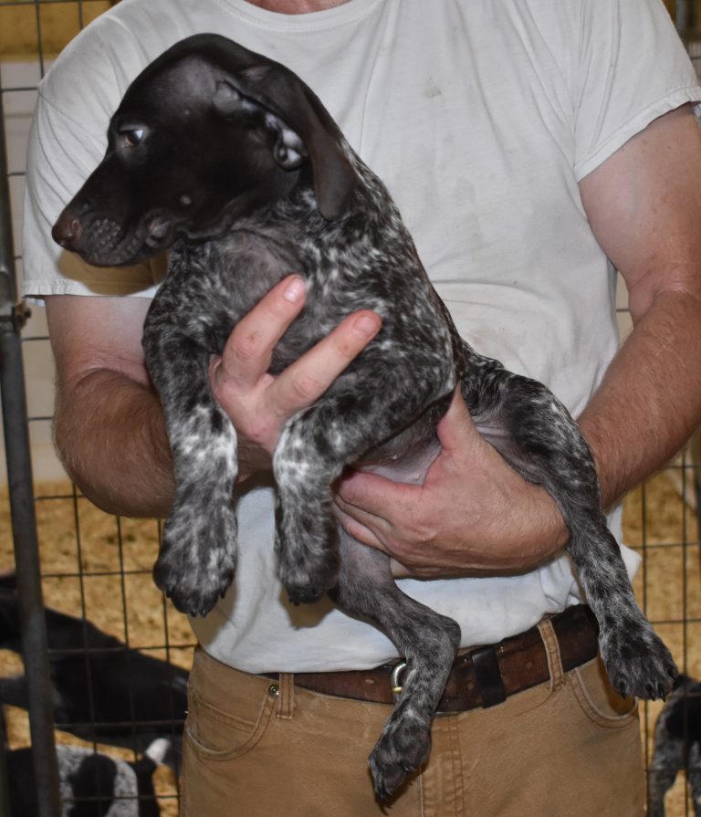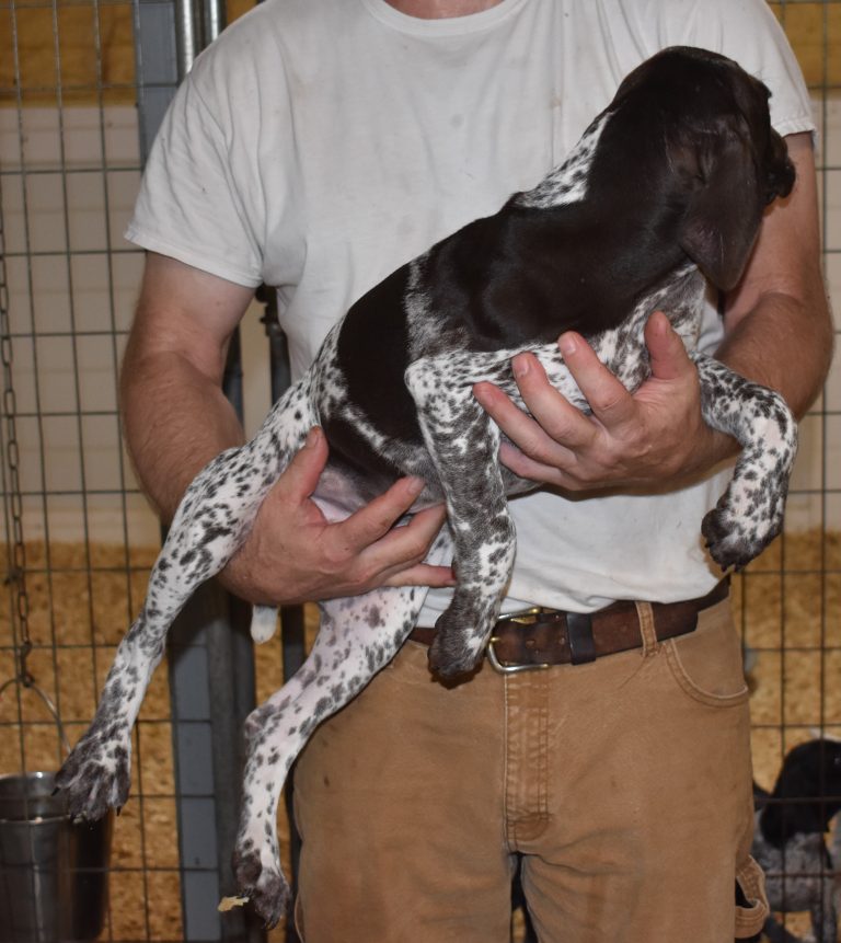 A-Sis F2 is available. She is gorgeous from Sis and Atlas. The sire is a European import with the Deutsch Keuzar. The dam is from a long line of great GSPs. The dam’s dad is a top field trial dog in the country. These pups will be great companions and great in the field. The pup’s body is going to become more black ticked as she grows. She is a great looking pup with a mostly black head. She is beautiful. Becky chose this striking pup that will turn into a strikingly beautiful adult. Great choice.