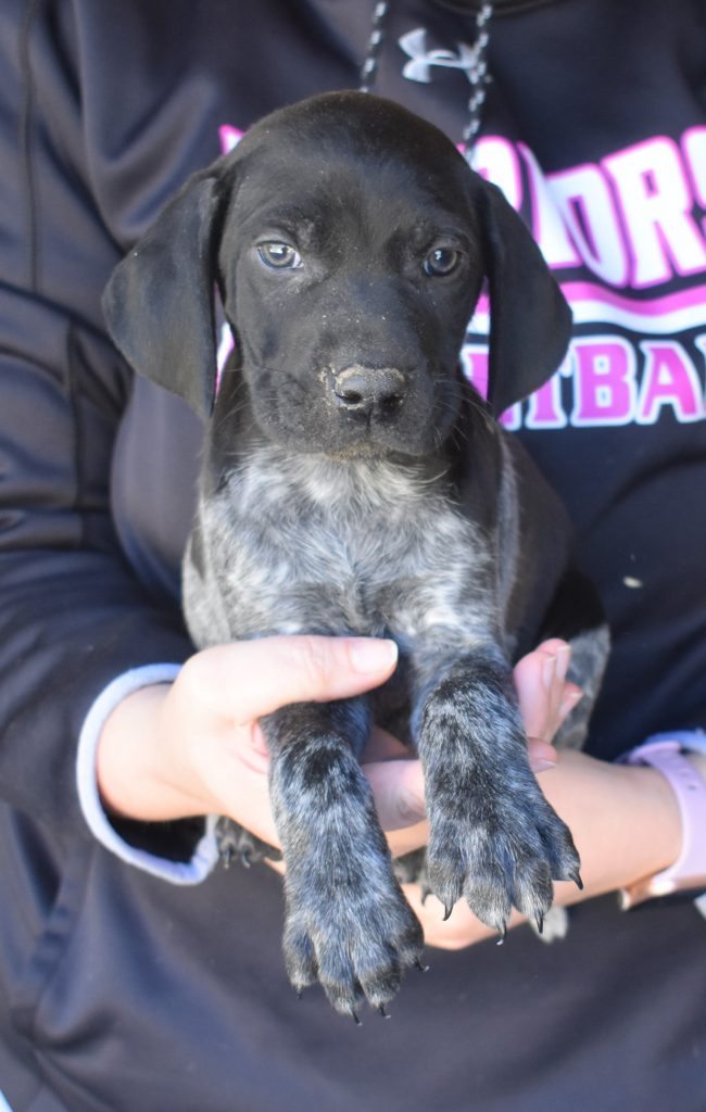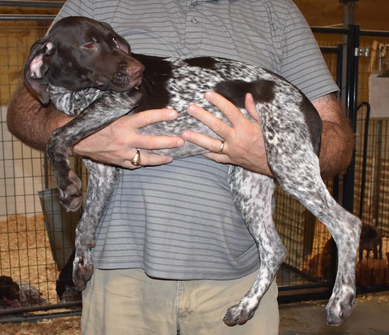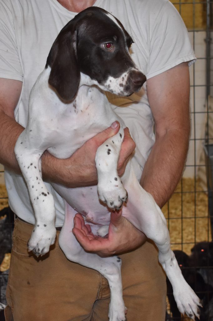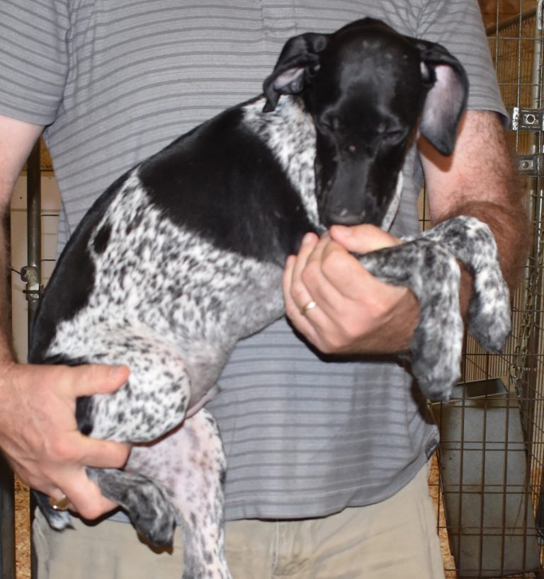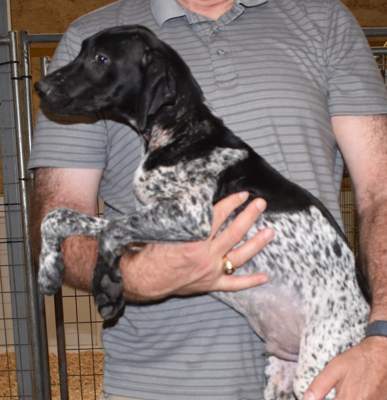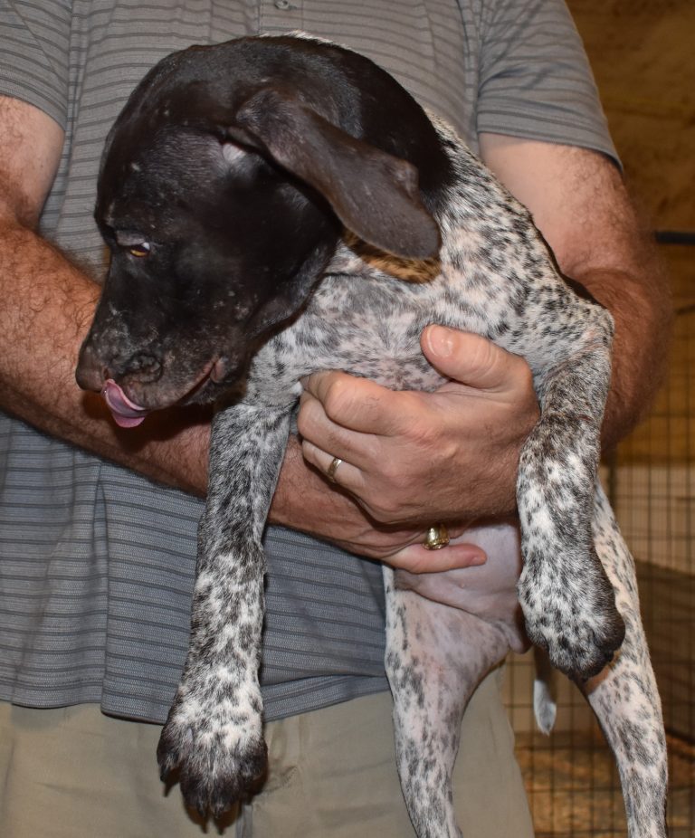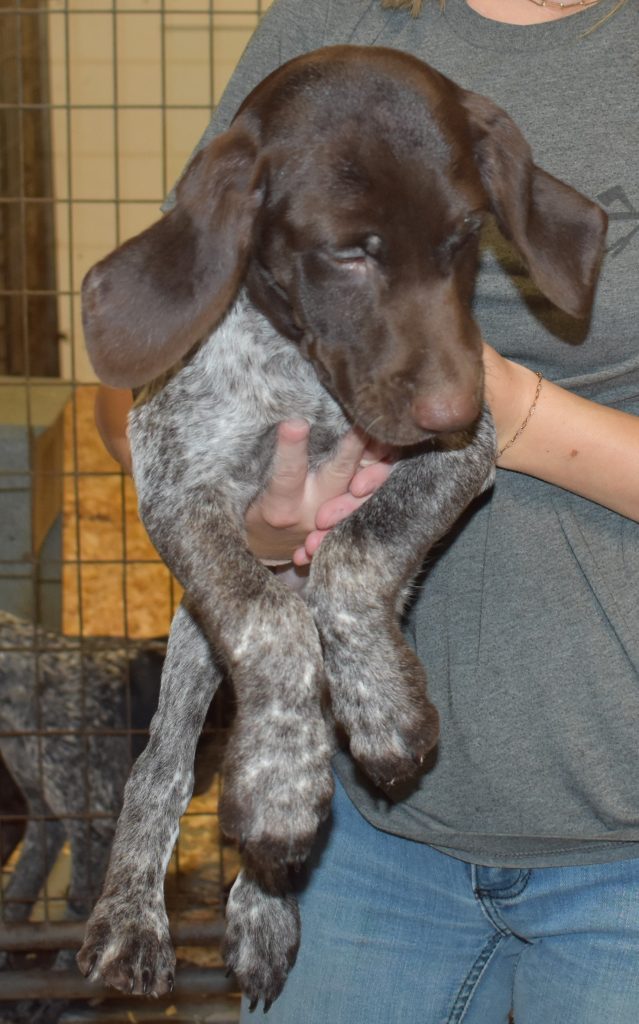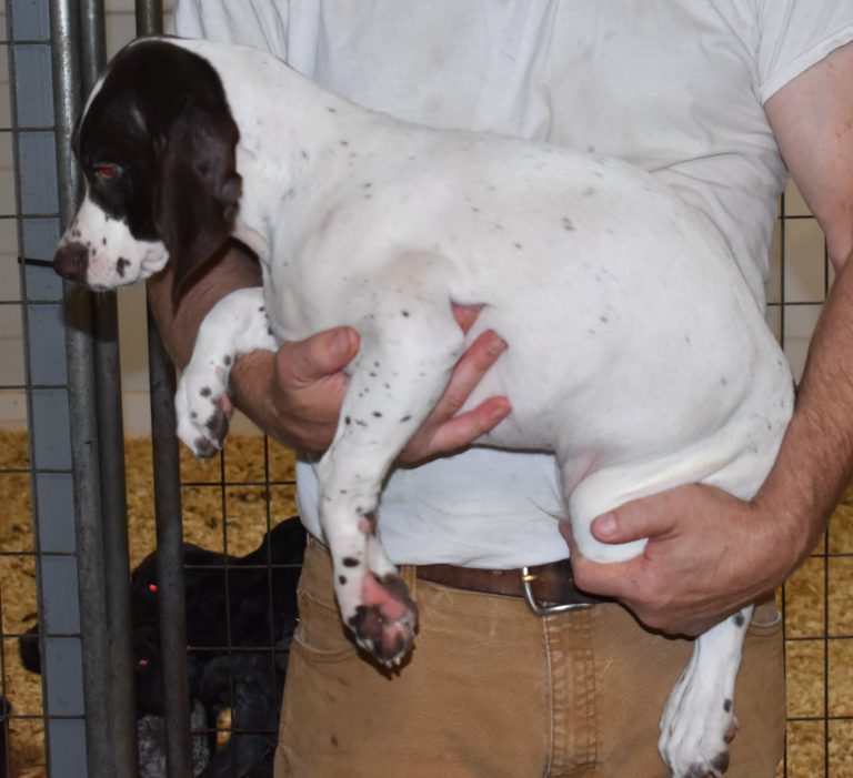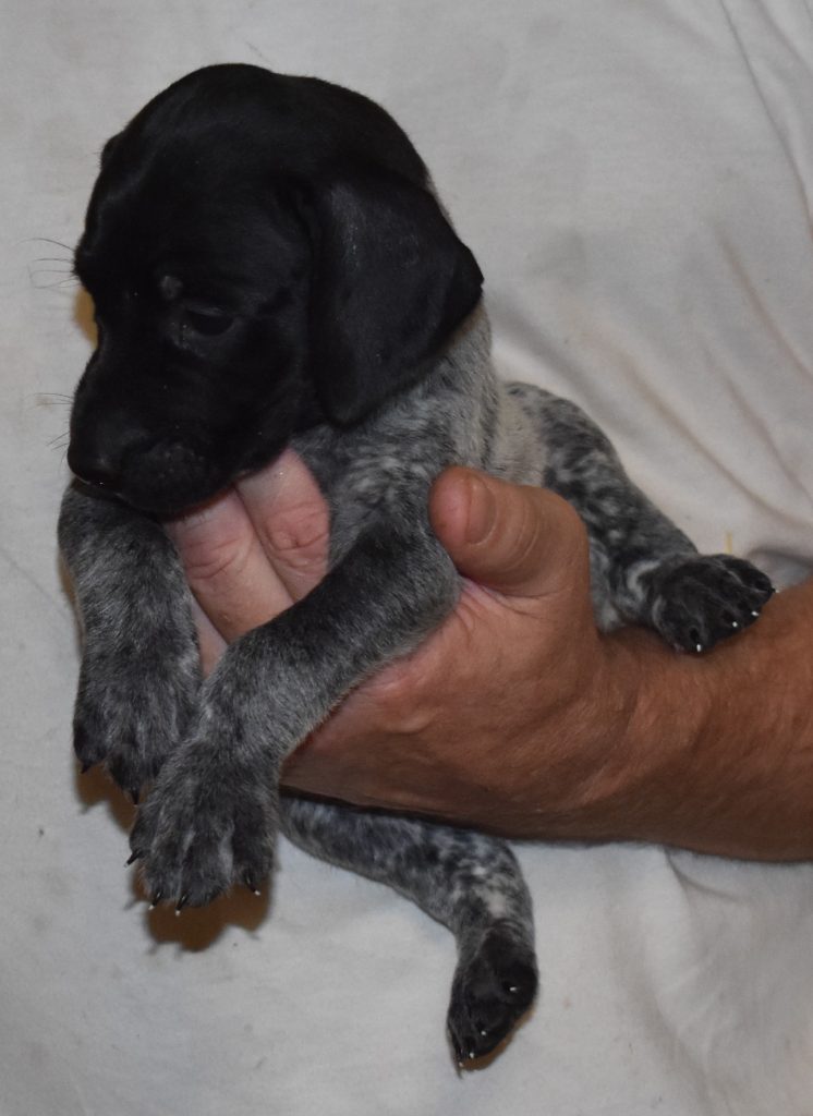A-Sis F2 is available. She is gorgeous from Sis and Atlas. The sire is a European import with the Deutsch Keuzar. The dam is from a long line of great GSPs. The dam’s dad is a top field trial dog in the country. These pups will be great companions and great in the field. The pup’s body is going to become more black ticked as she grows. She is a great looking pup with a mostly black head. She is beautiful. Becky chose this striking pup that will turn into a strikingly beautiful adult. Great choice.