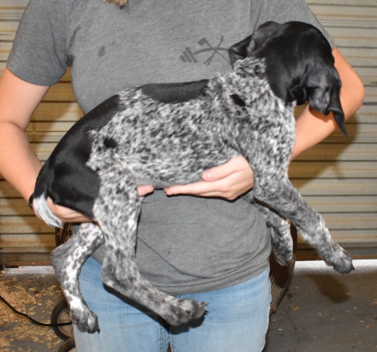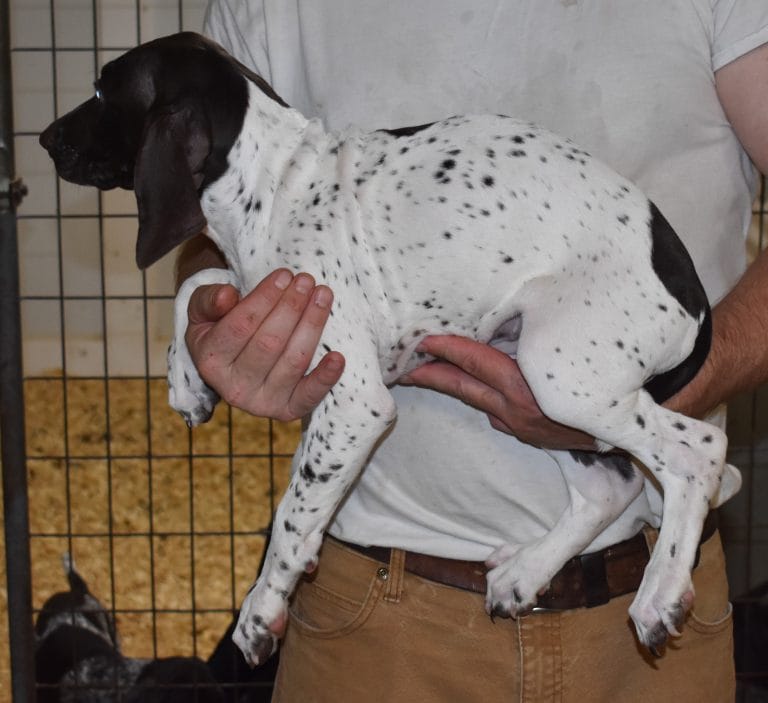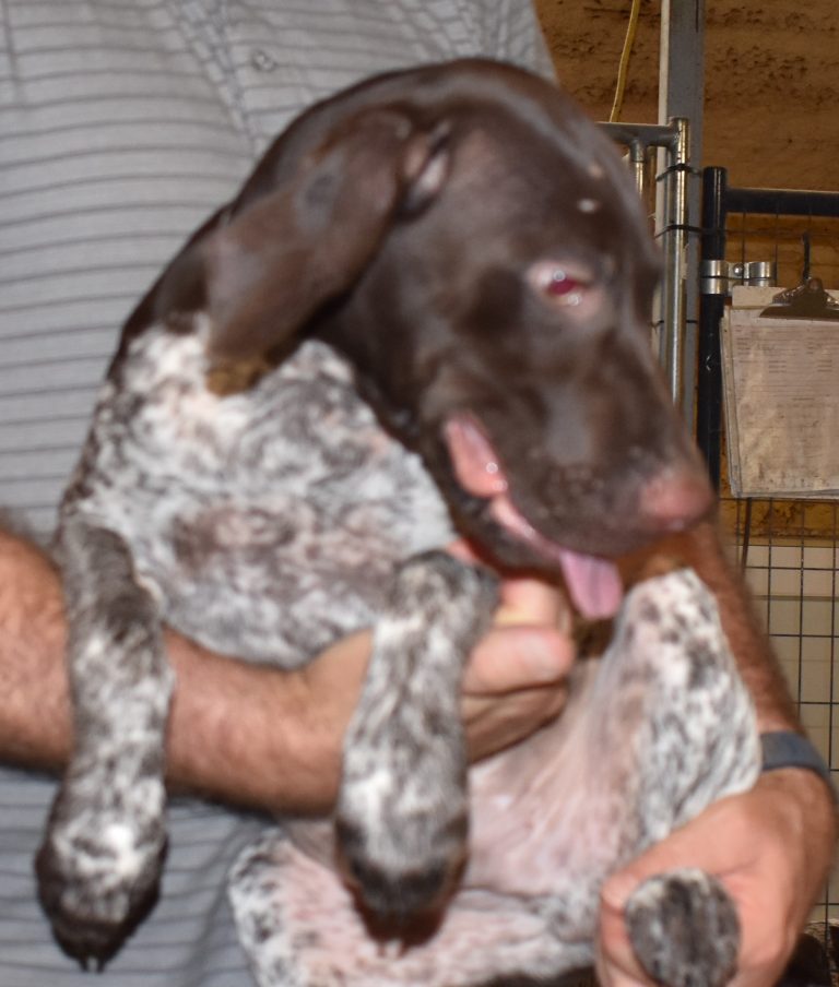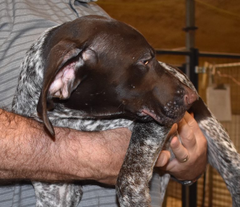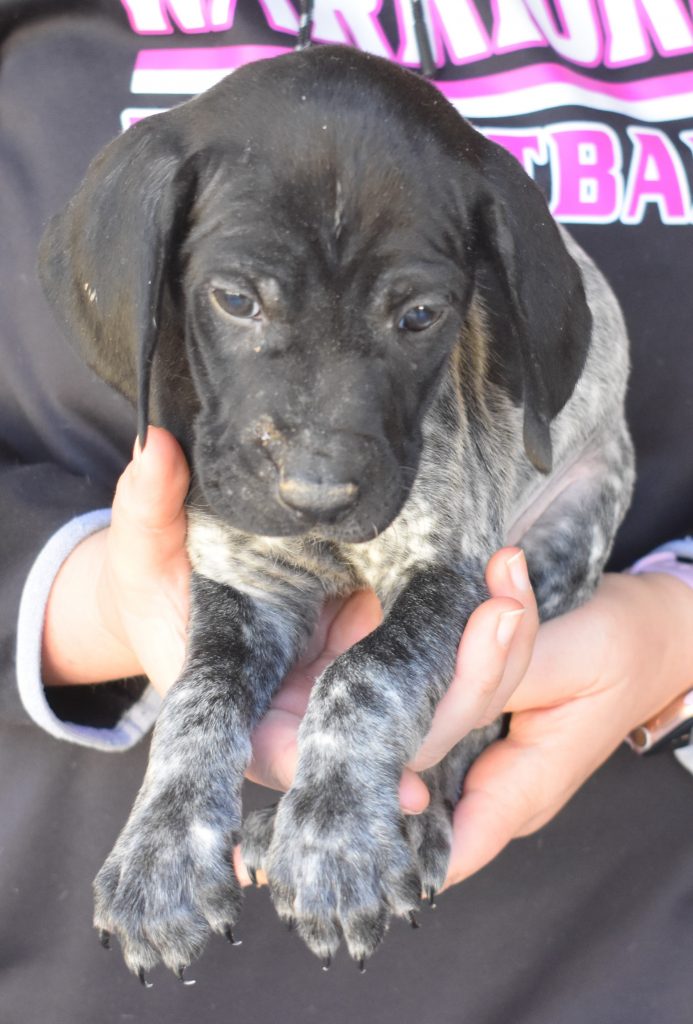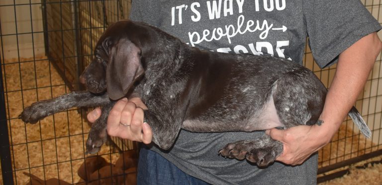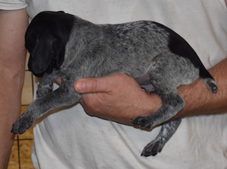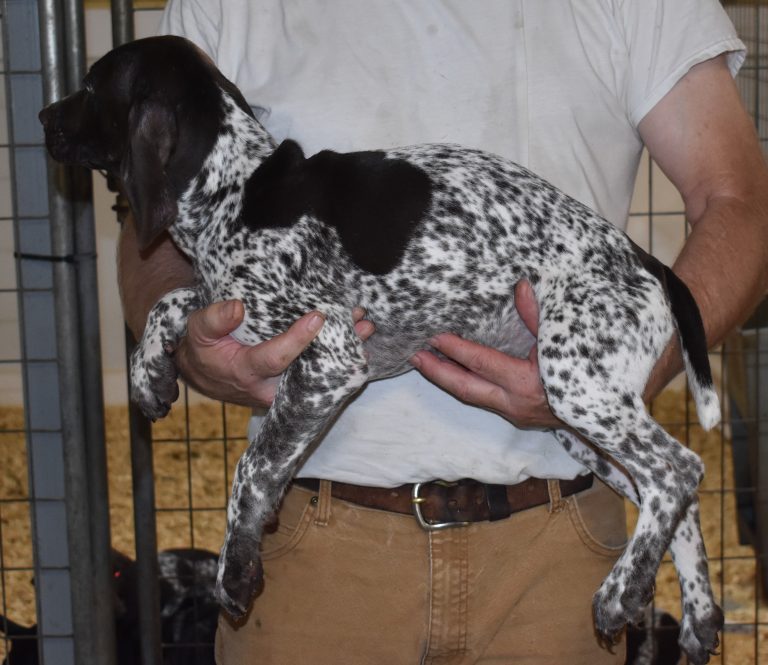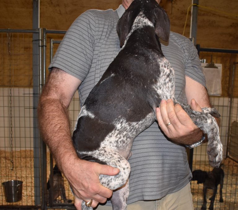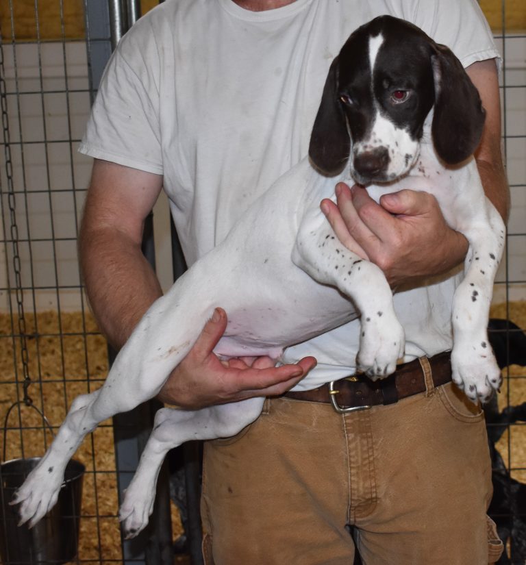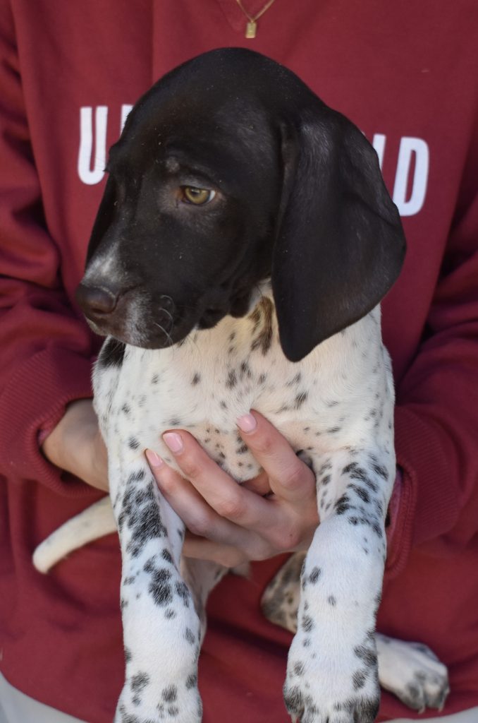 A-Sis F2 is available. She is gorgeous from Sis and Atlas. The sire is a European import with the Deutsch Keuzar. The dam is from a long line of great GSPs. The dam’s dad is a top field trial dog in the country. These pups will be great companions and great in the field. The pup’s body is going to become more black ticked as she grows. She is a great looking pup with a mostly black head. She is beautiful. Becky chose this striking pup that will turn into a strikingly beautiful adult. Great choice.