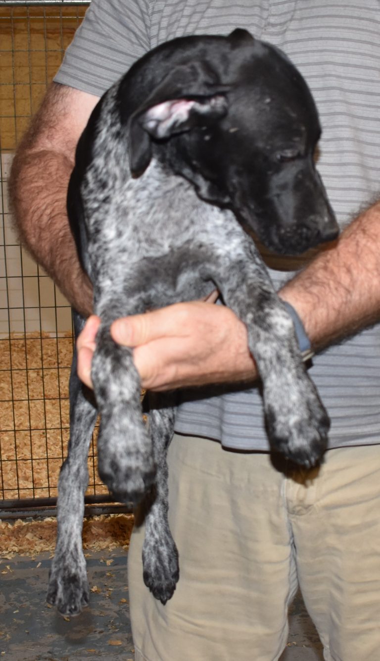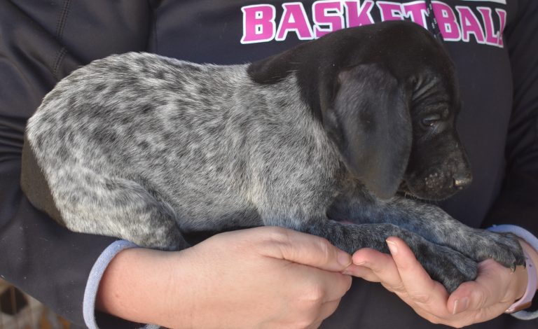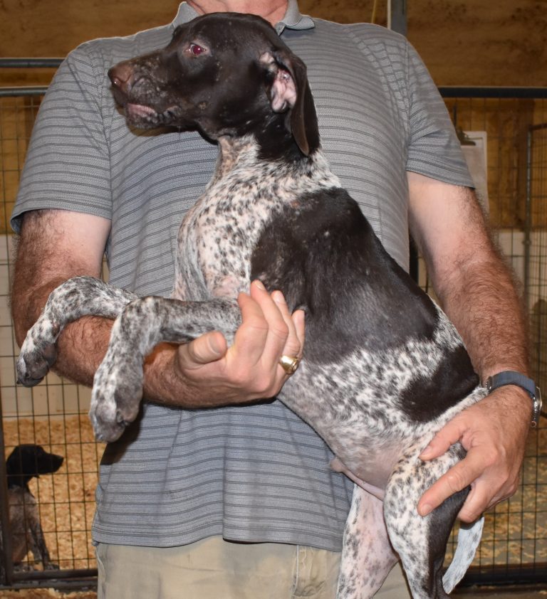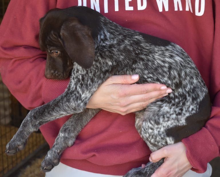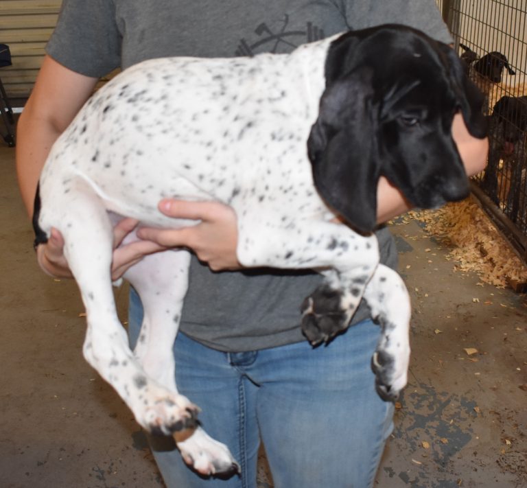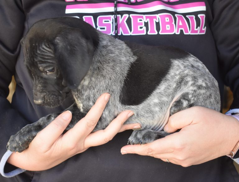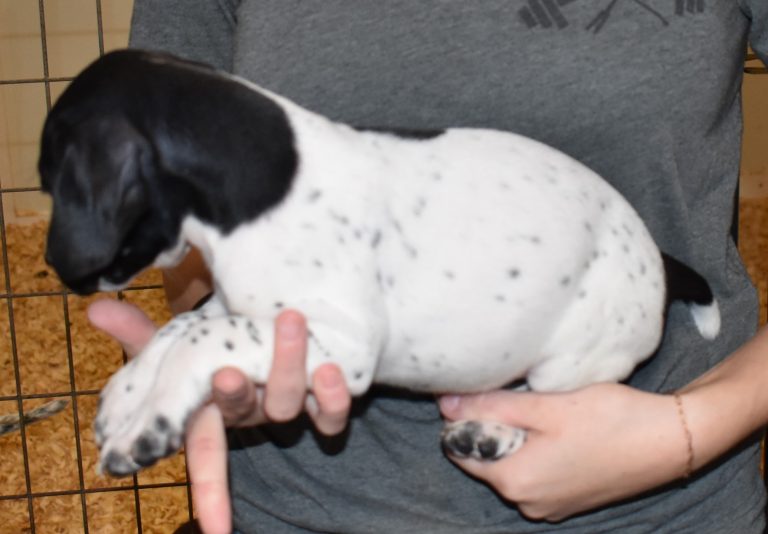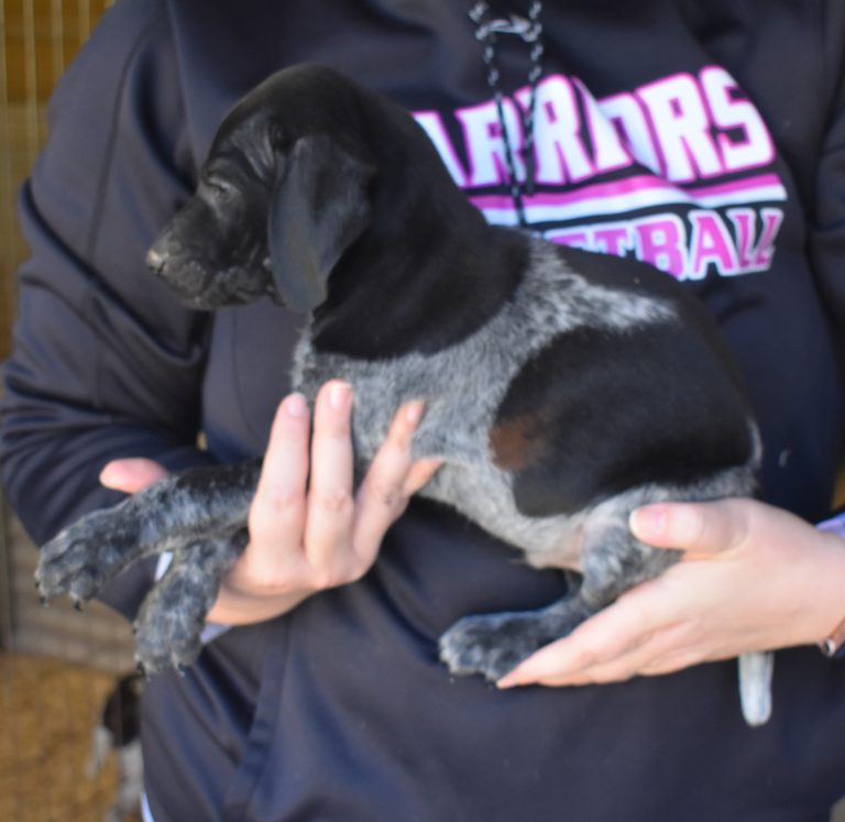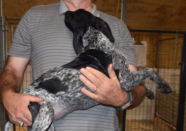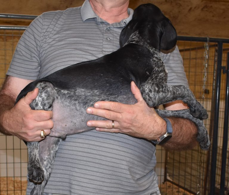A-Sis F2 is available. She is gorgeous from Sis and Atlas. The sire is a European import with the Deutsch Keuzar. The dam is from a long line of great GSPs. The dam’s dad is a top field trial dog in the country. These pups will be great companions and great in the field. The pup’s body is going to become more black ticked as she grows. She is a great looking pup with a mostly black head. She is beautiful. Becky chose this striking pup that will turn into a strikingly beautiful adult. Great choice.