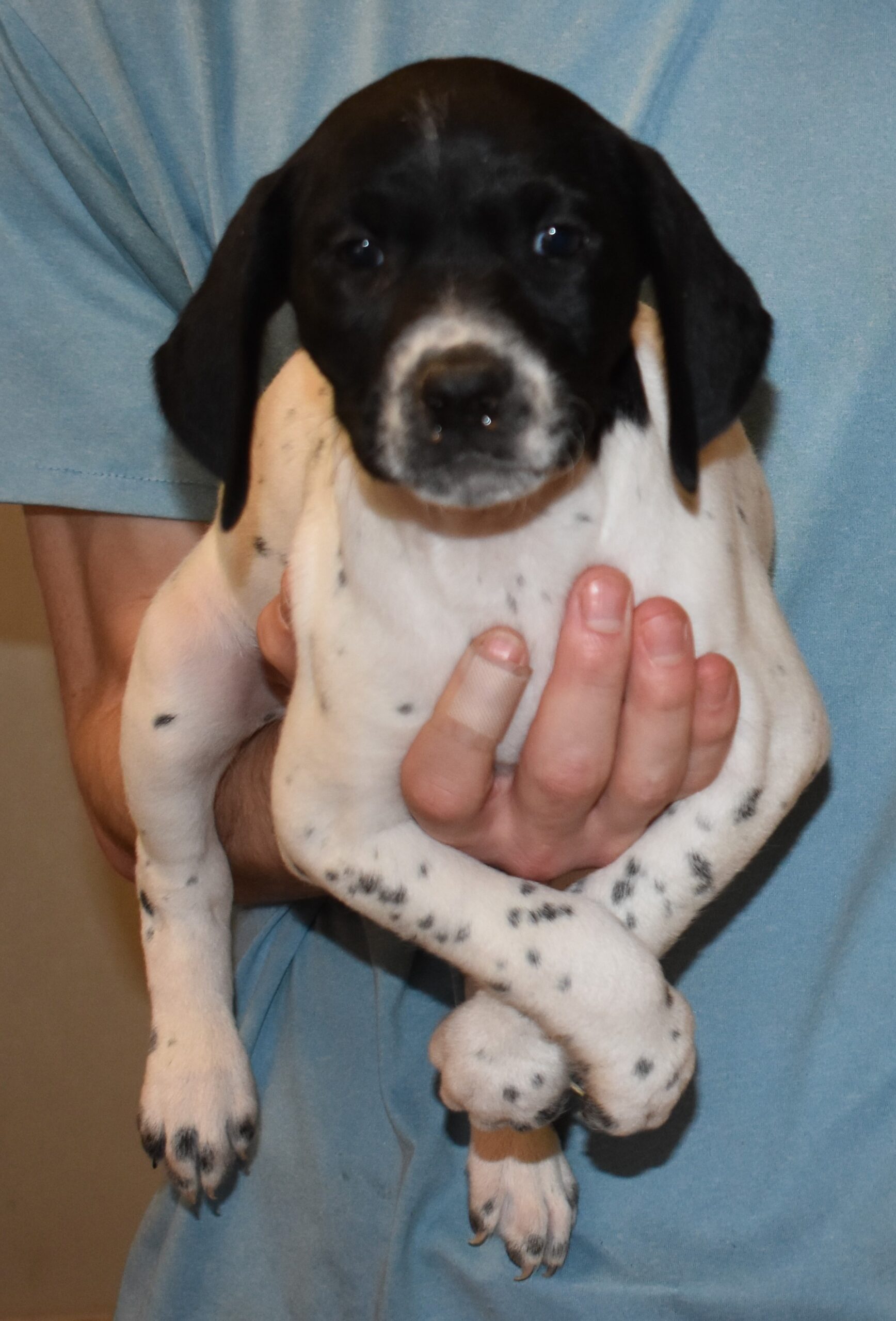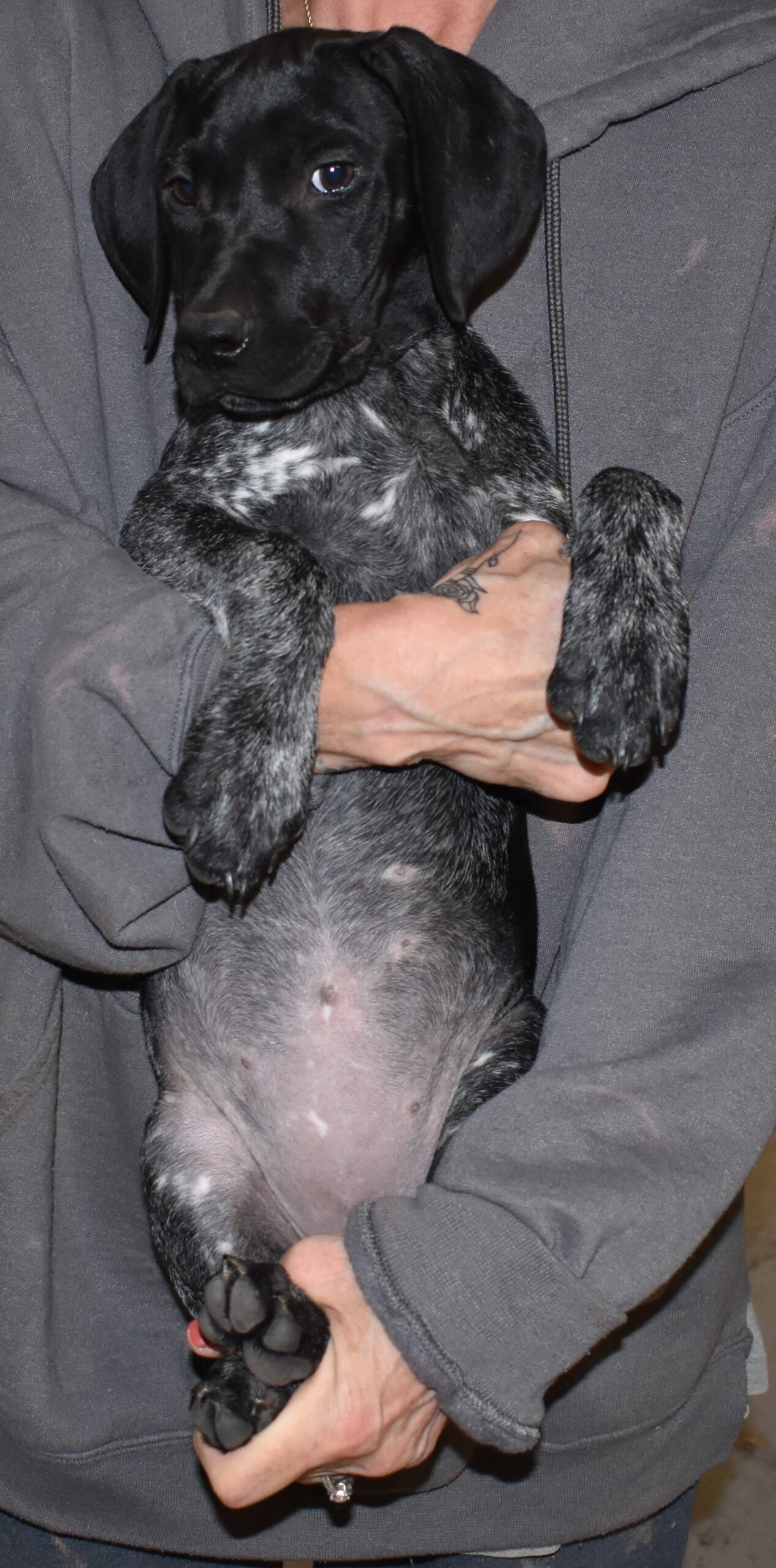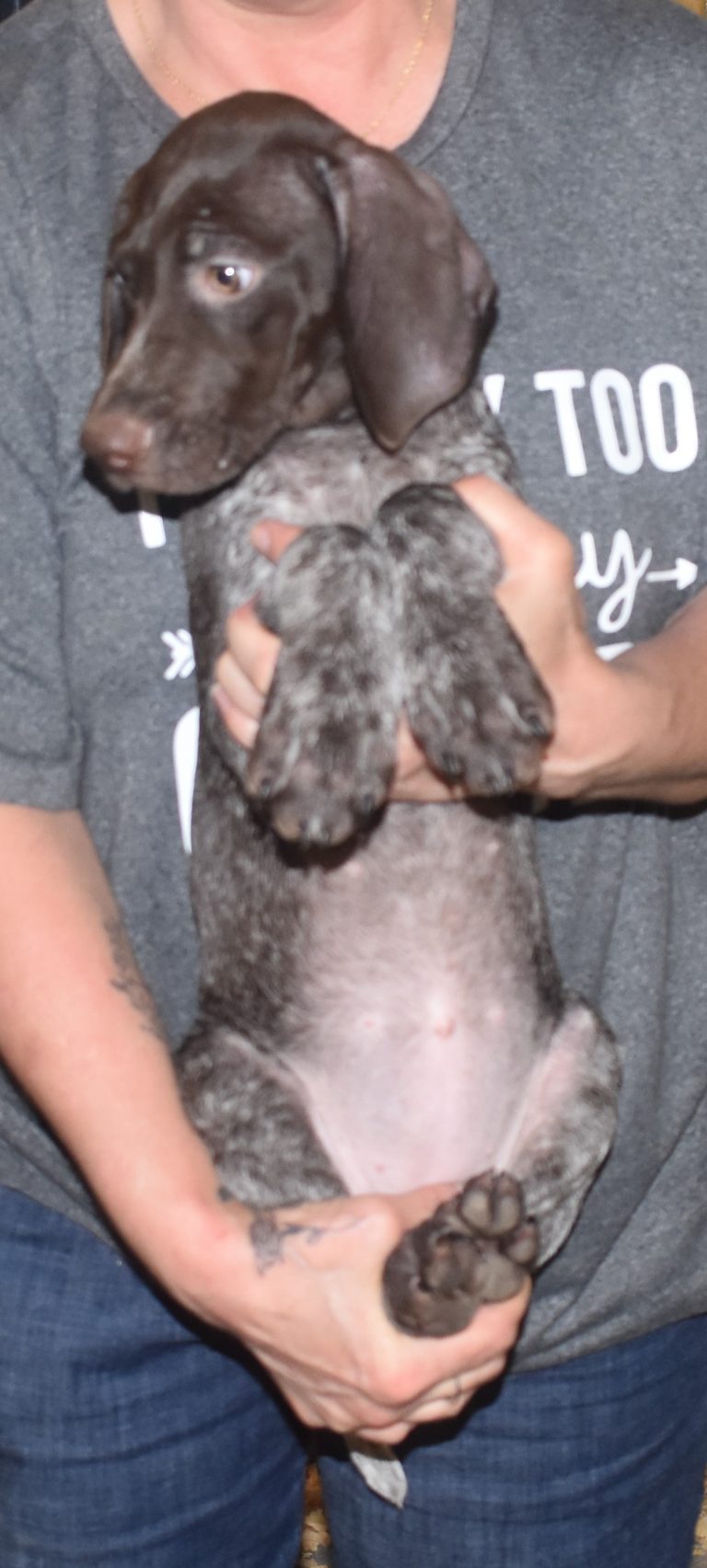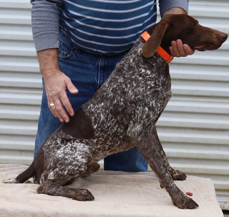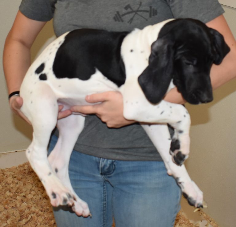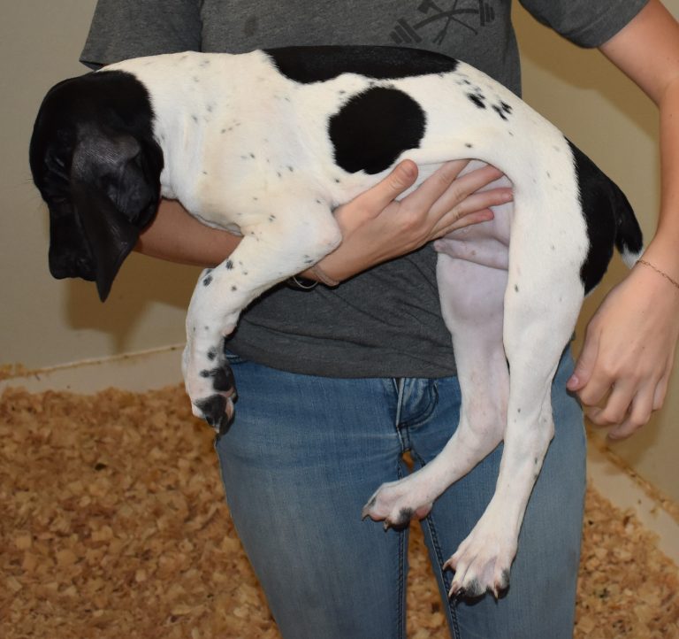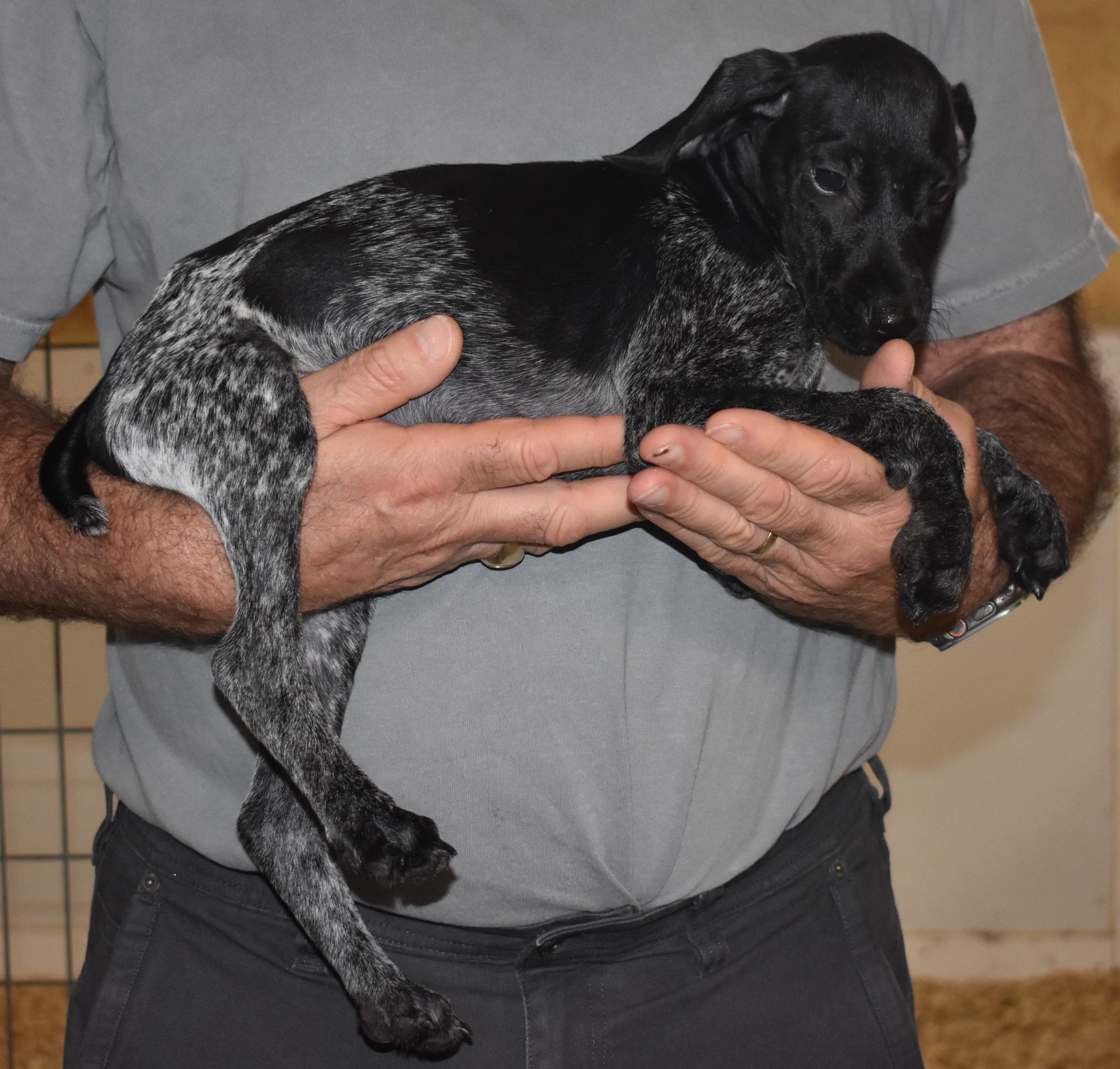 A-Sis F2 is available. She is gorgeous from Sis and Atlas. The sire is a European import with the Deutsch Keuzar. The dam is from a long line of great GSPs. The dam’s dad is a top field trial dog in the country. These pups will be great companions and great in the field. The pup’s body is going to become more black ticked as she grows. She is a great looking pup with a mostly black head. She is beautiful. Becky chose this striking pup that will turn into a strikingly beautiful adult. Great choice.