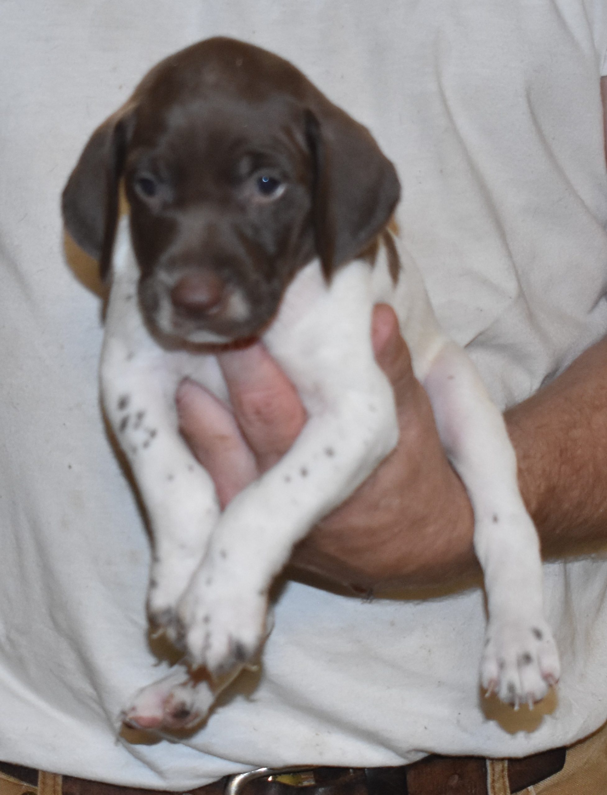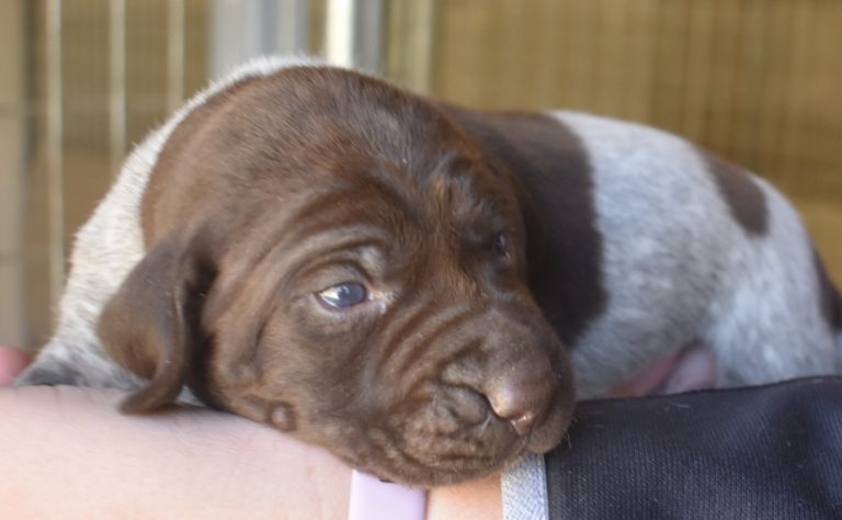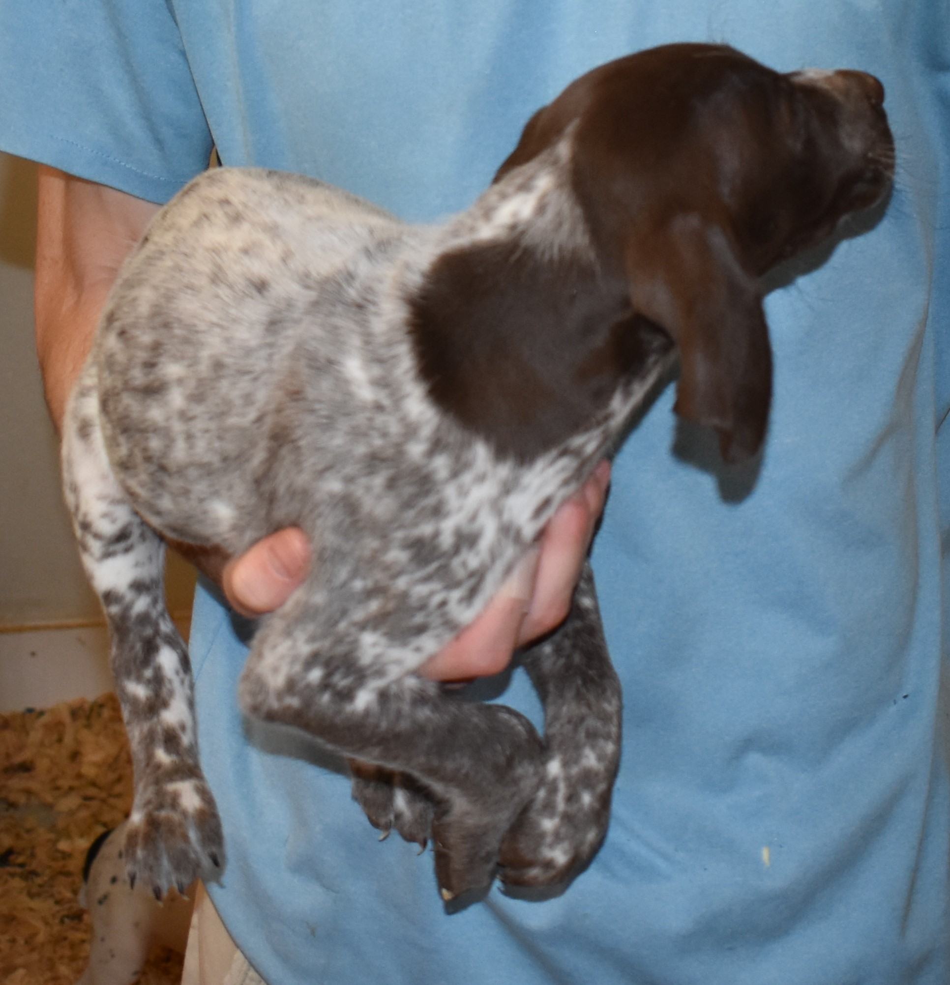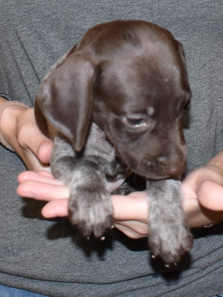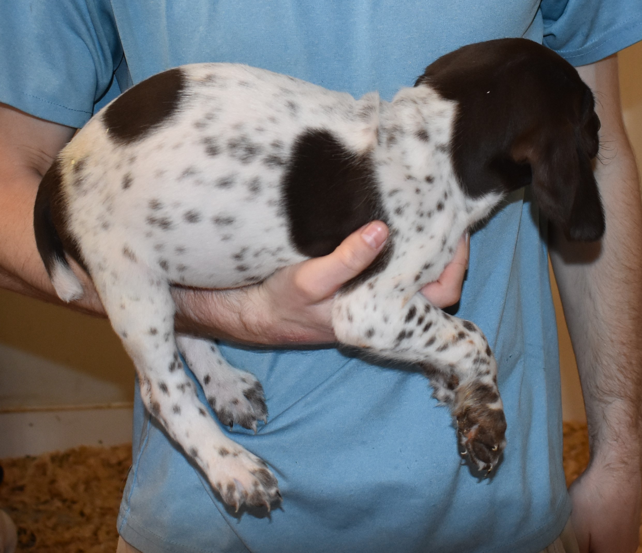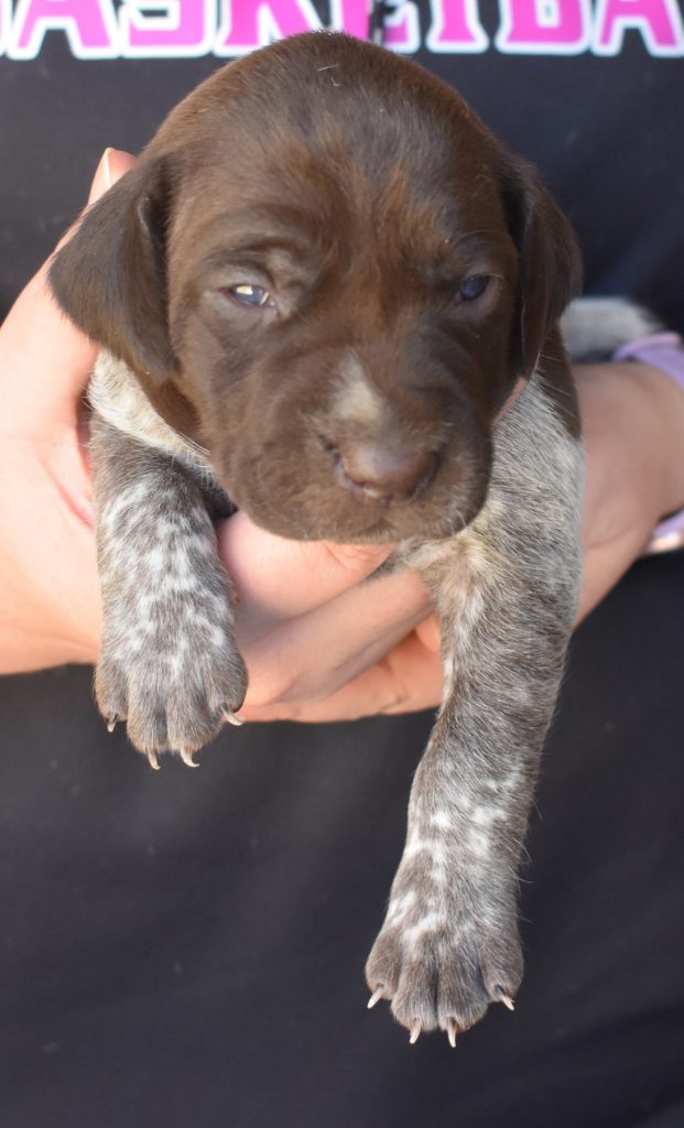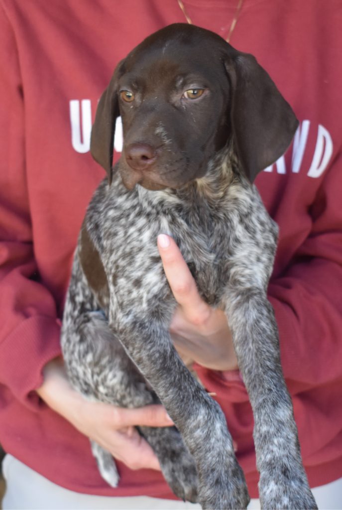 We have B-Atlas M2, a striking liver roan male GSP pup from Bailey and Atlas. As he grows, his white will develop into a roan/patched pattern. Bailey, the dam, is from some of the best GSP genetics in the country and the sire, Atlas, is a European import with a Deutsch Keuzar title. This litter will produce intelligent, beautiful companions and exceptional hunting dogs. Thanks to Cora for putting a deposit down to get this beautiful boy.