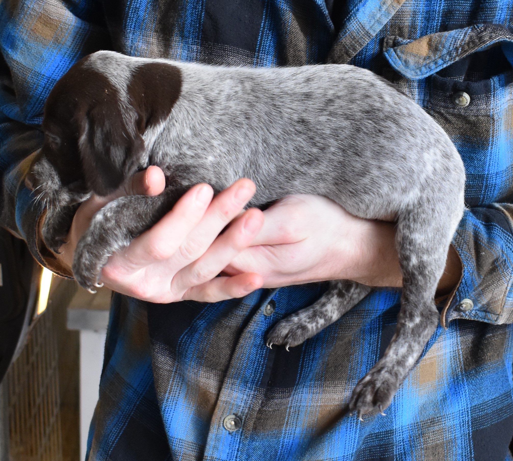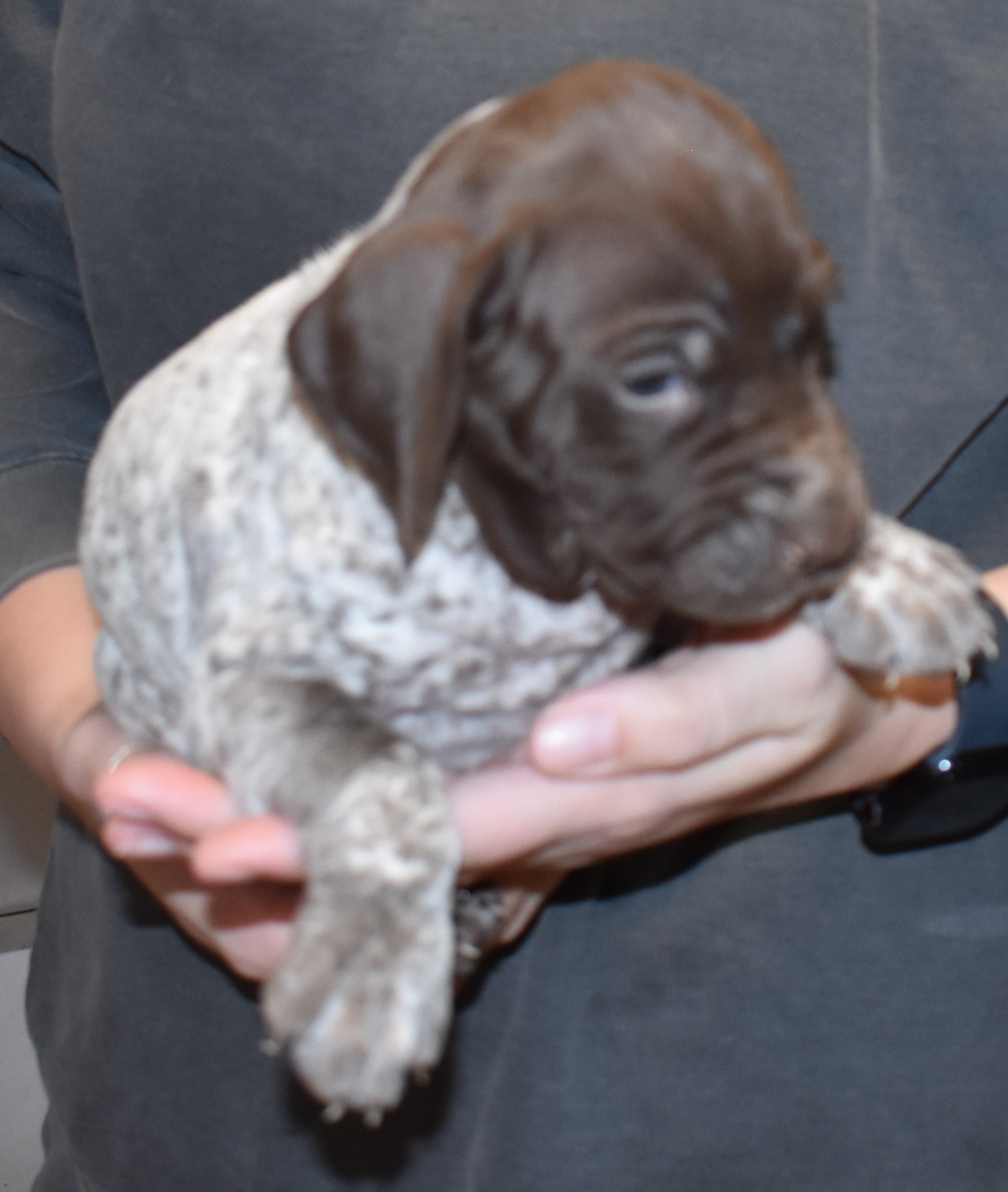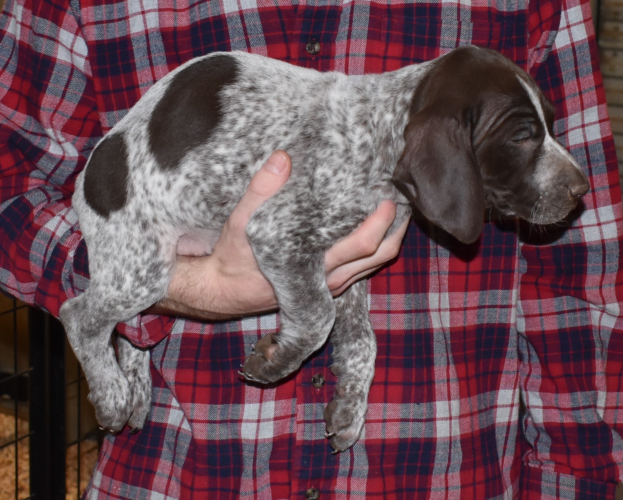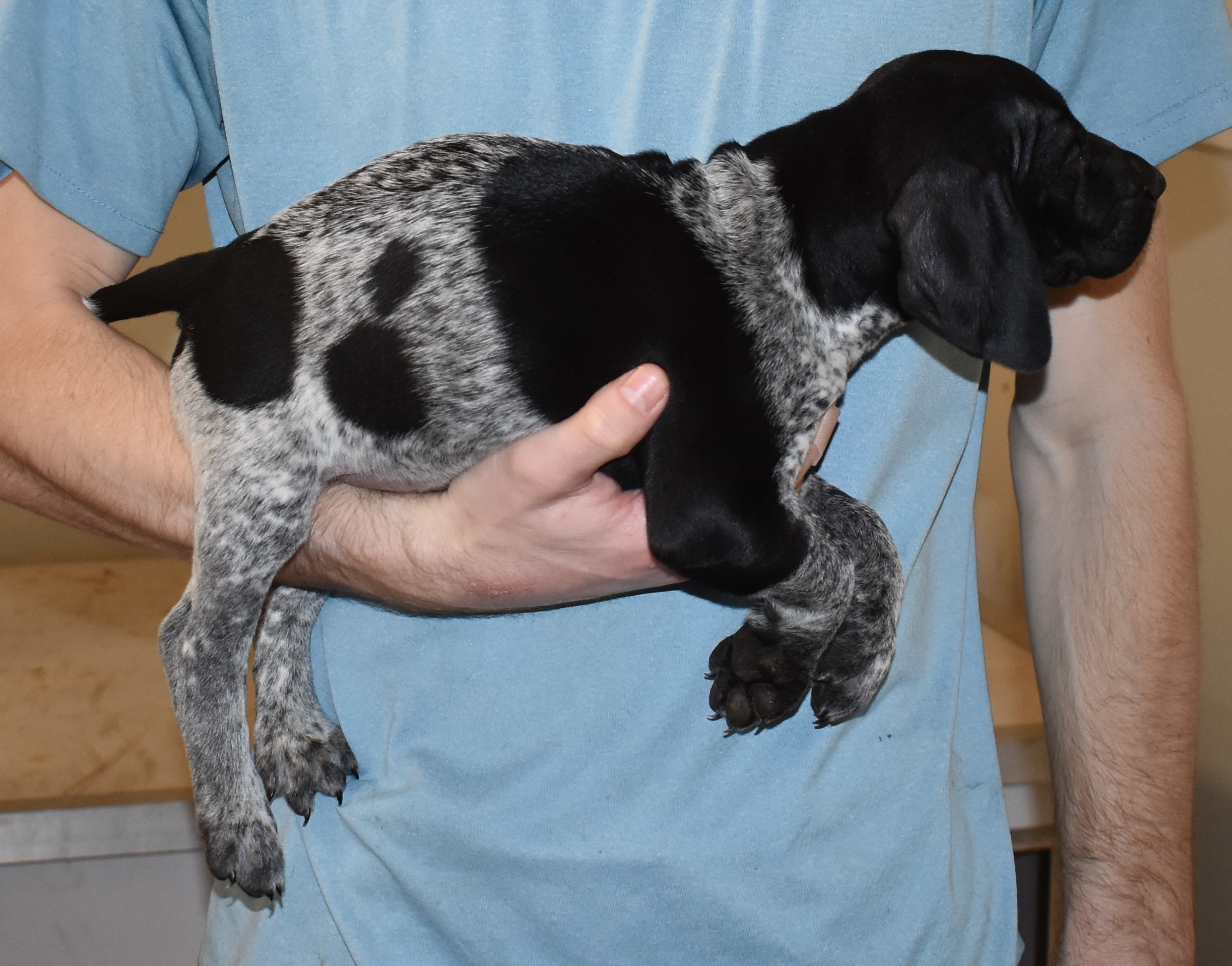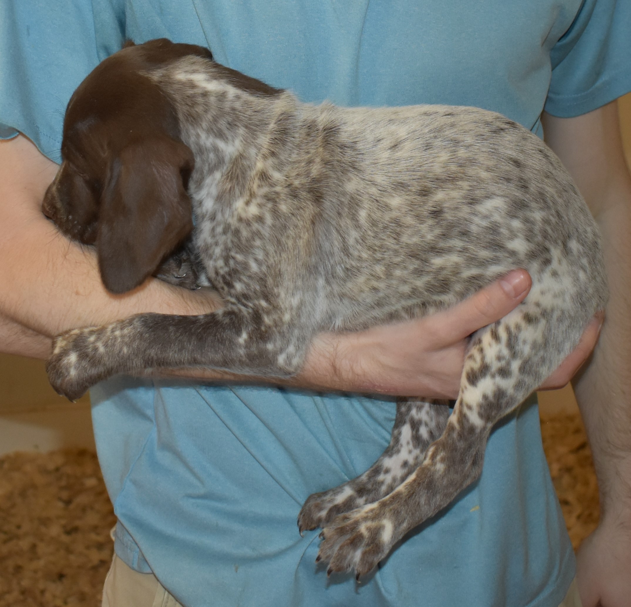We have B-Atlas M2, a striking liver roan male GSP pup from Bailey and Atlas. As he grows, his white will develop into a roan/patched pattern. Bailey, the dam, is from some of the best GSP genetics in the country and the sire, Atlas, is a European import with a Deutsch Keuzar title. This litter will produce intelligent, beautiful companions and exceptional hunting dogs. Thanks to Cora for putting a deposit down to get this beautiful boy.