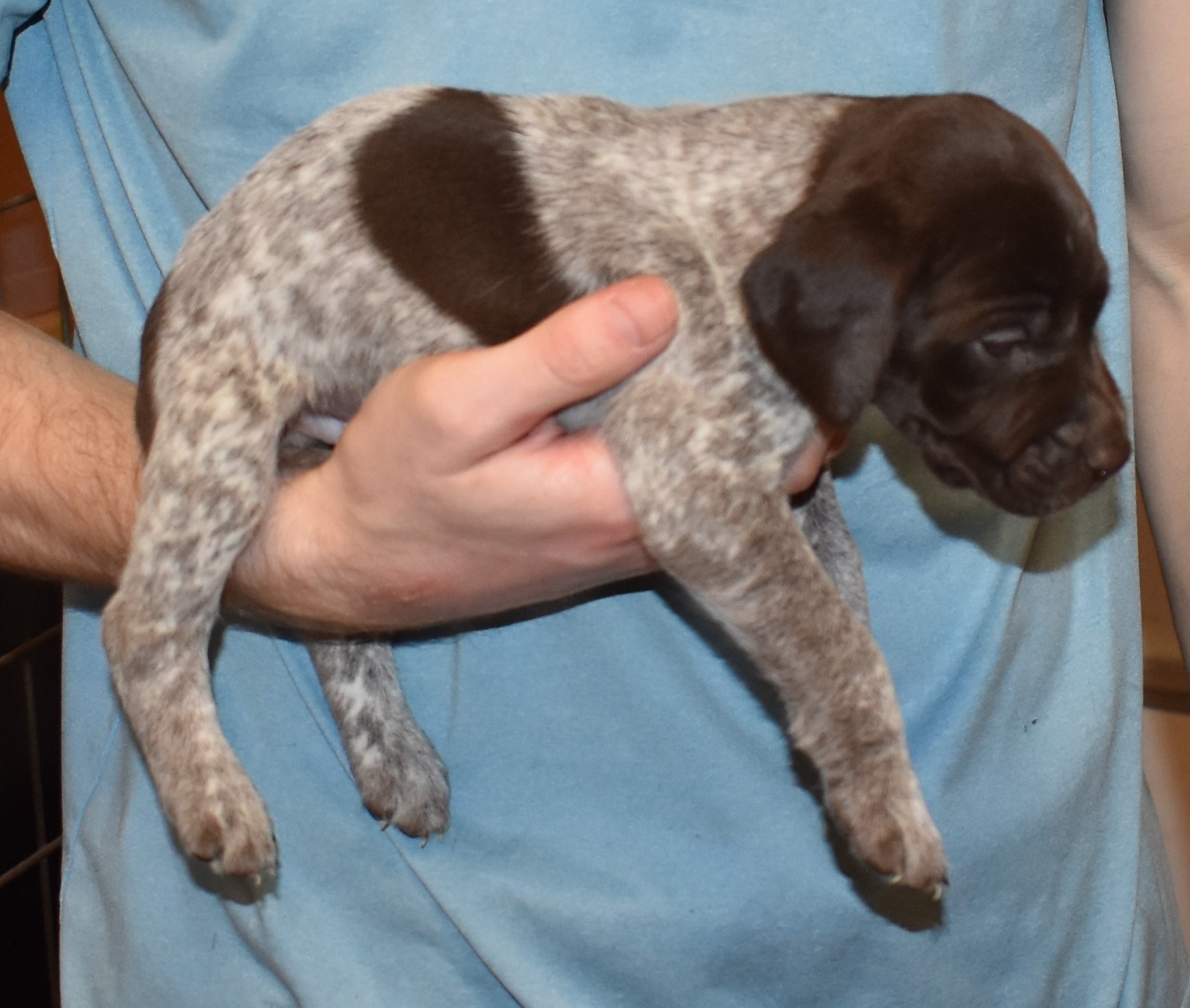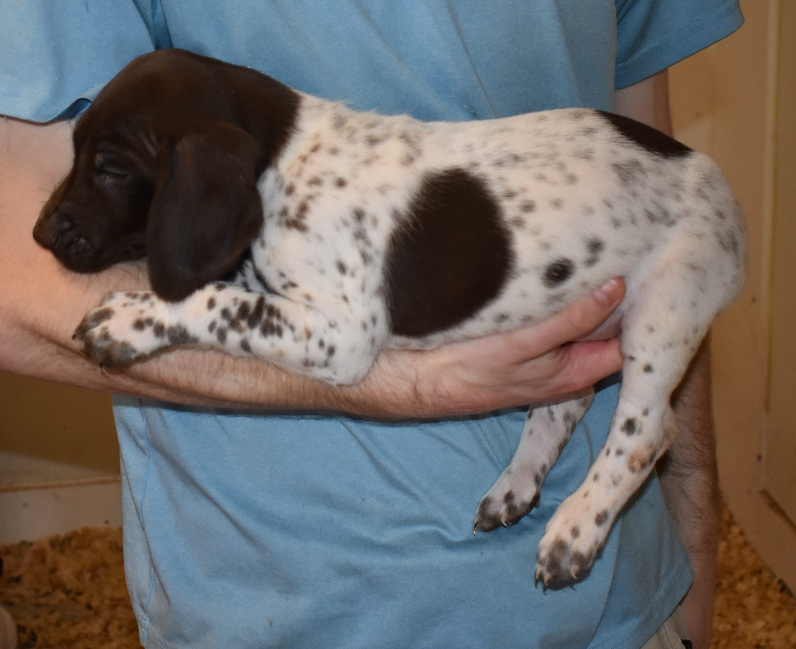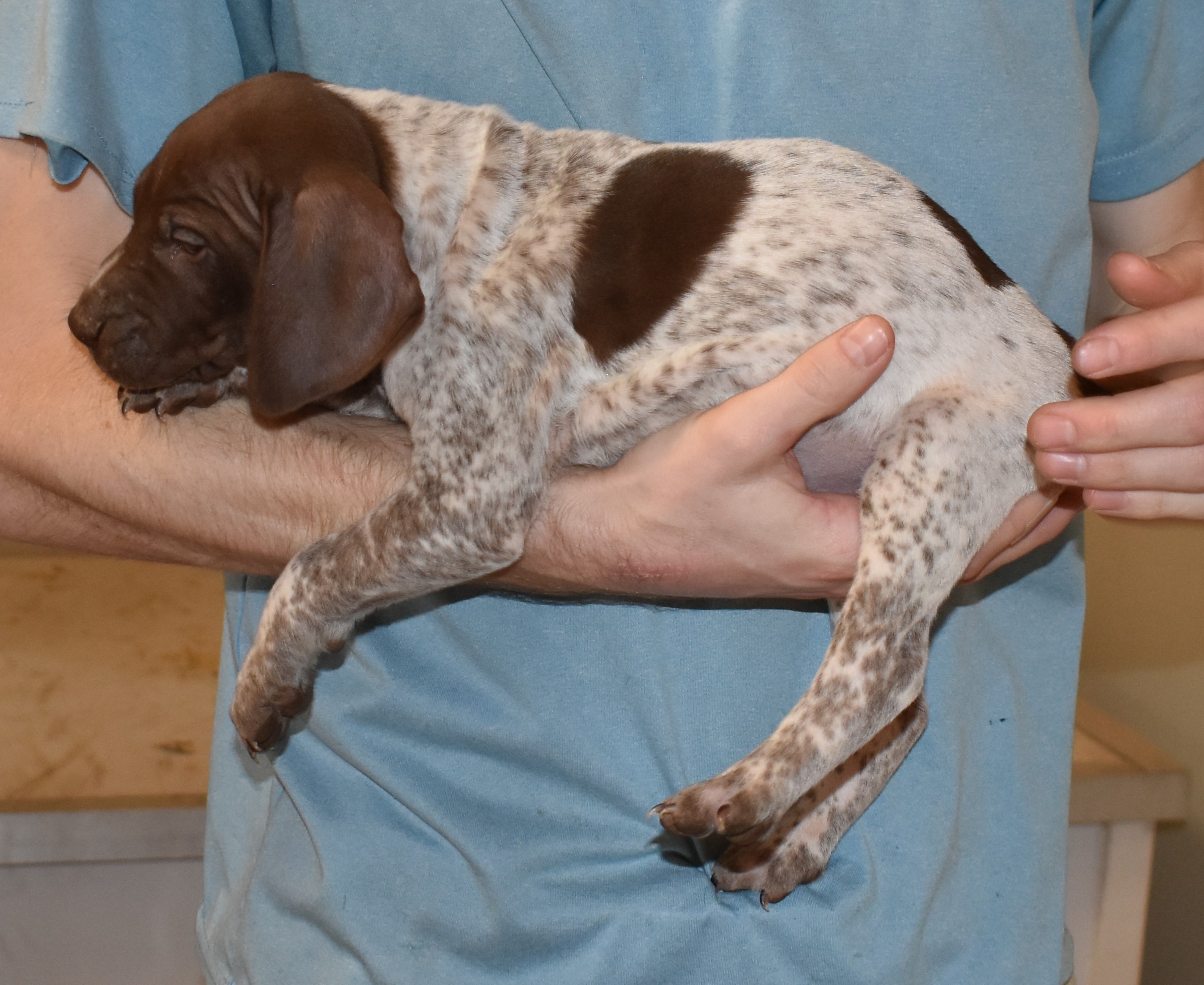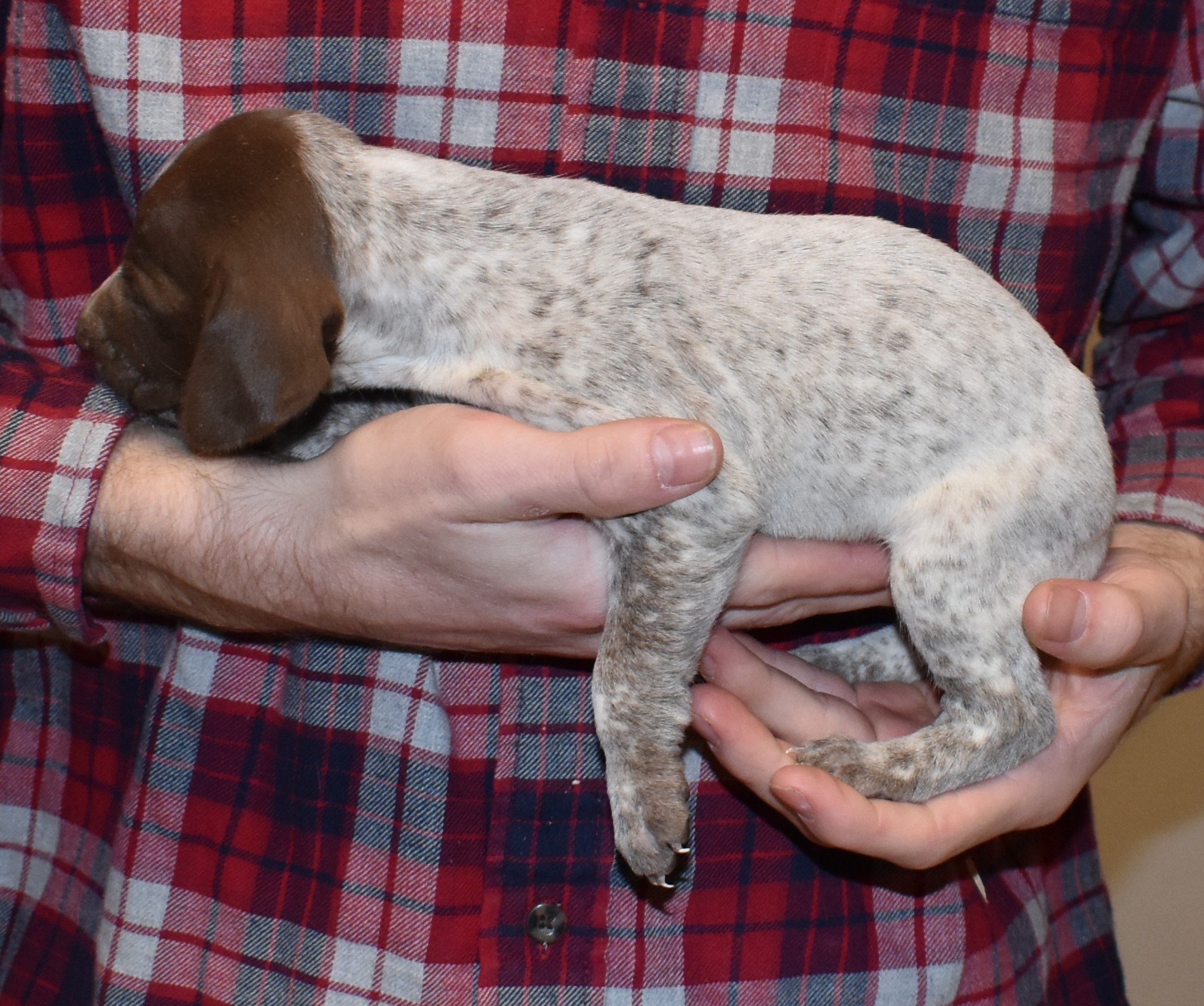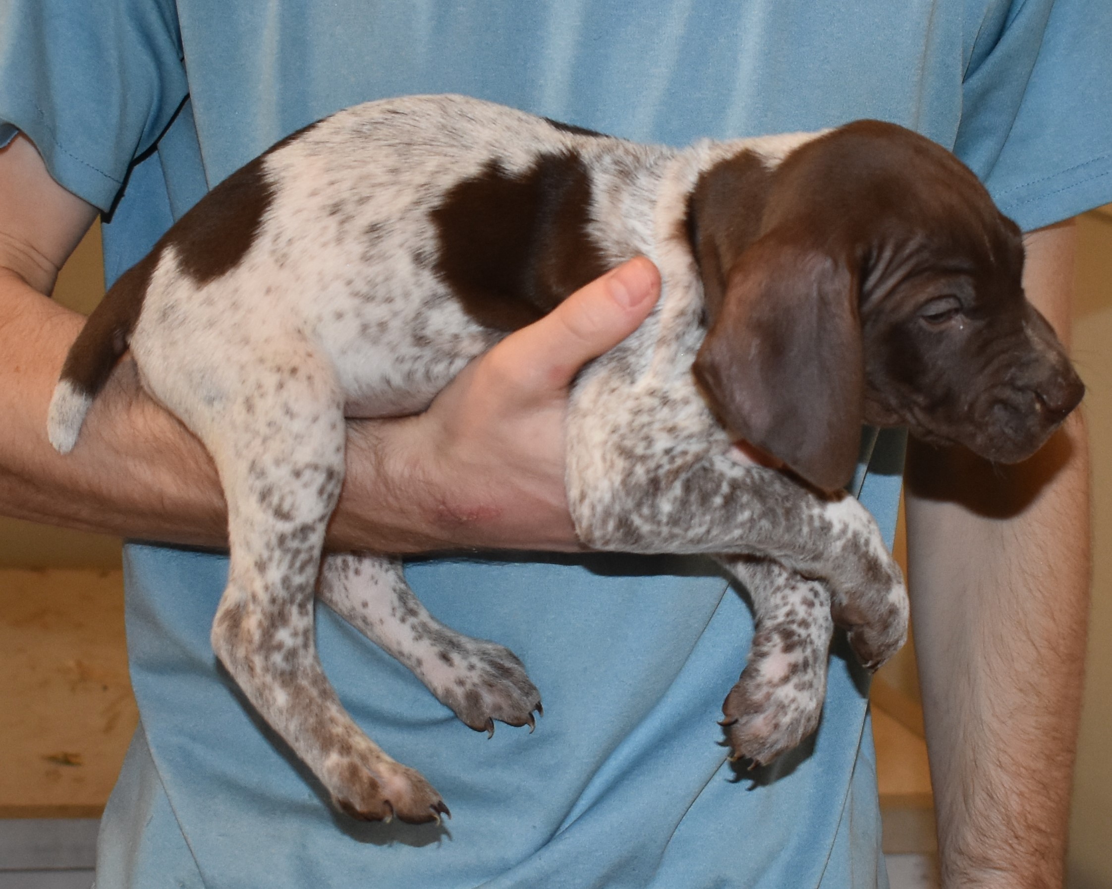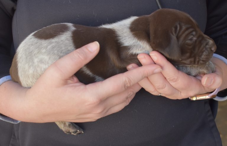 We have B-Atlas M2, a striking liver roan male GSP pup from Bailey and Atlas. As he grows, his white will develop into a roan/patched pattern. Bailey, the dam, is from some of the best GSP genetics in the country and the sire, Atlas, is a European import with a Deutsch Keuzar title. This litter will produce intelligent, beautiful companions and exceptional hunting dogs. Thanks to Cora for putting a deposit down to get this beautiful boy.