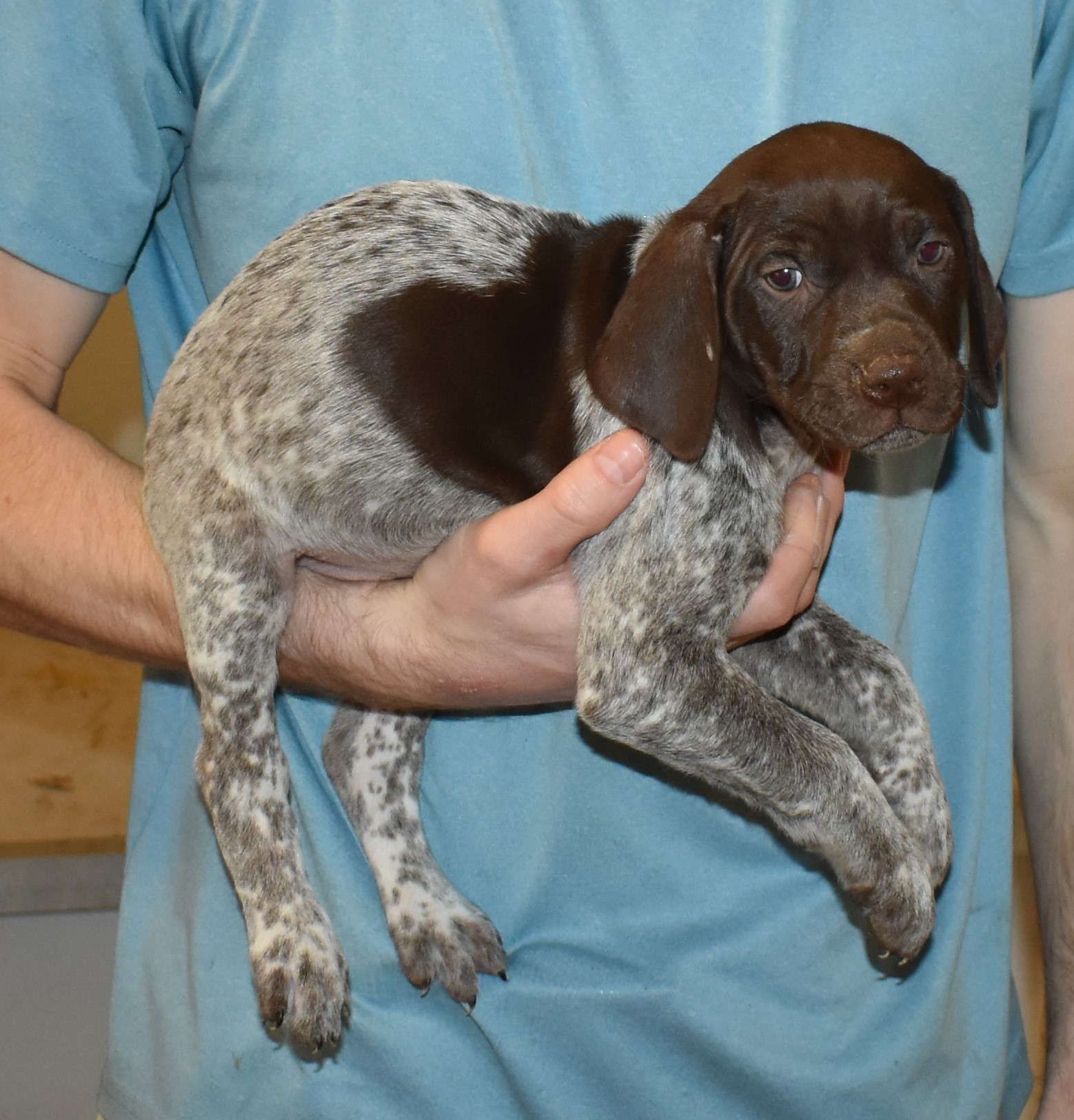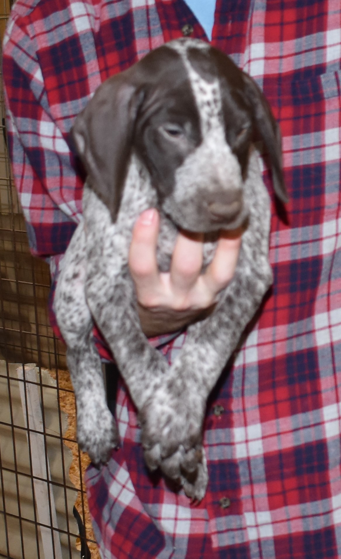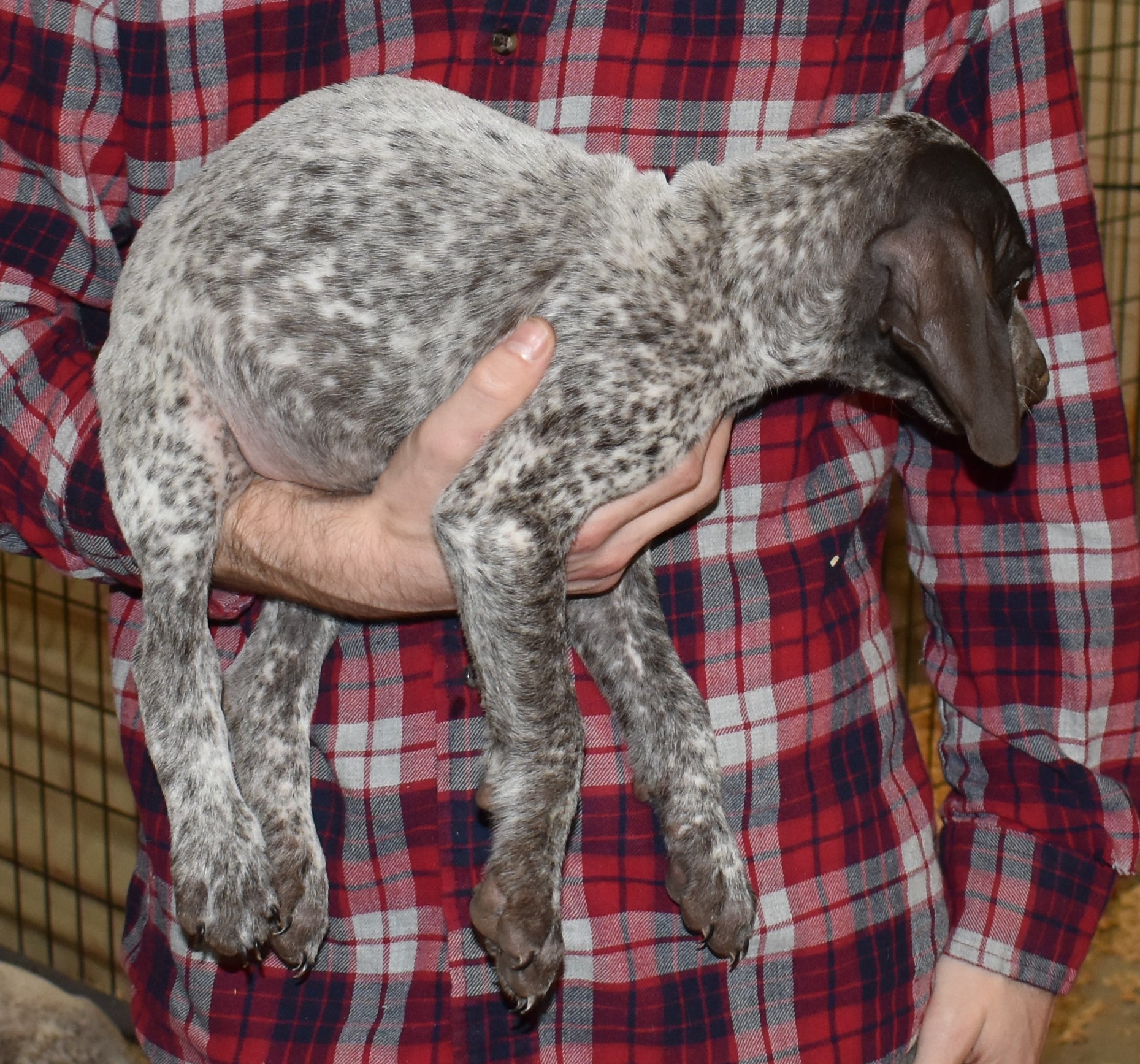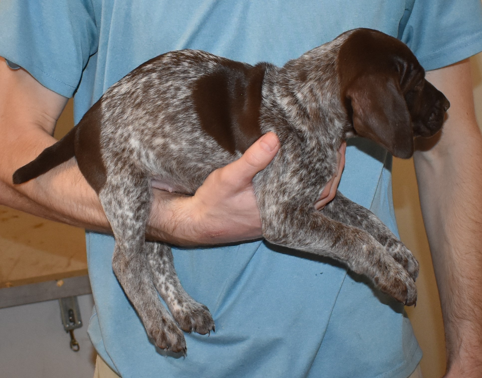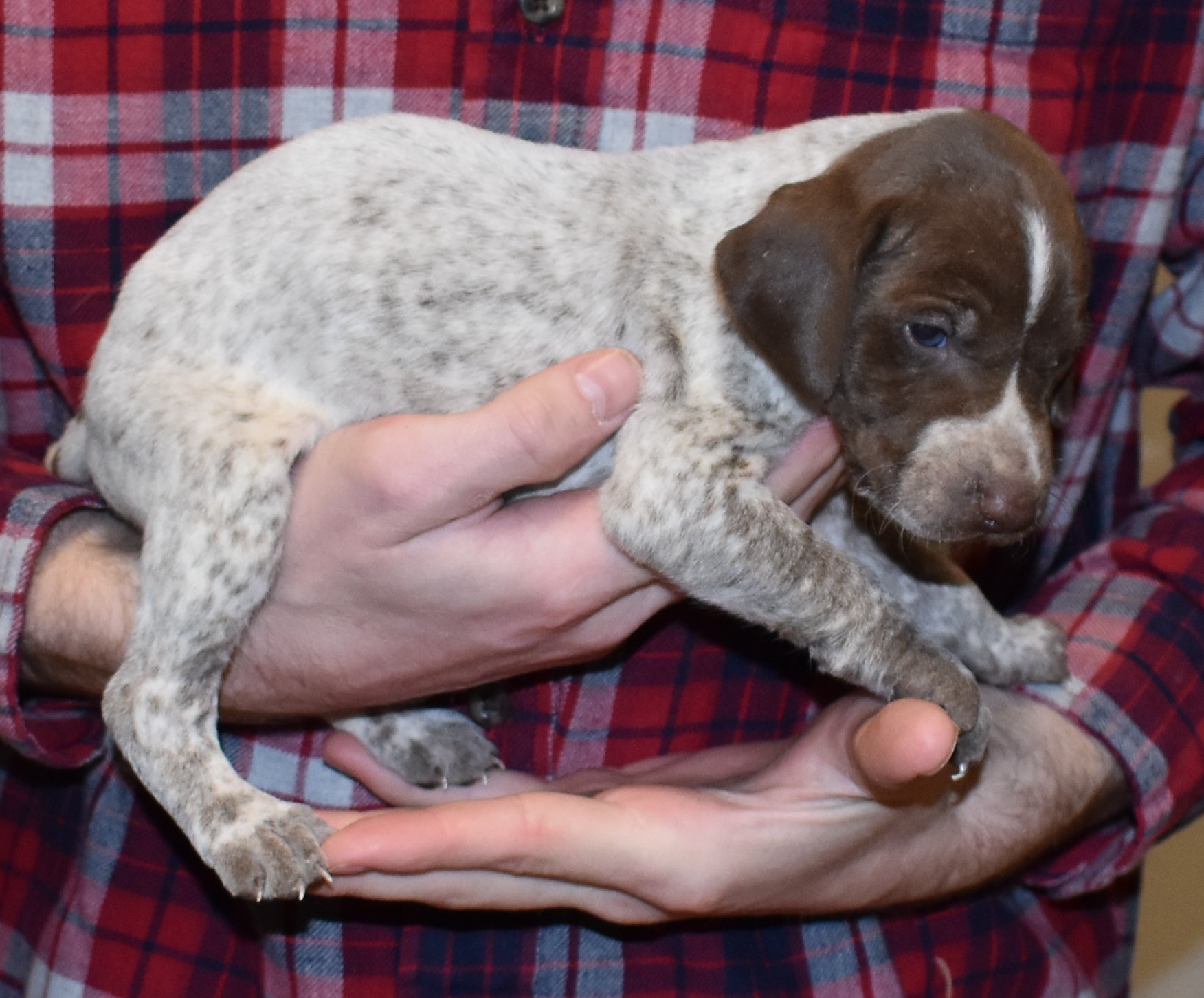 We have B-Atlas M2, a striking liver roan male GSP pup from Bailey and Atlas. As he grows, his white will develop into a roan/patched pattern. Bailey, the dam, is from some of the best GSP genetics in the country and the sire, Atlas, is a European import with a Deutsch Keuzar title. This litter will produce intelligent, beautiful companions and exceptional hunting dogs. Thanks to Cora for putting a deposit down to get this beautiful boy.