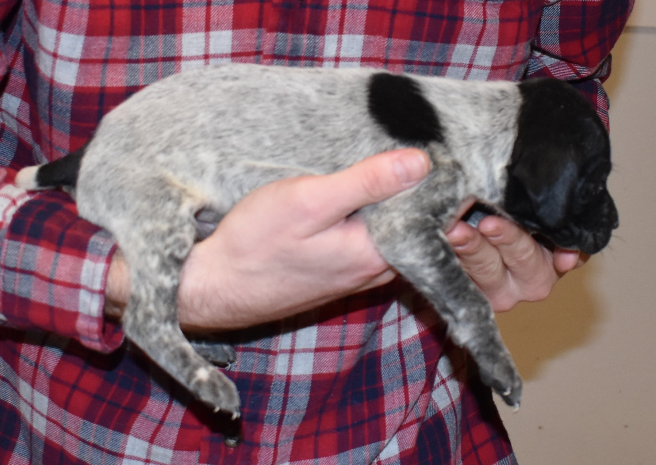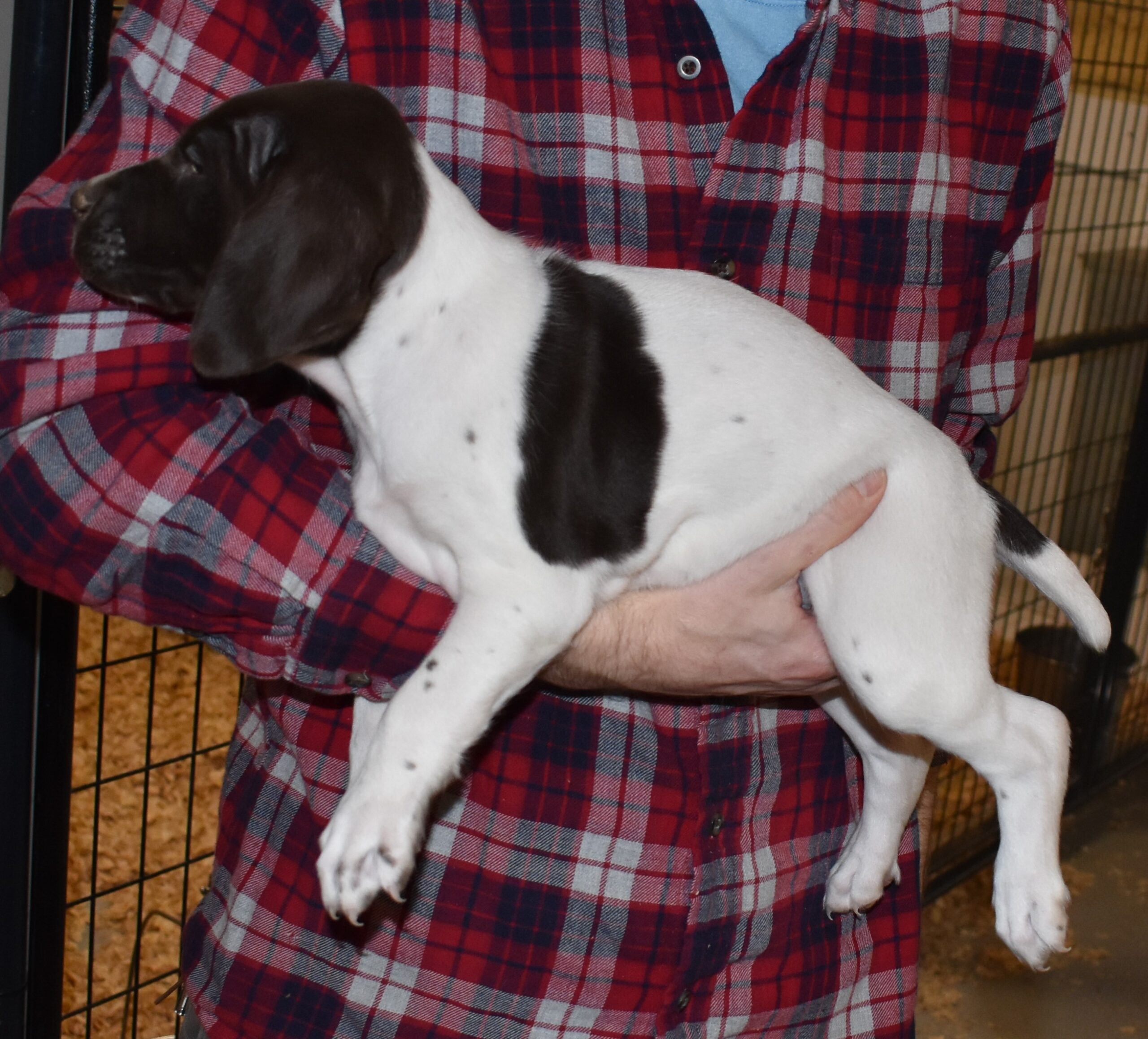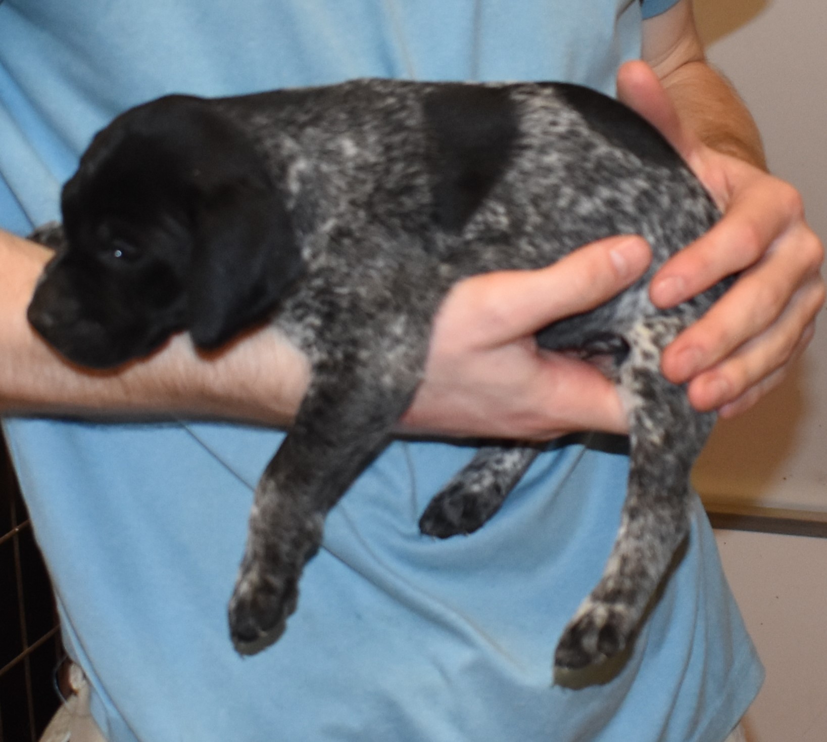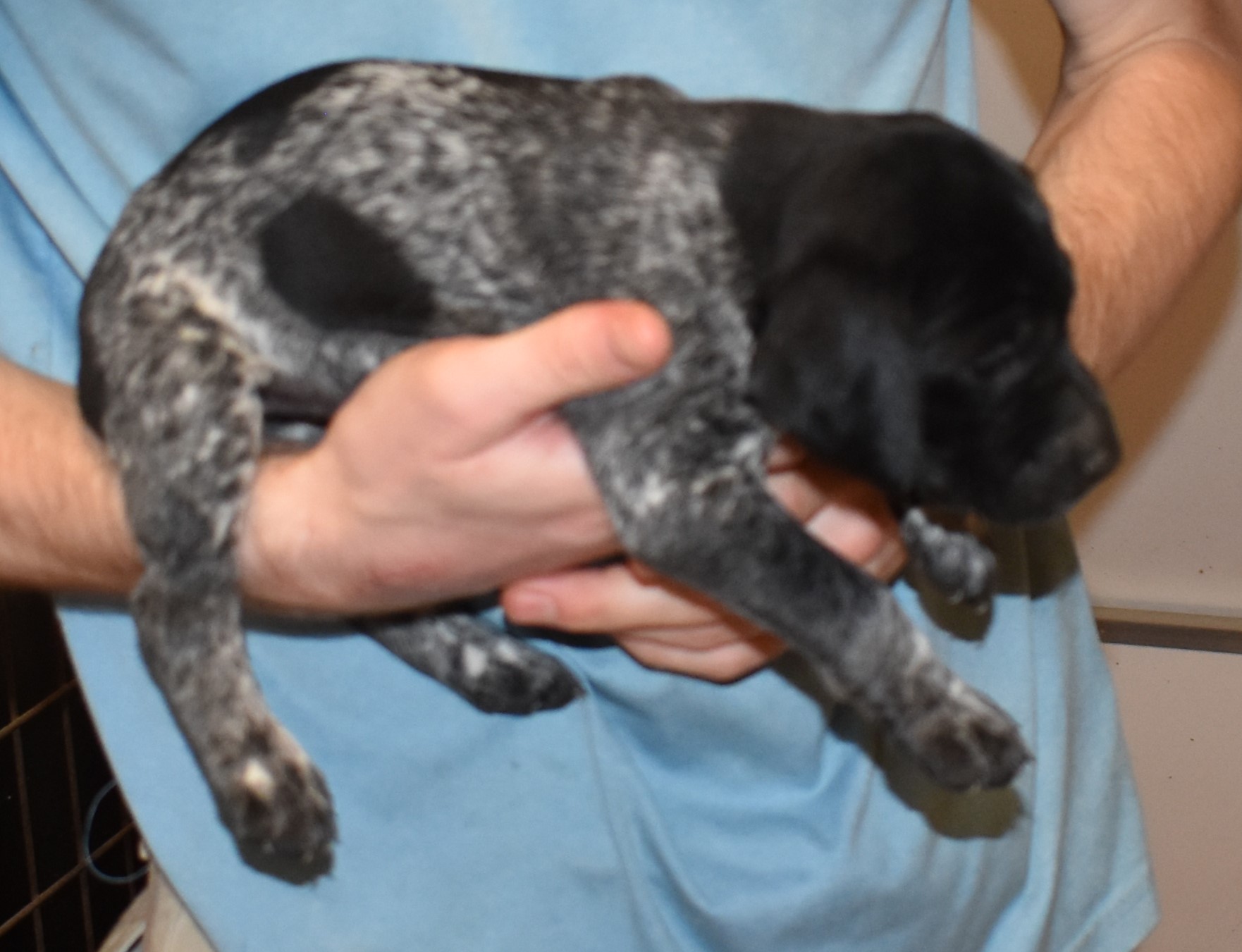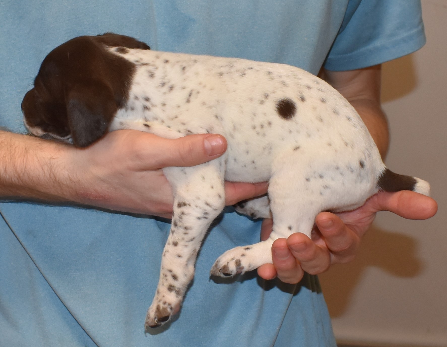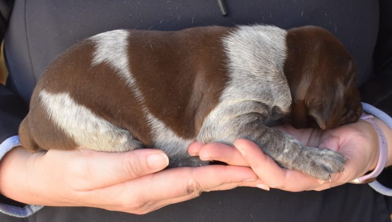 We have B-Atlas M2, a striking liver roan male GSP pup from Bailey and Atlas. As he grows, his white will develop into a roan/patched pattern. Bailey, the dam, is from some of the best GSP genetics in the country and the sire, Atlas, is a European import with a Deutsch Keuzar title. This litter will produce intelligent, beautiful companions and exceptional hunting dogs. Thanks to Cora for putting a deposit down to get this beautiful boy.