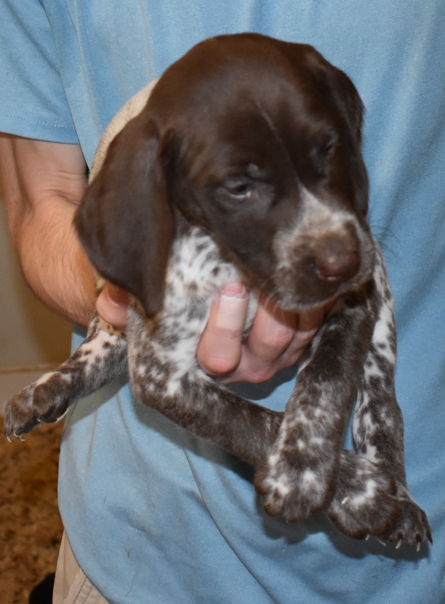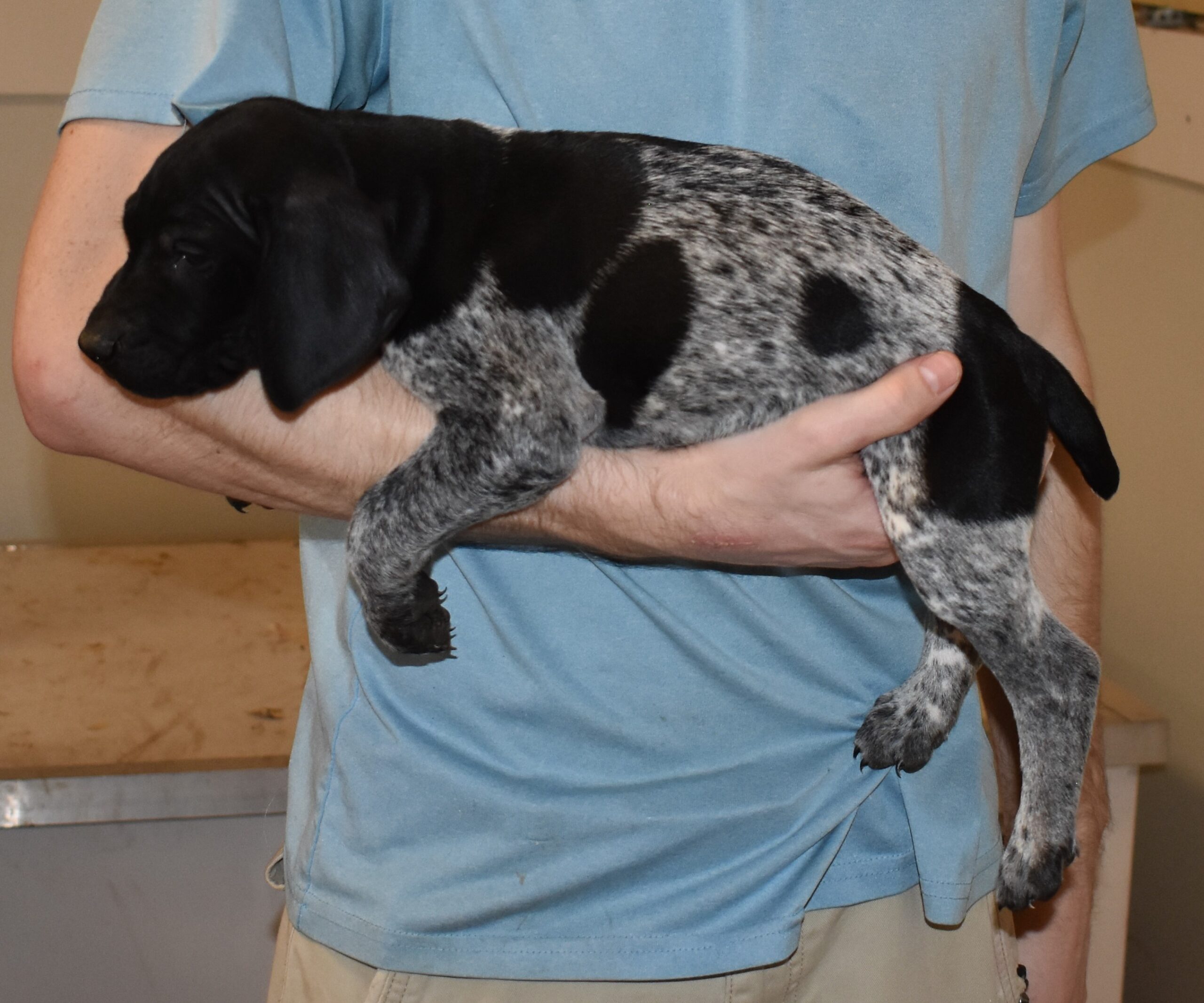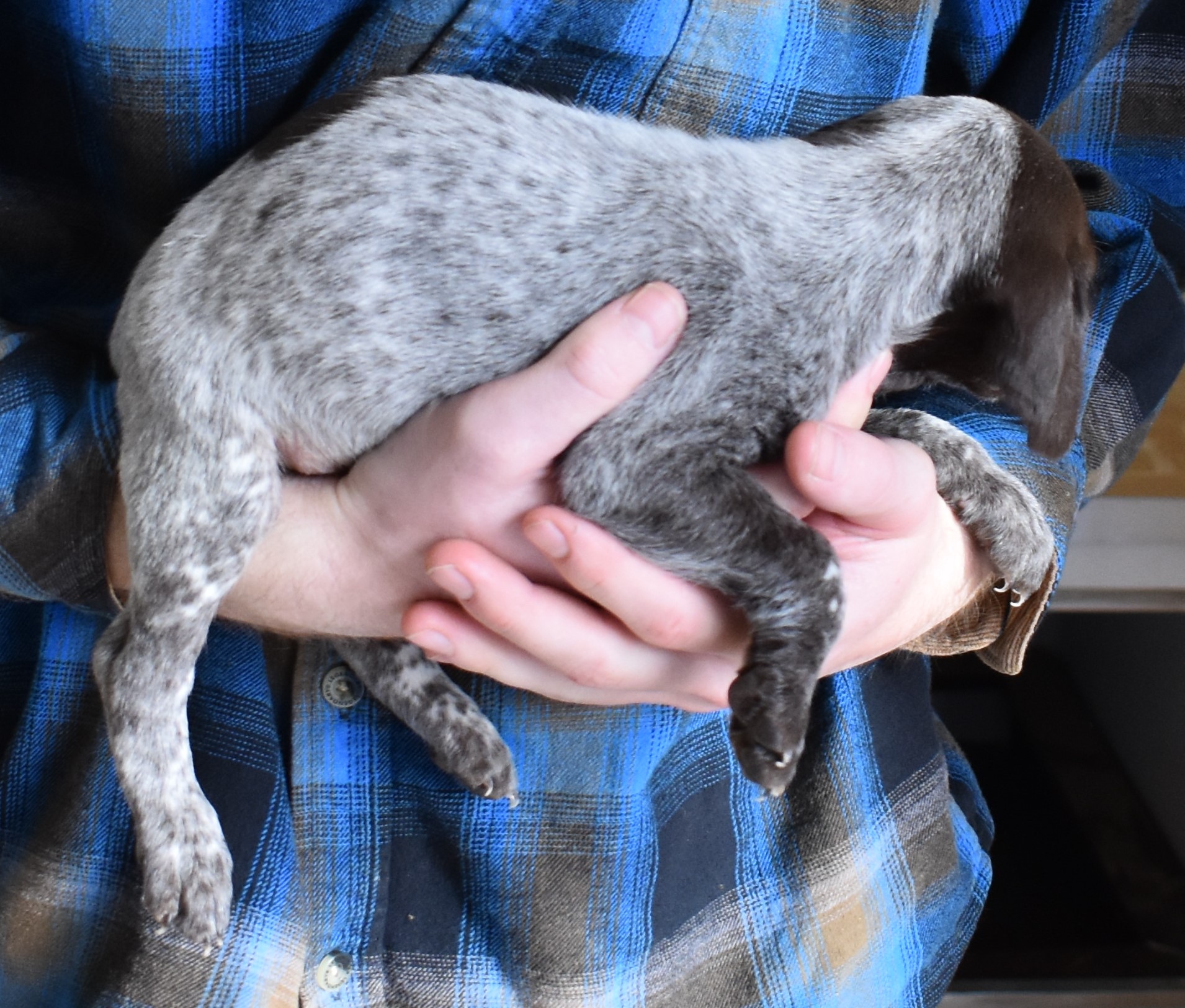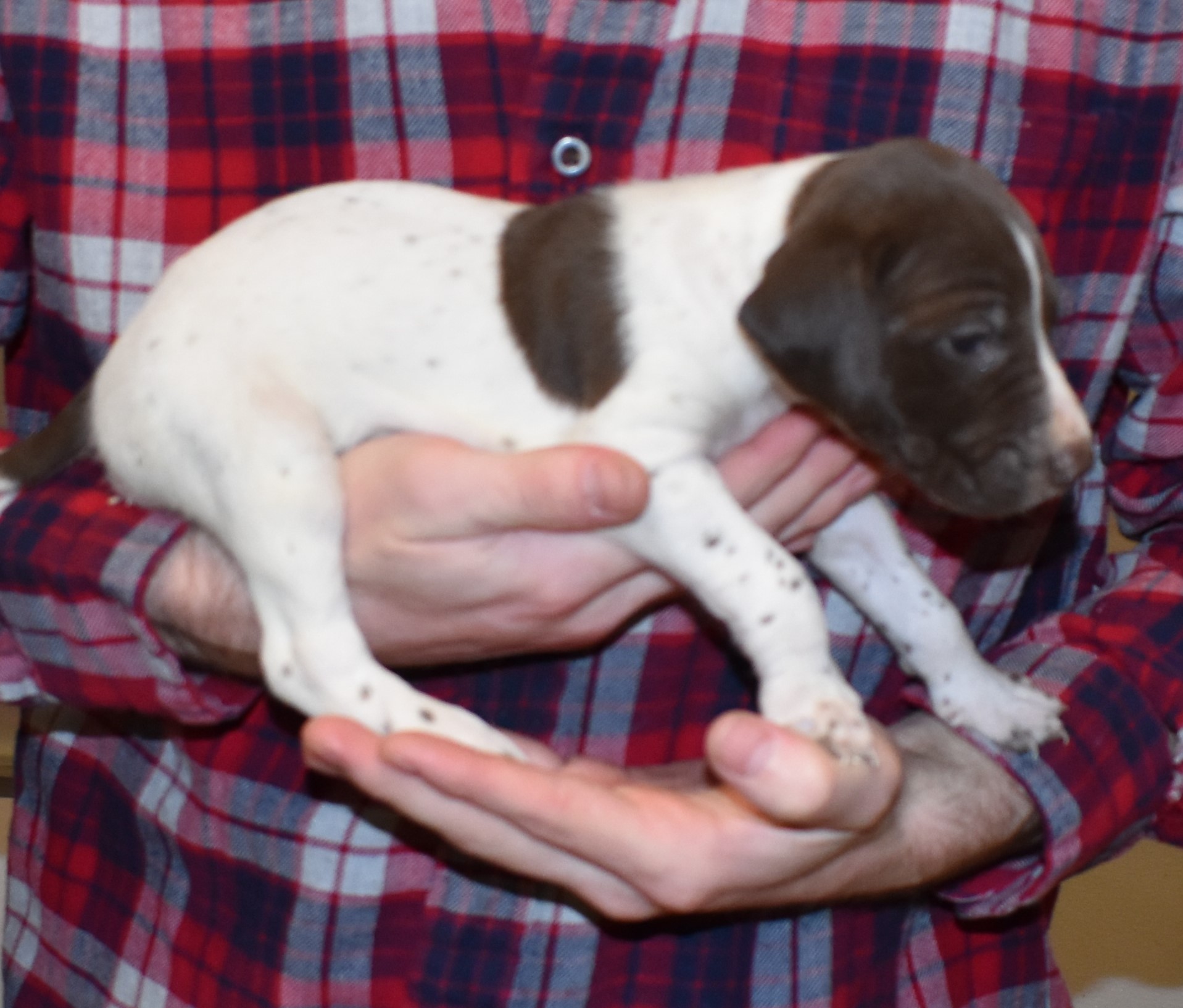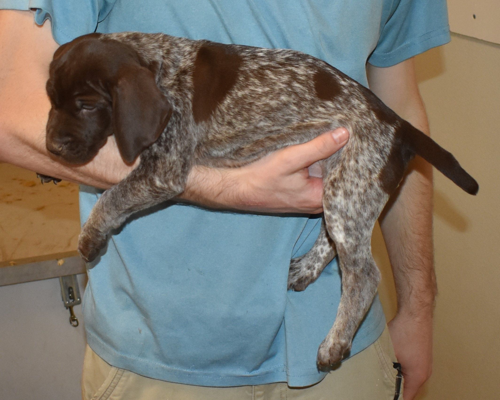 We have B-Atlas M2, a striking liver roan male GSP pup from Bailey and Atlas. As he grows, his white will develop into a roan/patched pattern. Bailey, the dam, is from some of the best GSP genetics in the country and the sire, Atlas, is a European import with a Deutsch Keuzar title. This litter will produce intelligent, beautiful companions and exceptional hunting dogs. Thanks to Cora for putting a deposit down to get this beautiful boy.