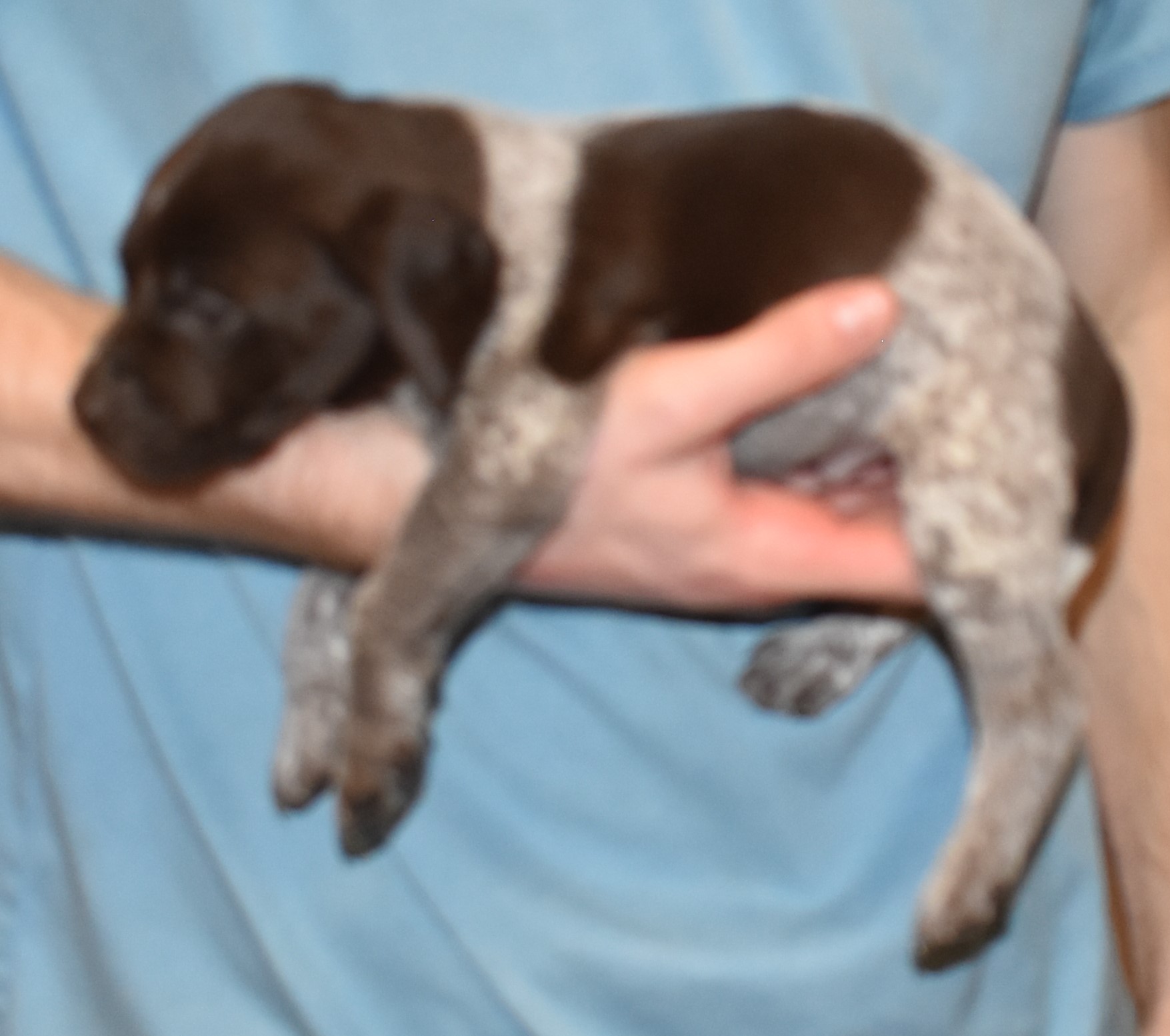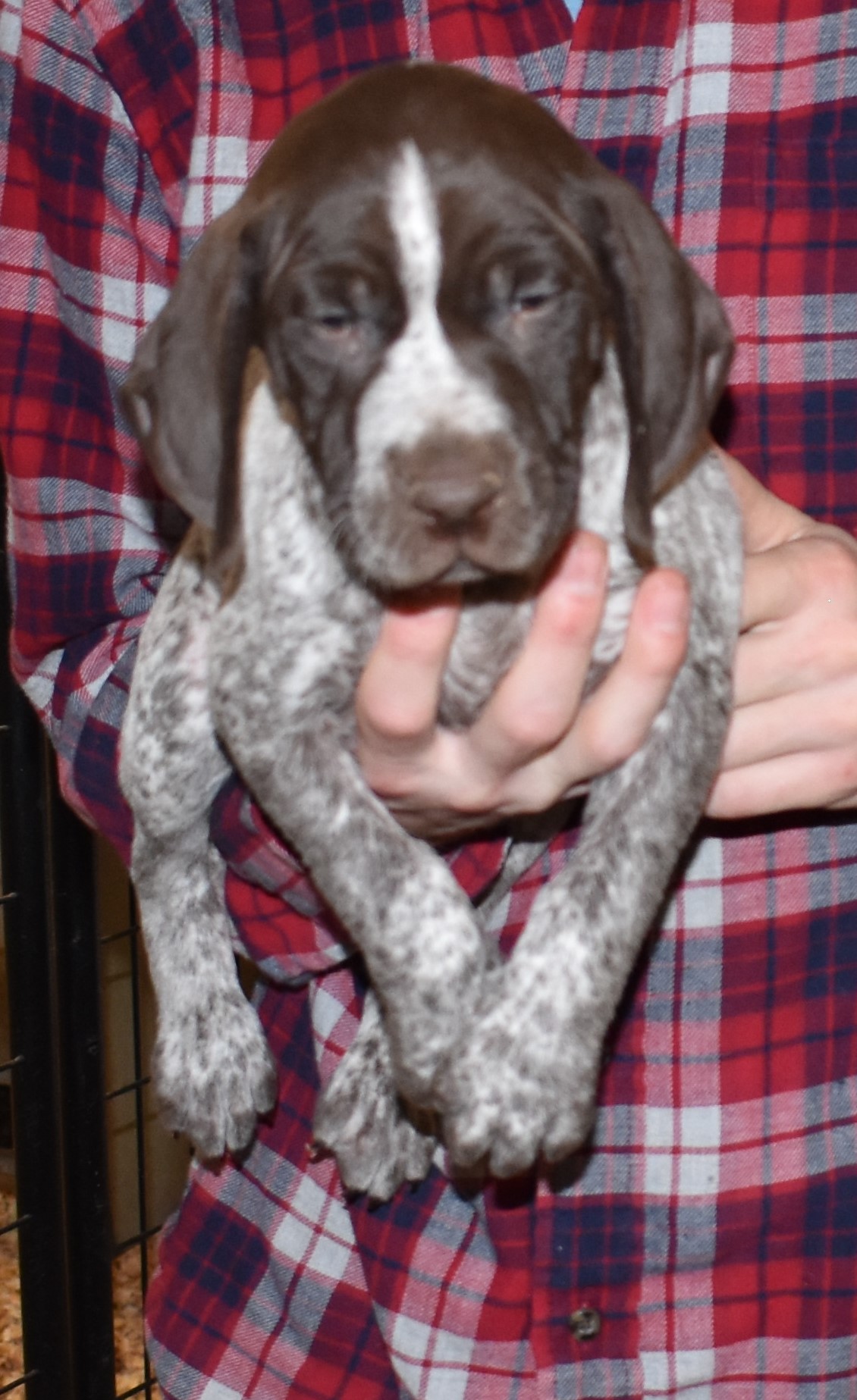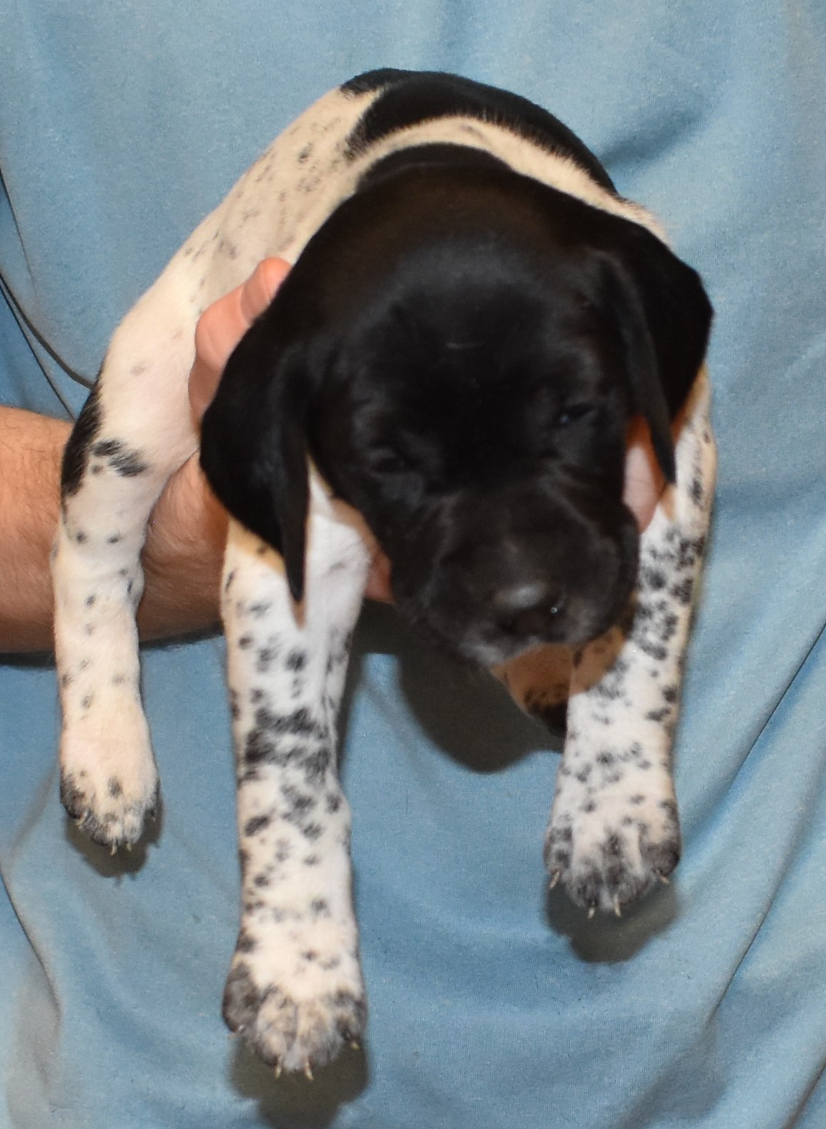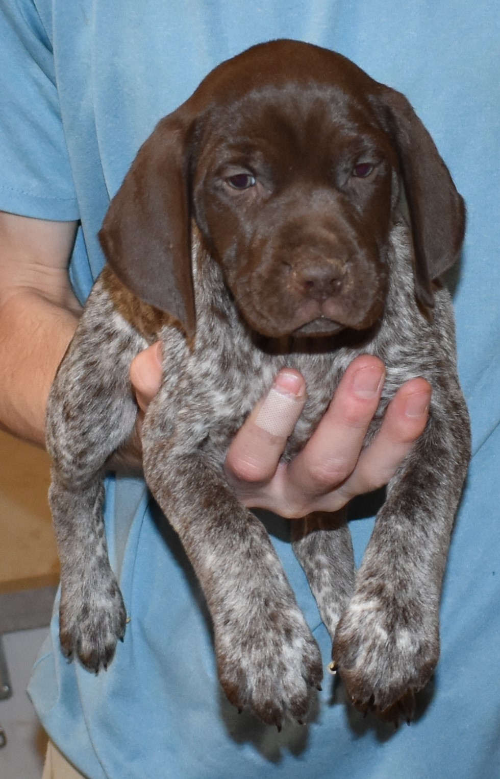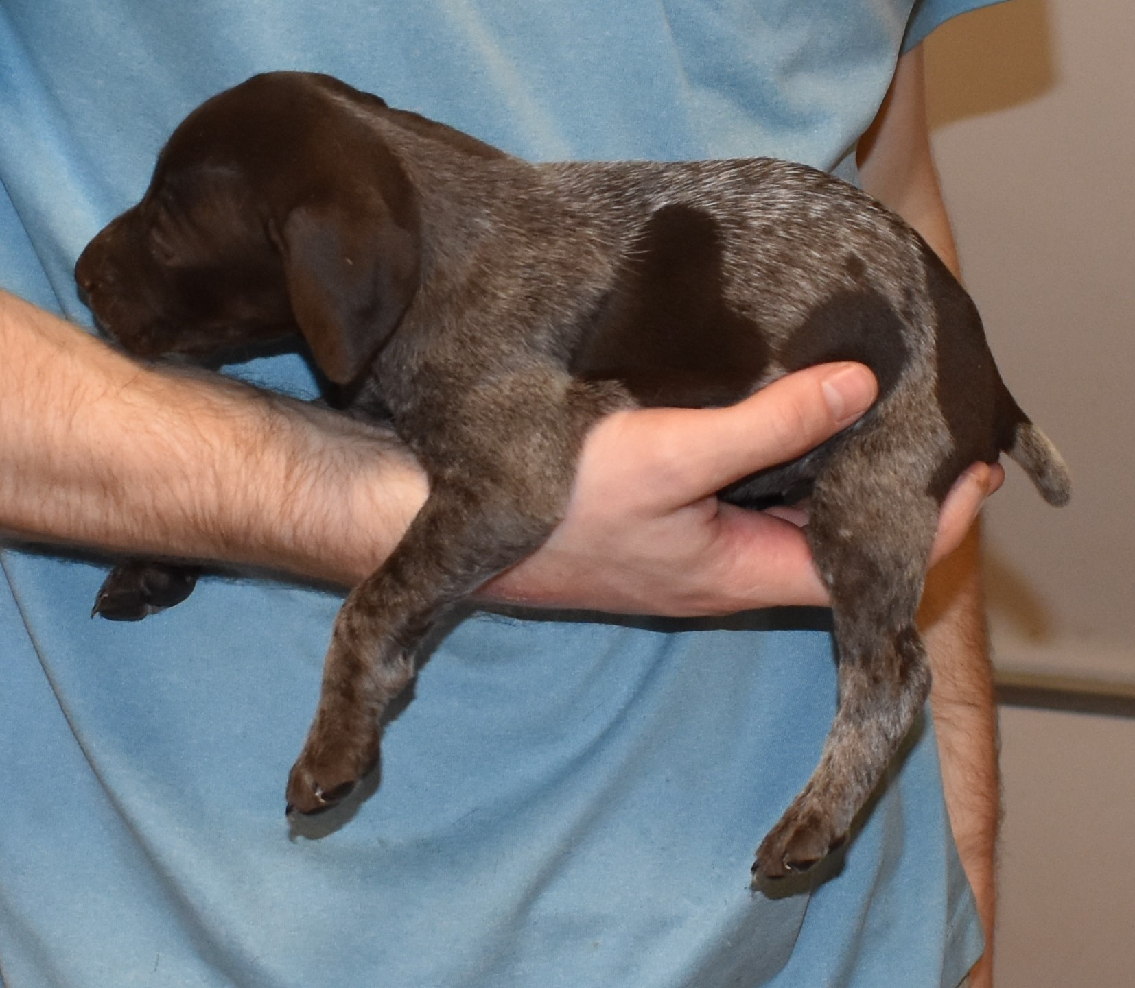 We have B-Atlas M2, a striking liver roan male GSP pup from Bailey and Atlas. As he grows, his white will develop into a roan/patched pattern. Bailey, the dam, is from some of the best GSP genetics in the country and the sire, Atlas, is a European import with a Deutsch Keuzar title. This litter will produce intelligent, beautiful companions and exceptional hunting dogs. Thanks to Cora for putting a deposit down to get this beautiful boy.