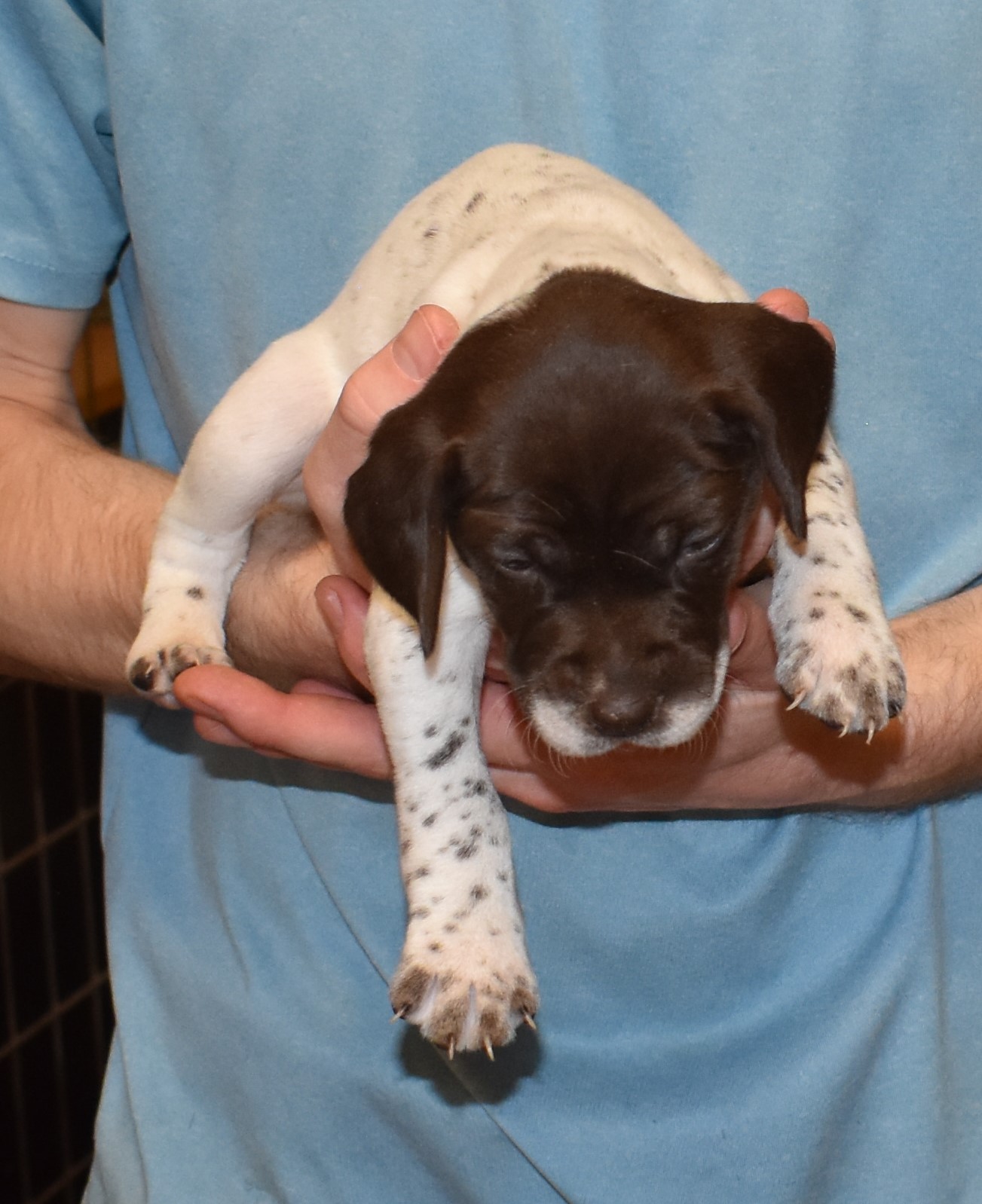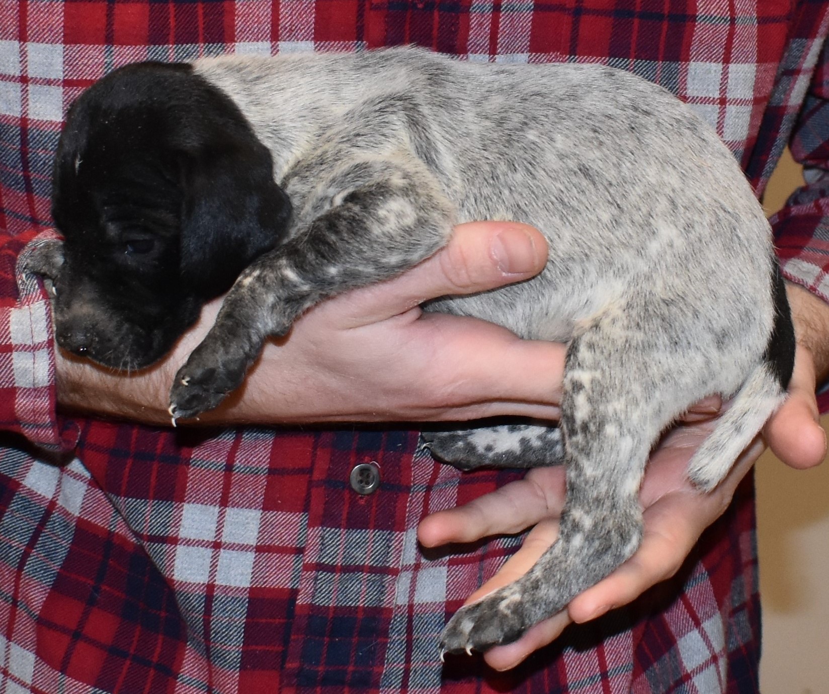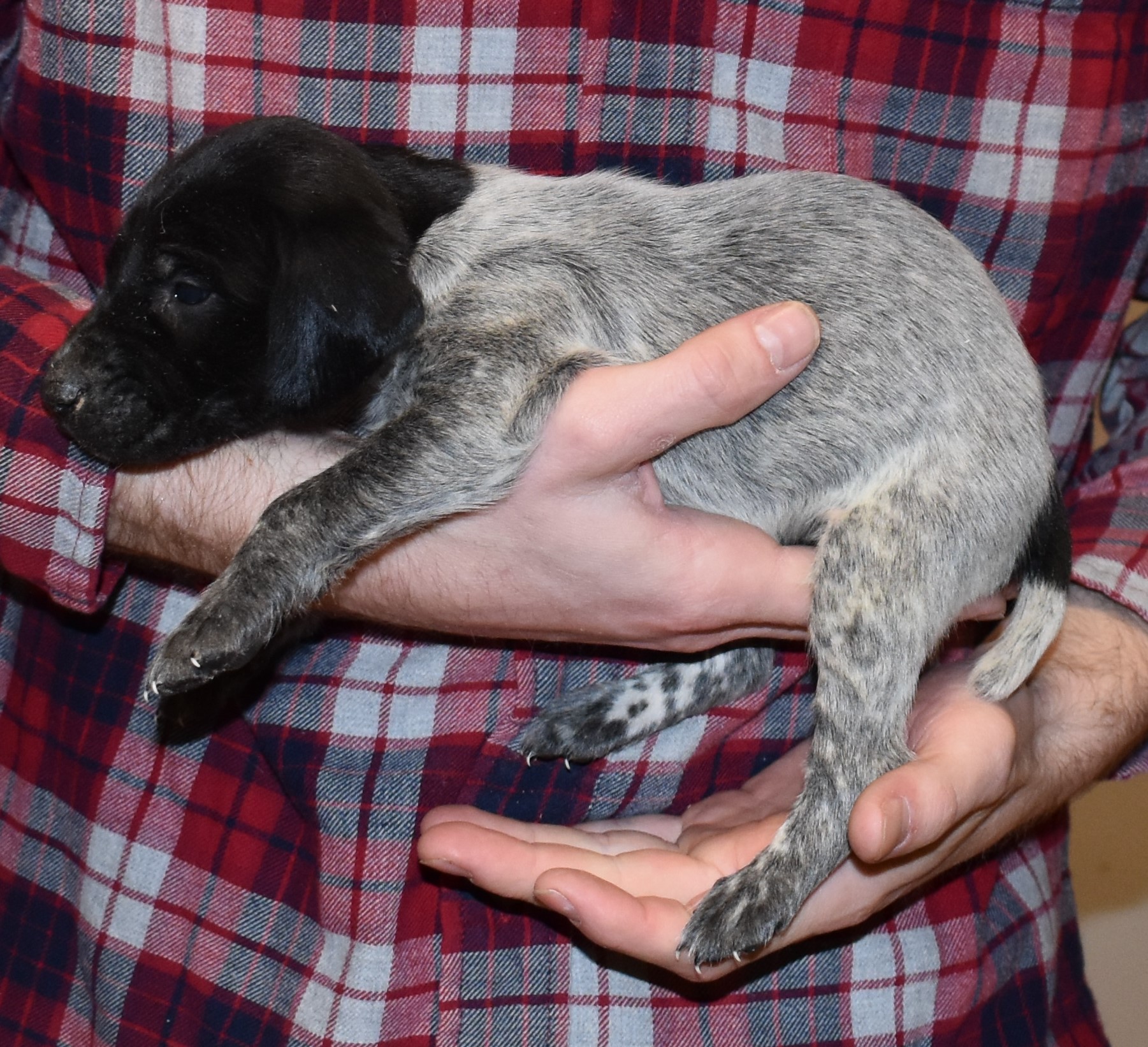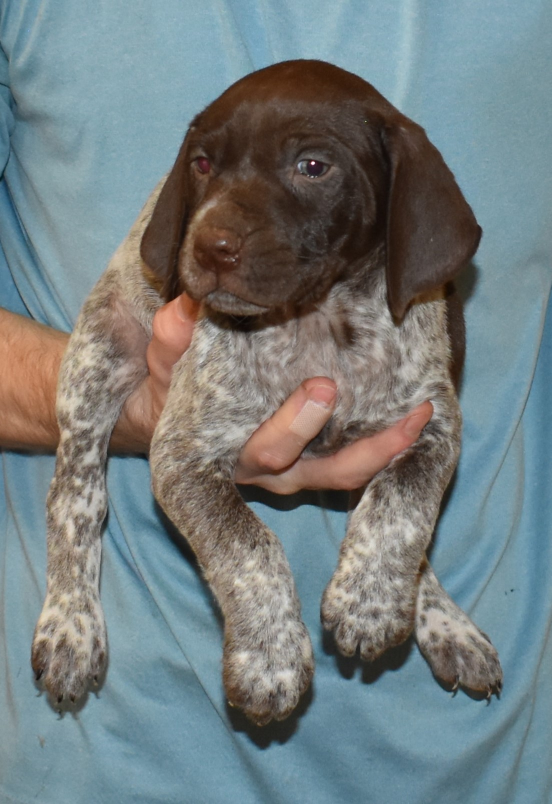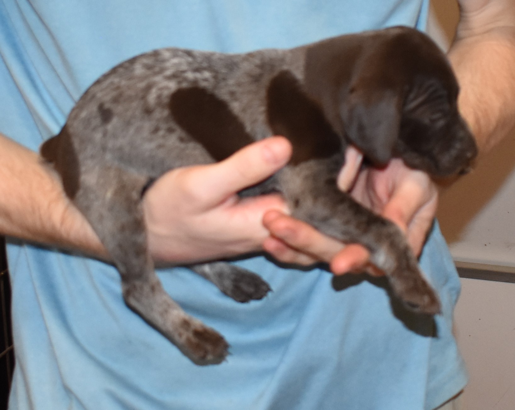 We have B-Atlas M2, a striking liver roan male GSP pup from Bailey and Atlas. As he grows, his white will develop into a roan/patched pattern. Bailey, the dam, is from some of the best GSP genetics in the country and the sire, Atlas, is a European import with a Deutsch Keuzar title. This litter will produce intelligent, beautiful companions and exceptional hunting dogs. Thanks to Cora for putting a deposit down to get this beautiful boy.