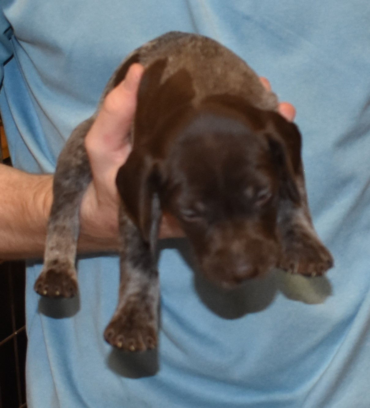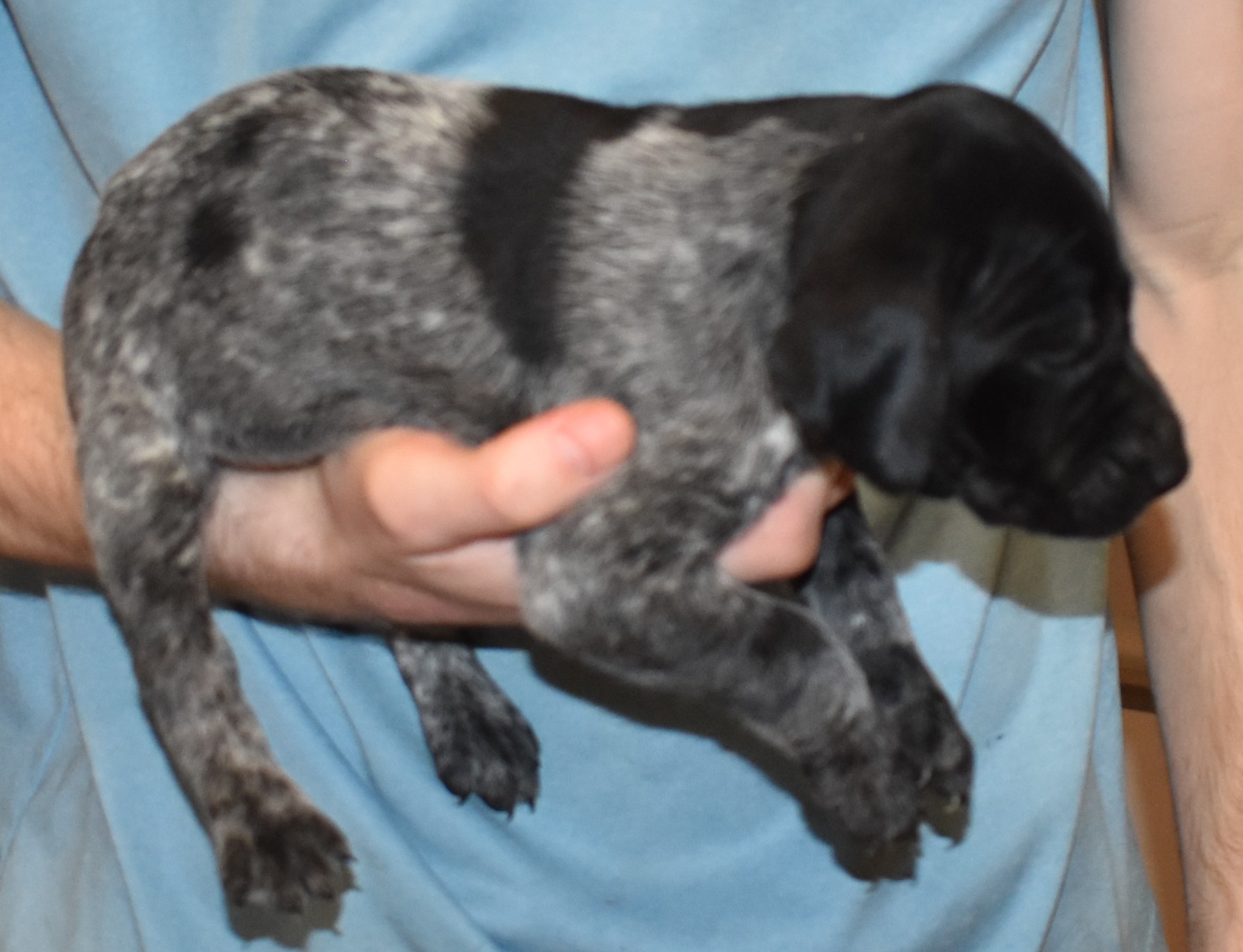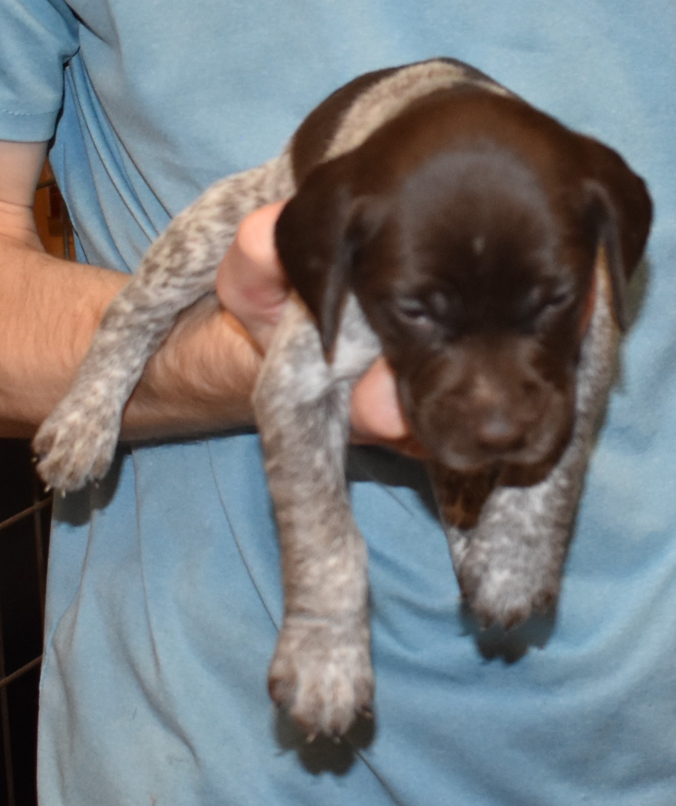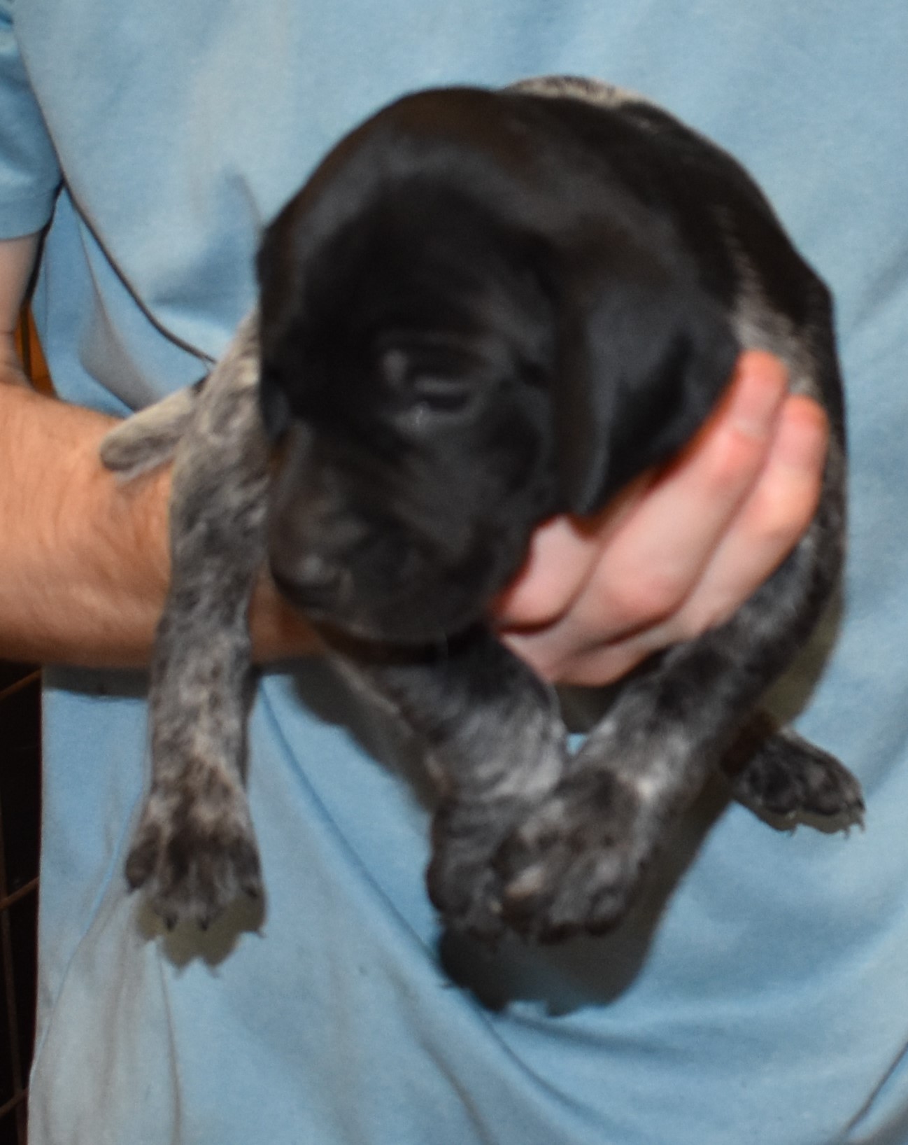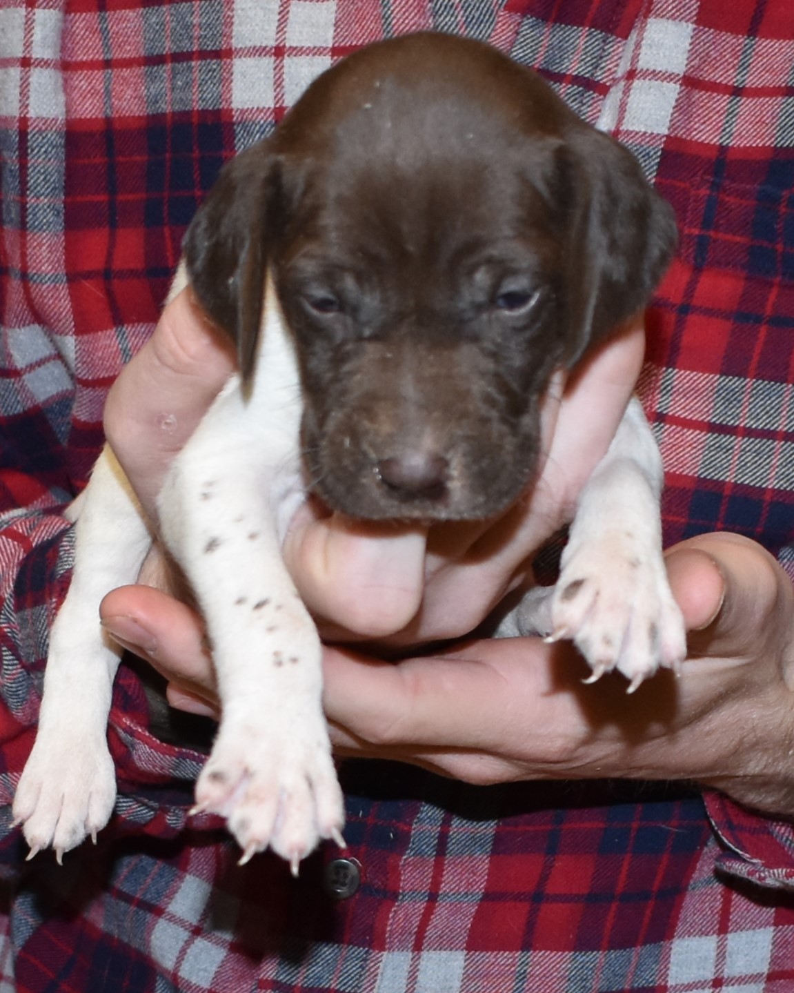 We have B-Atlas M2, a striking liver roan male GSP pup from Bailey and Atlas. As he grows, his white will develop into a roan/patched pattern. Bailey, the dam, is from some of the best GSP genetics in the country and the sire, Atlas, is a European import with a Deutsch Keuzar title. This litter will produce intelligent, beautiful companions and exceptional hunting dogs. Thanks to Cora for putting a deposit down to get this beautiful boy.