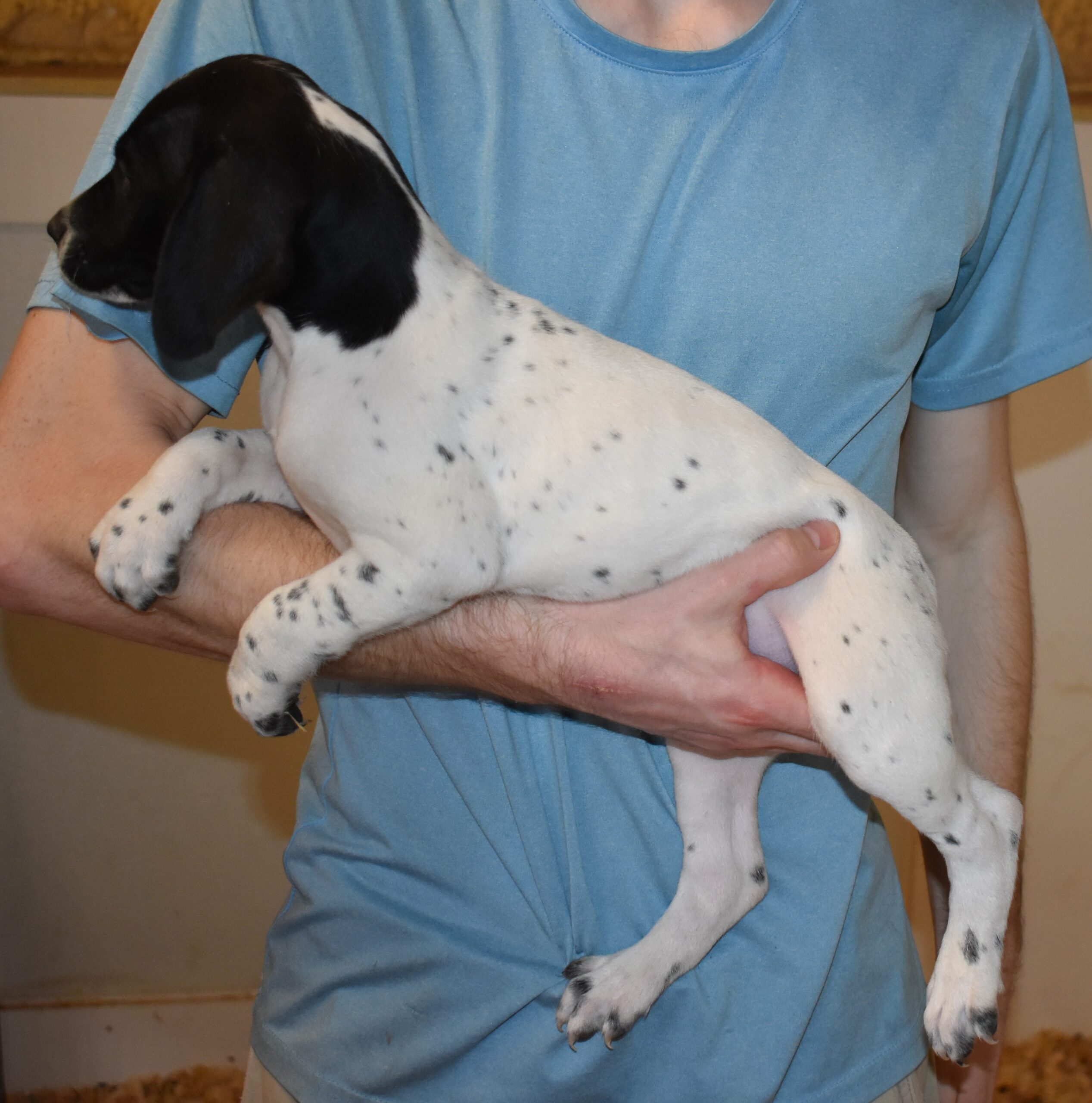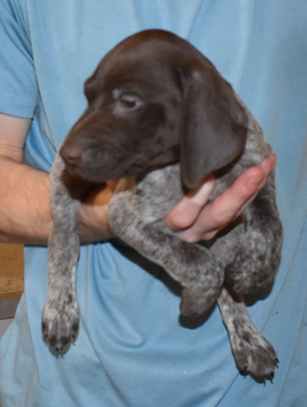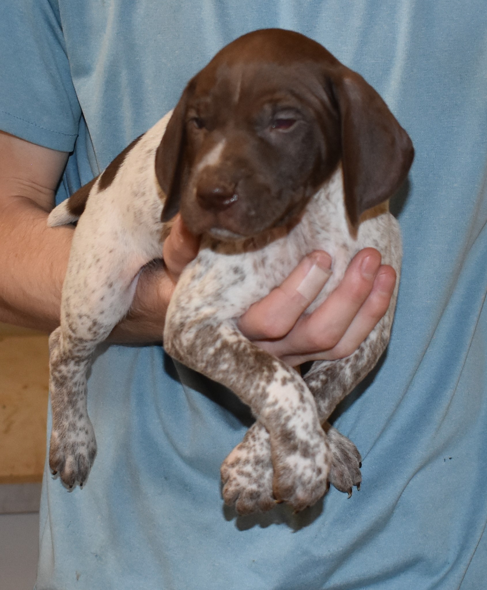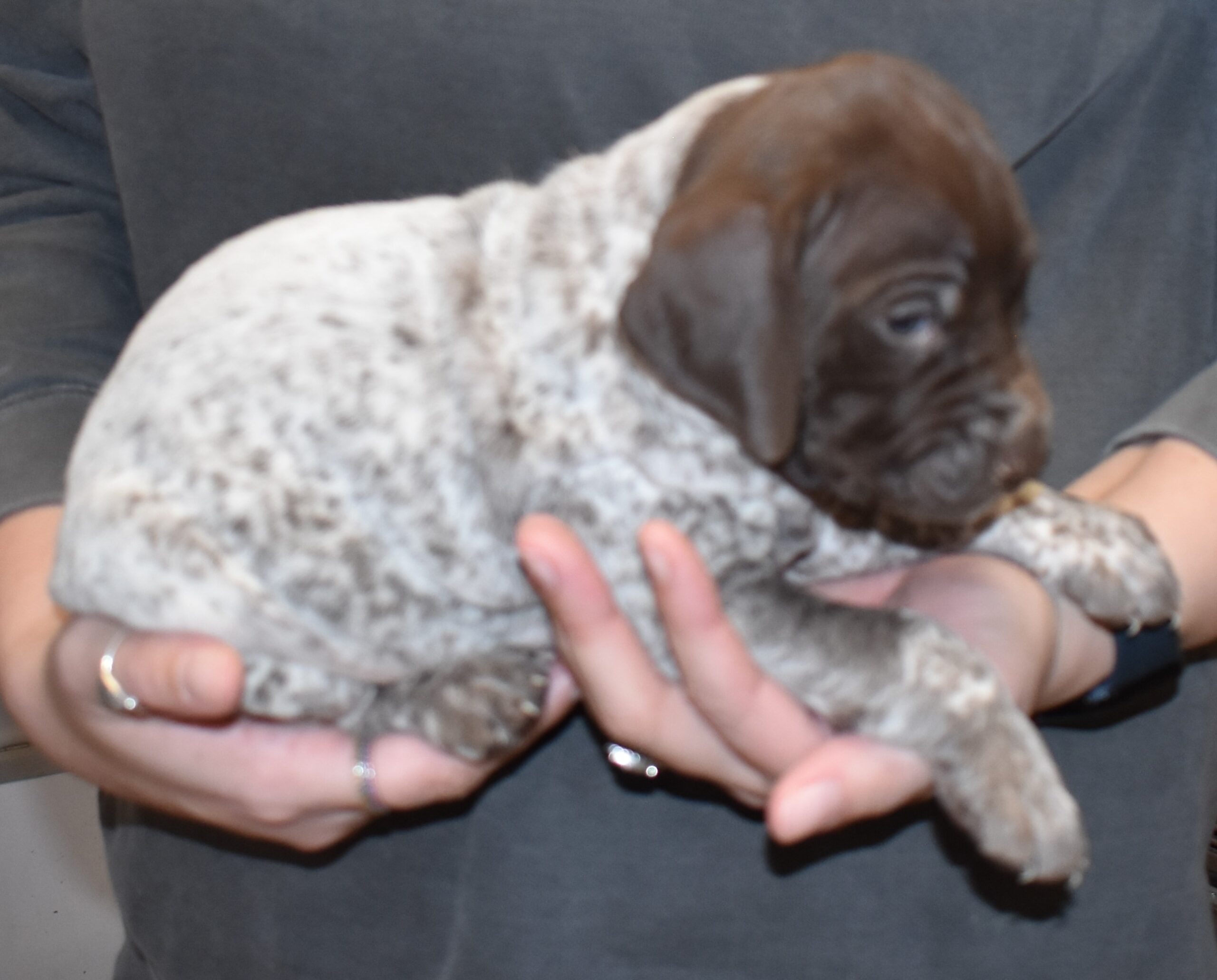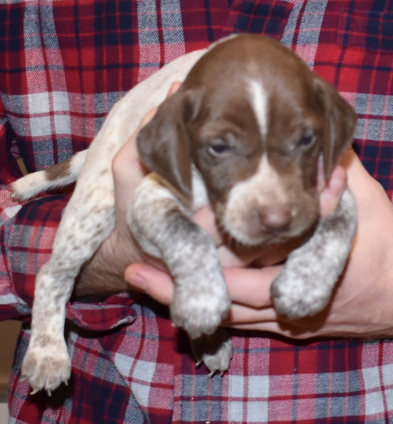 We have B-Atlas M2, a striking liver roan male GSP pup from Bailey and Atlas. As he grows, his white will develop into a roan/patched pattern. Bailey, the dam, is from some of the best GSP genetics in the country and the sire, Atlas, is a European import with a Deutsch Keuzar title. This litter will produce intelligent, beautiful companions and exceptional hunting dogs. Thanks to Cora for putting a deposit down to get this beautiful boy.