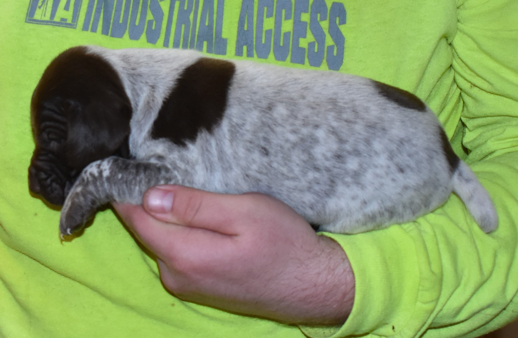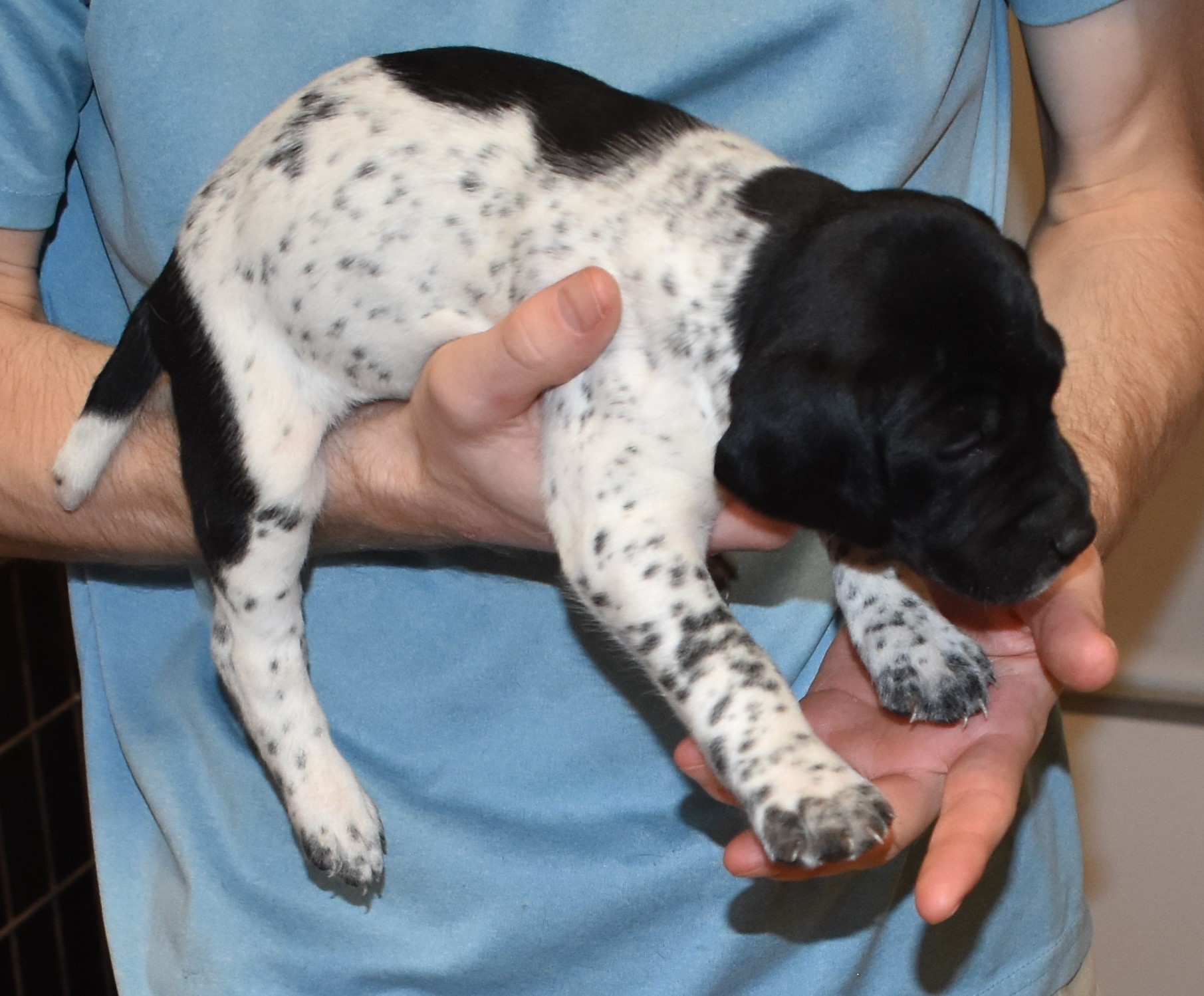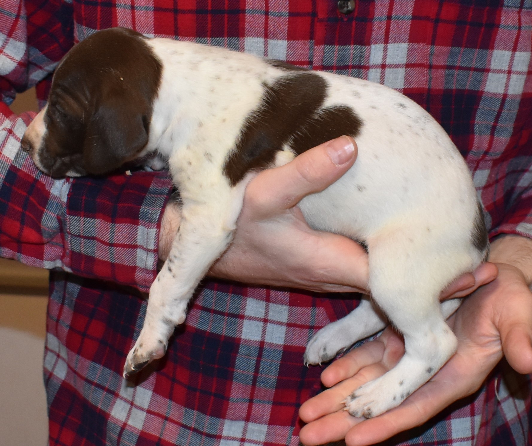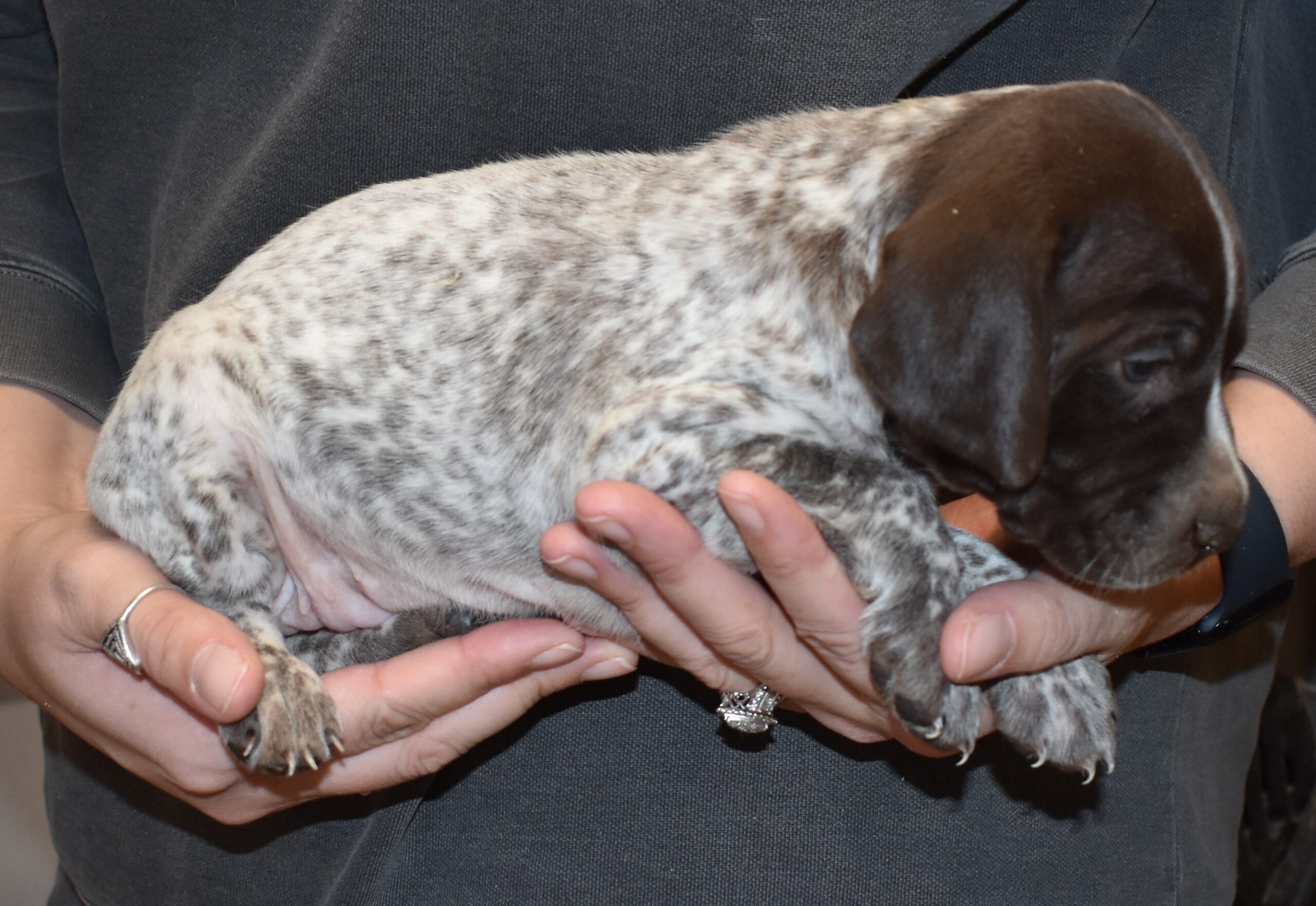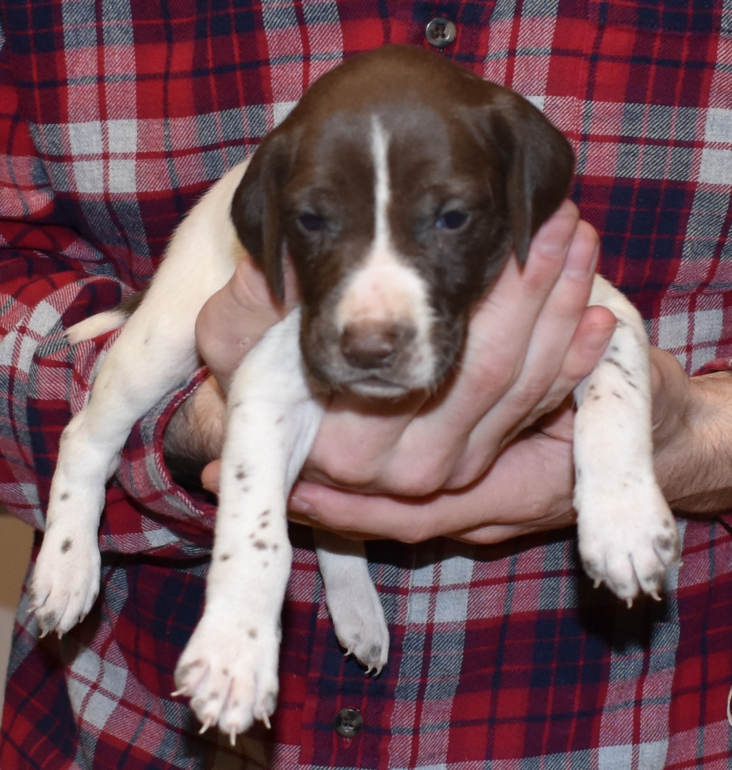 We have B-Atlas M2, a striking liver roan male GSP pup from Bailey and Atlas. As he grows, his white will develop into a roan/patched pattern. Bailey, the dam, is from some of the best GSP genetics in the country and the sire, Atlas, is a European import with a Deutsch Keuzar title. This litter will produce intelligent, beautiful companions and exceptional hunting dogs. Thanks to Cora for putting a deposit down to get this beautiful boy.
