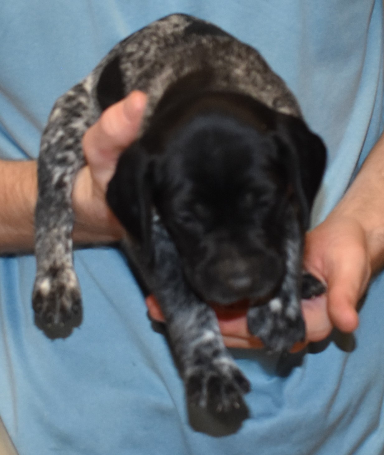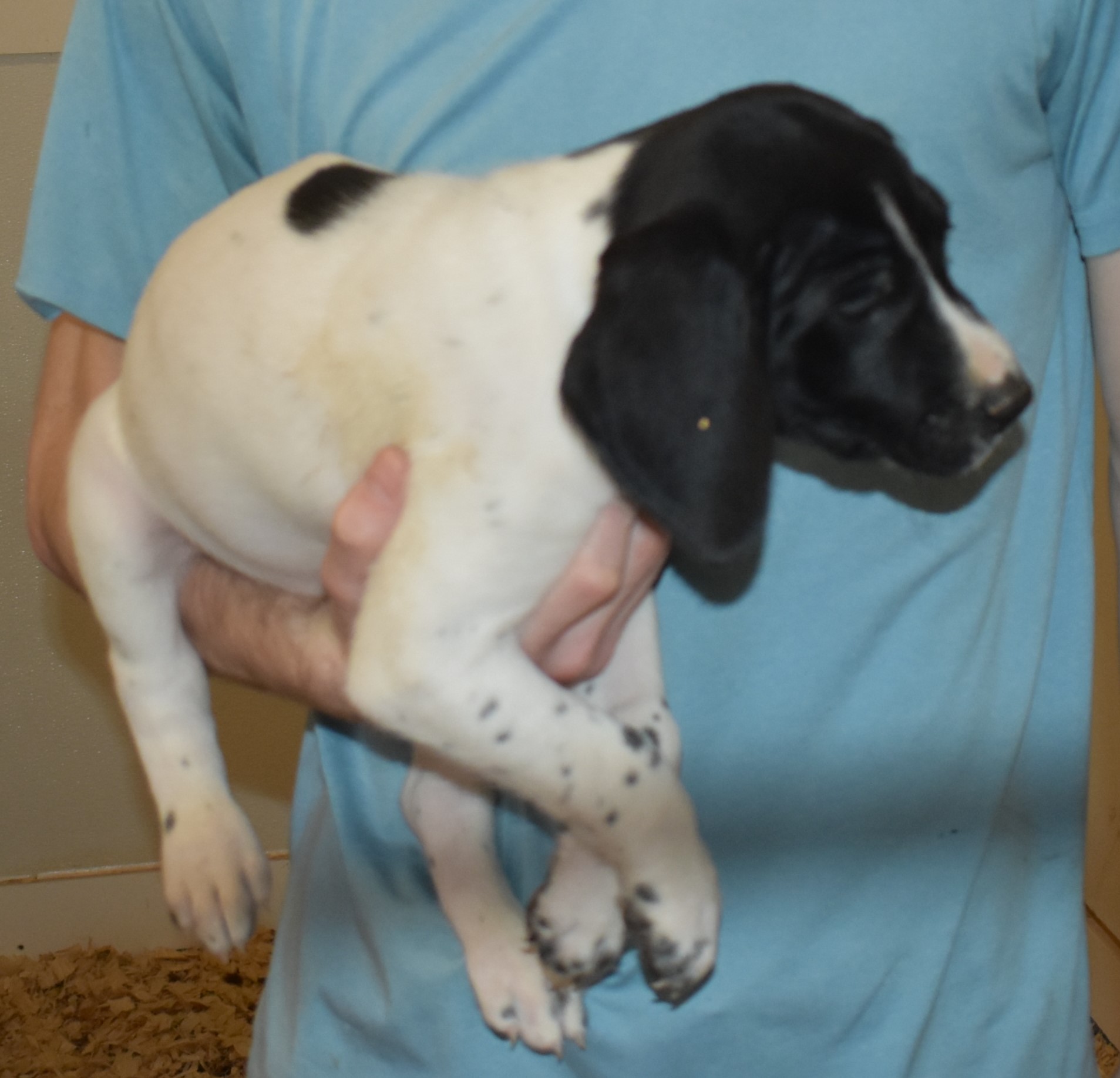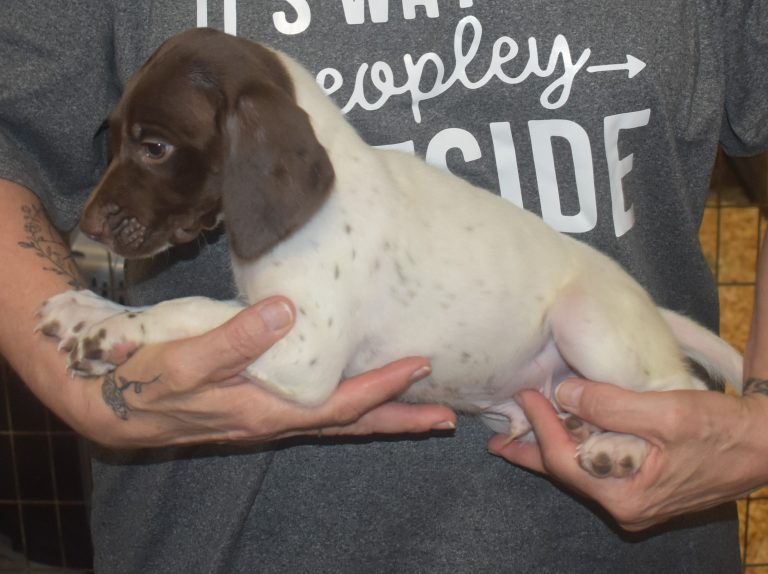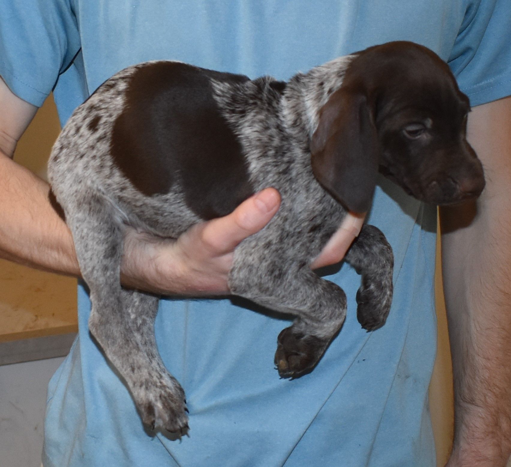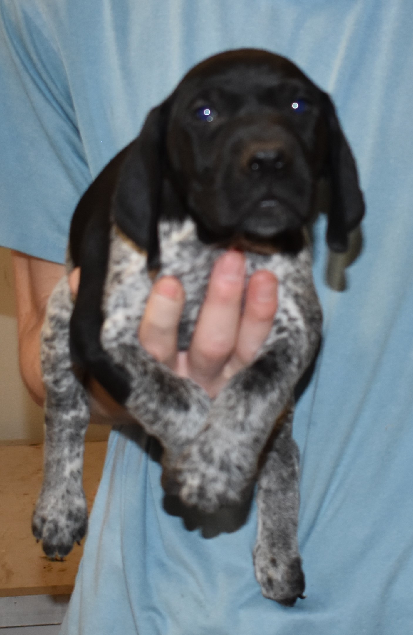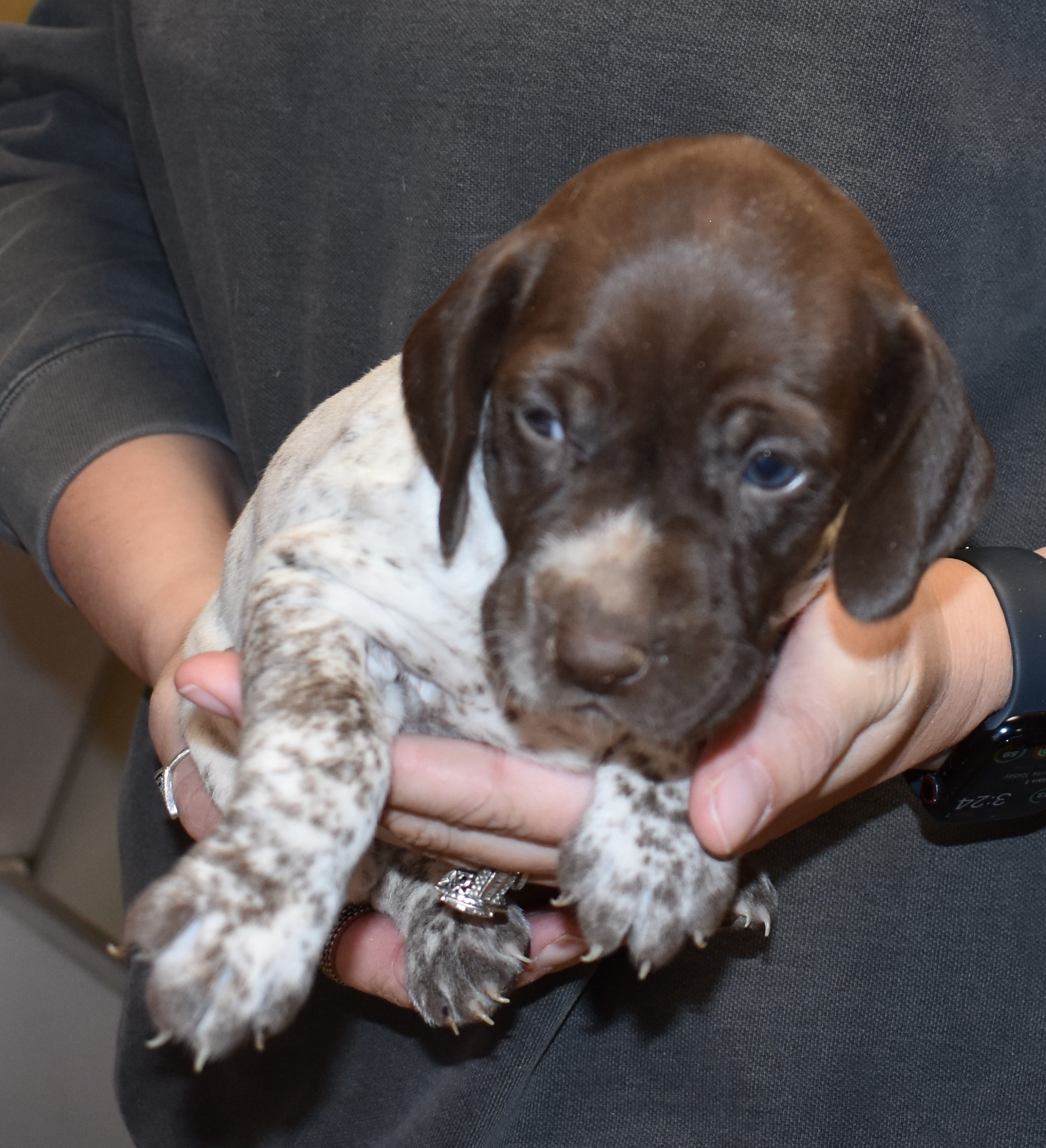 We have B-Atlas M2, a striking liver roan male GSP pup from Bailey and Atlas. As he grows, his white will develop into a roan/patched pattern. Bailey, the dam, is from some of the best GSP genetics in the country and the sire, Atlas, is a European import with a Deutsch Keuzar title. This litter will produce intelligent, beautiful companions and exceptional hunting dogs. Thanks to Cora for putting a deposit down to get this beautiful boy.