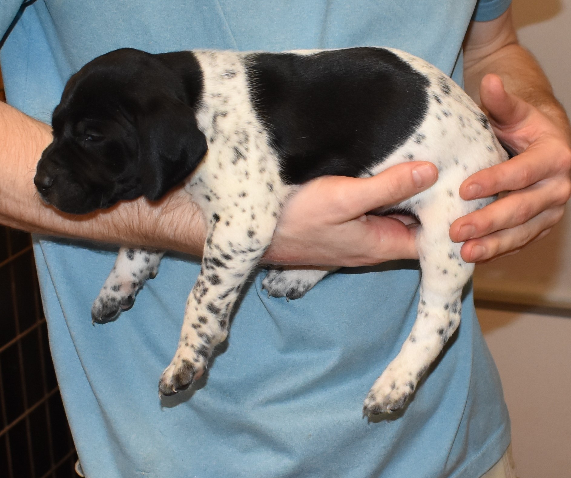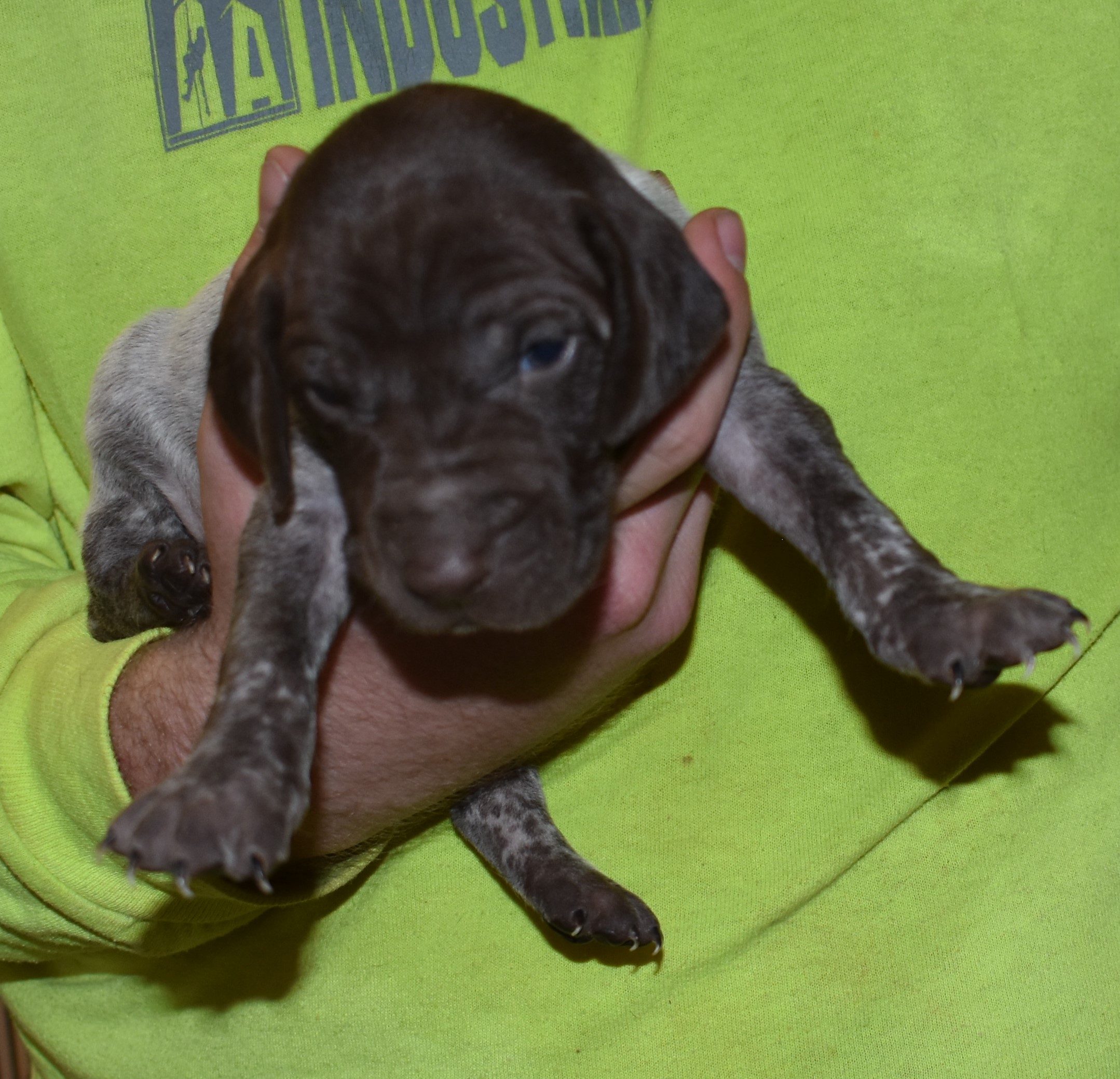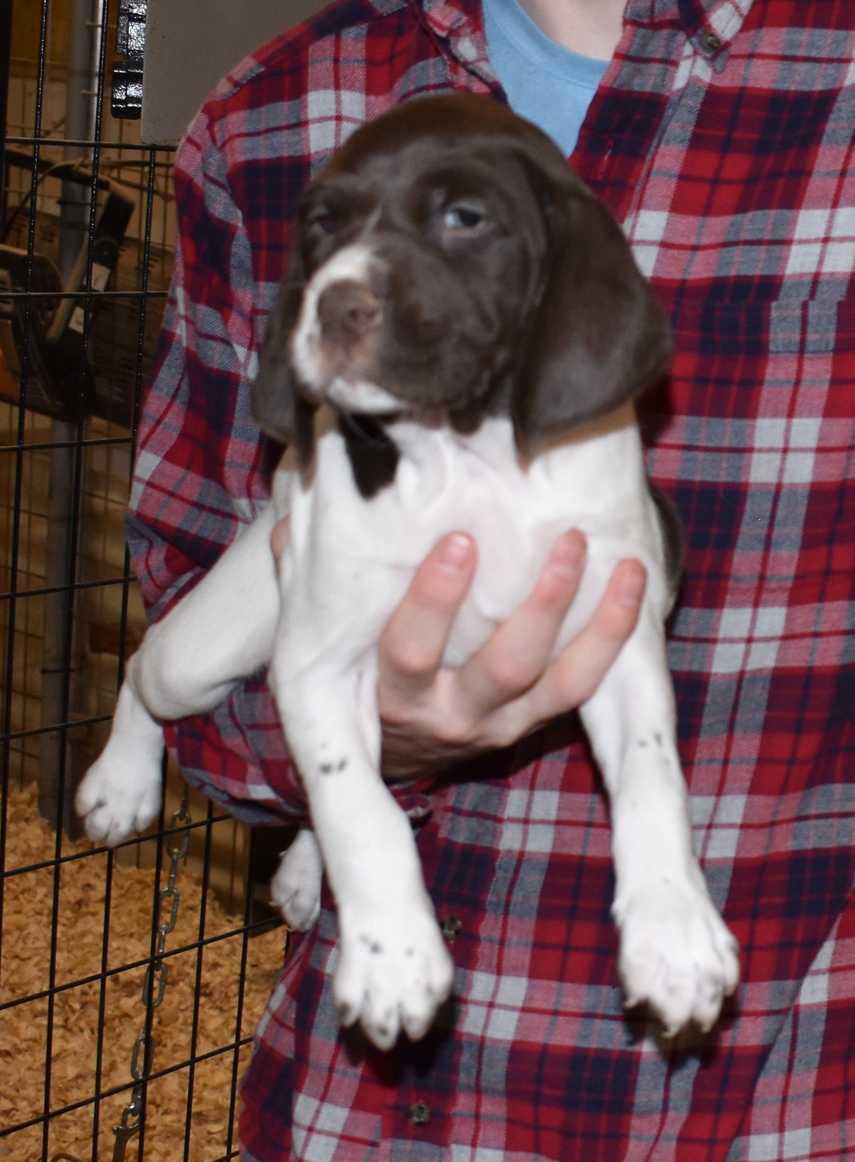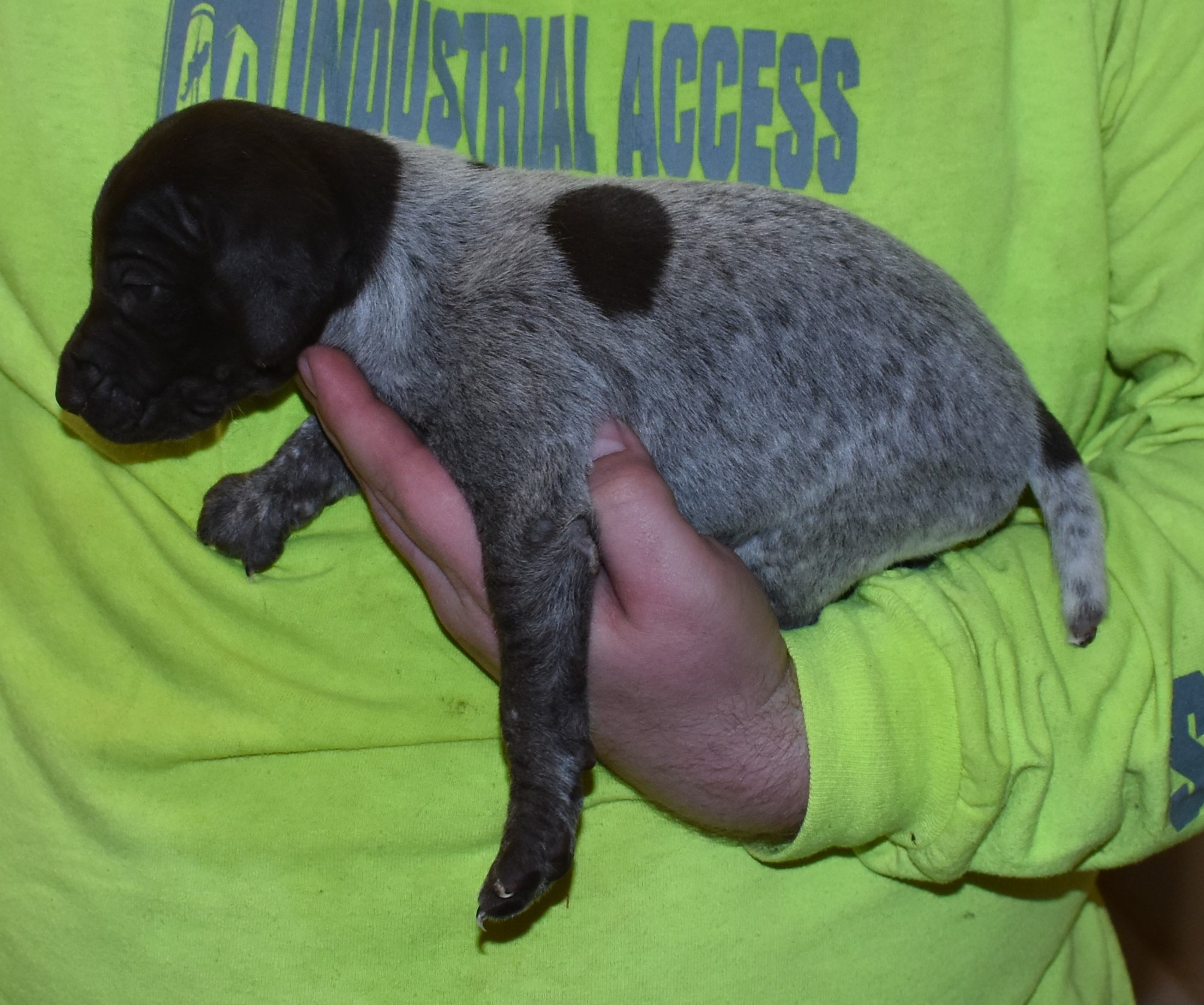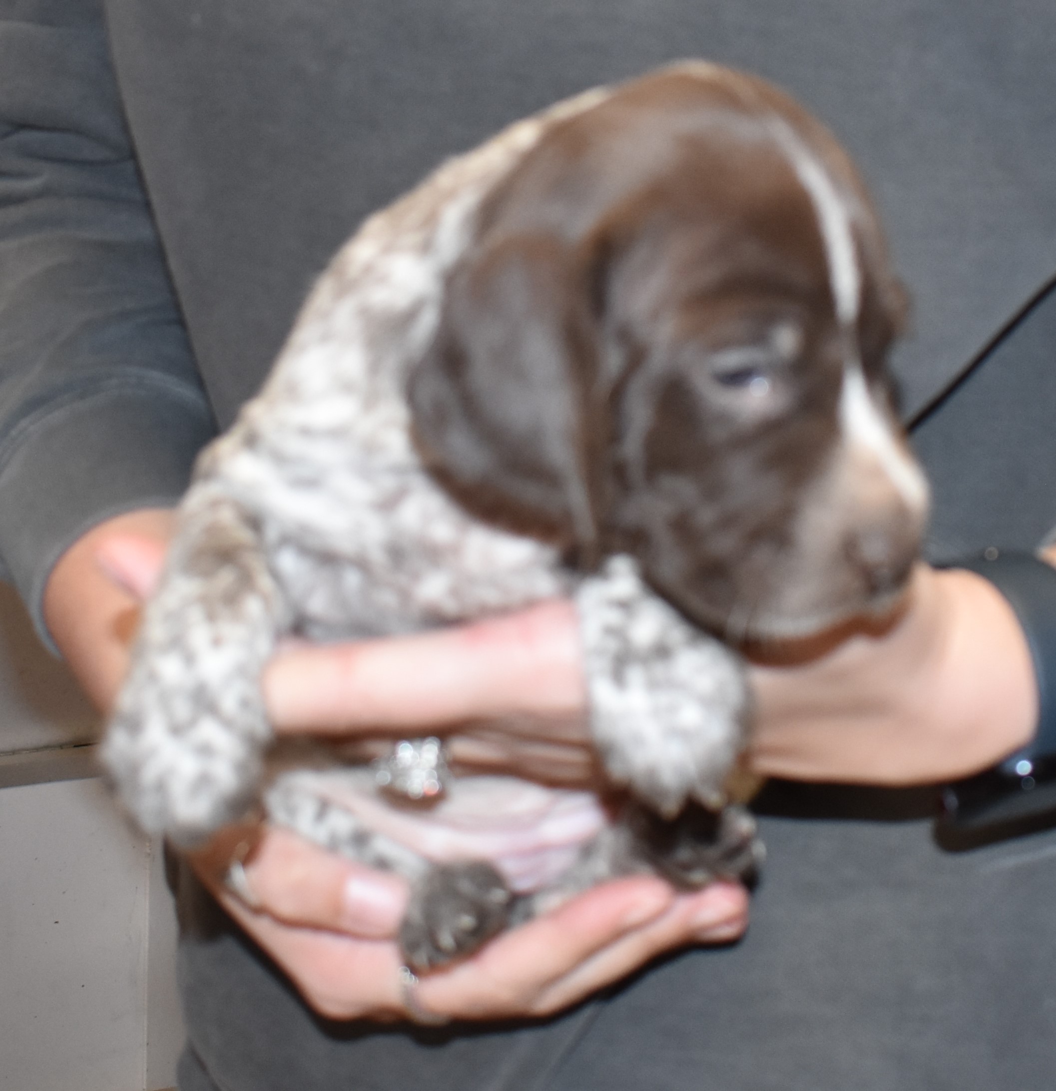 We have B-Atlas M2, a striking liver roan male GSP pup from Bailey and Atlas. As he grows, his white will develop into a roan/patched pattern. Bailey, the dam, is from some of the best GSP genetics in the country and the sire, Atlas, is a European import with a Deutsch Keuzar title. This litter will produce intelligent, beautiful companions and exceptional hunting dogs. Thanks to Cora for putting a deposit down to get this beautiful boy.