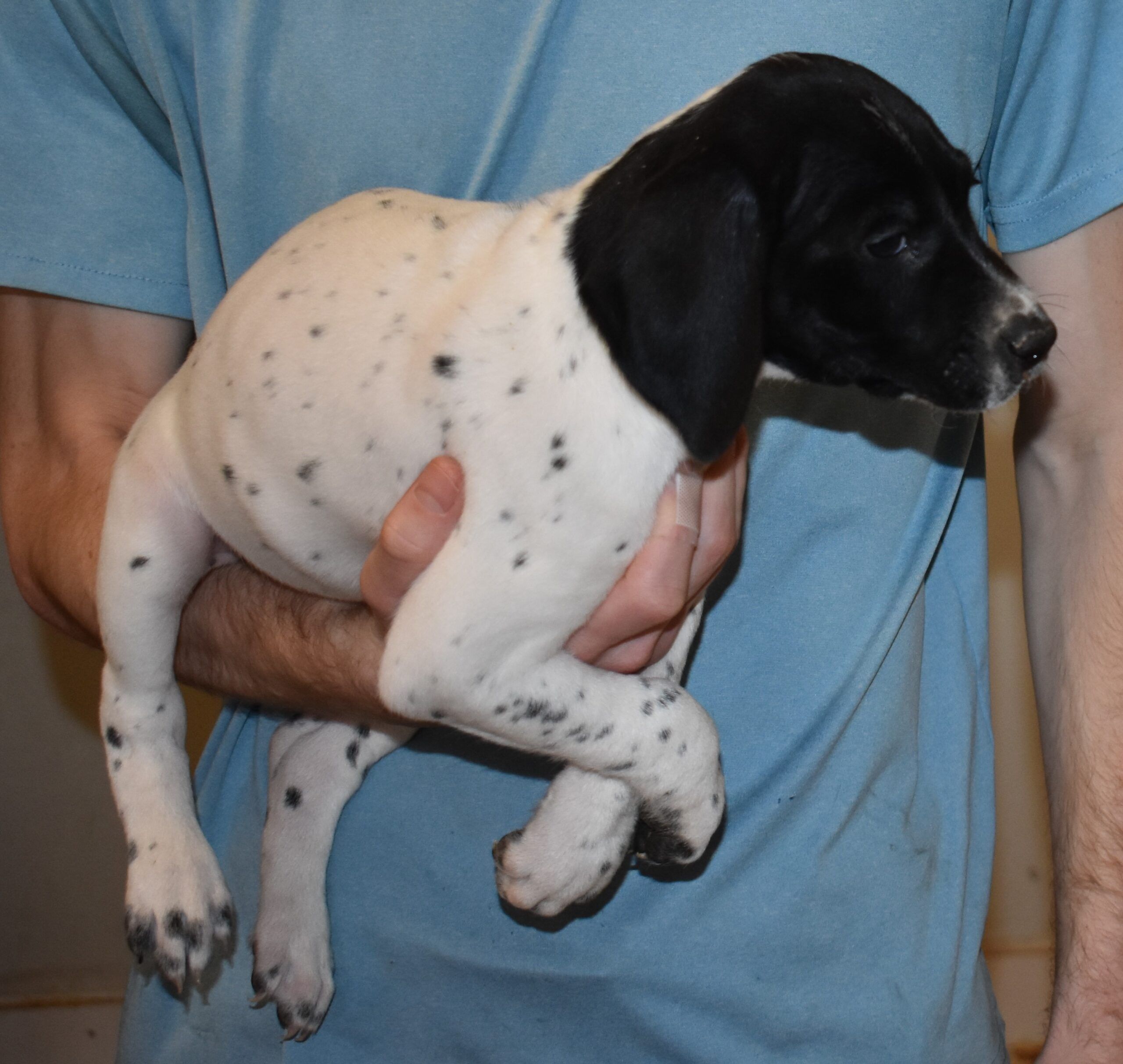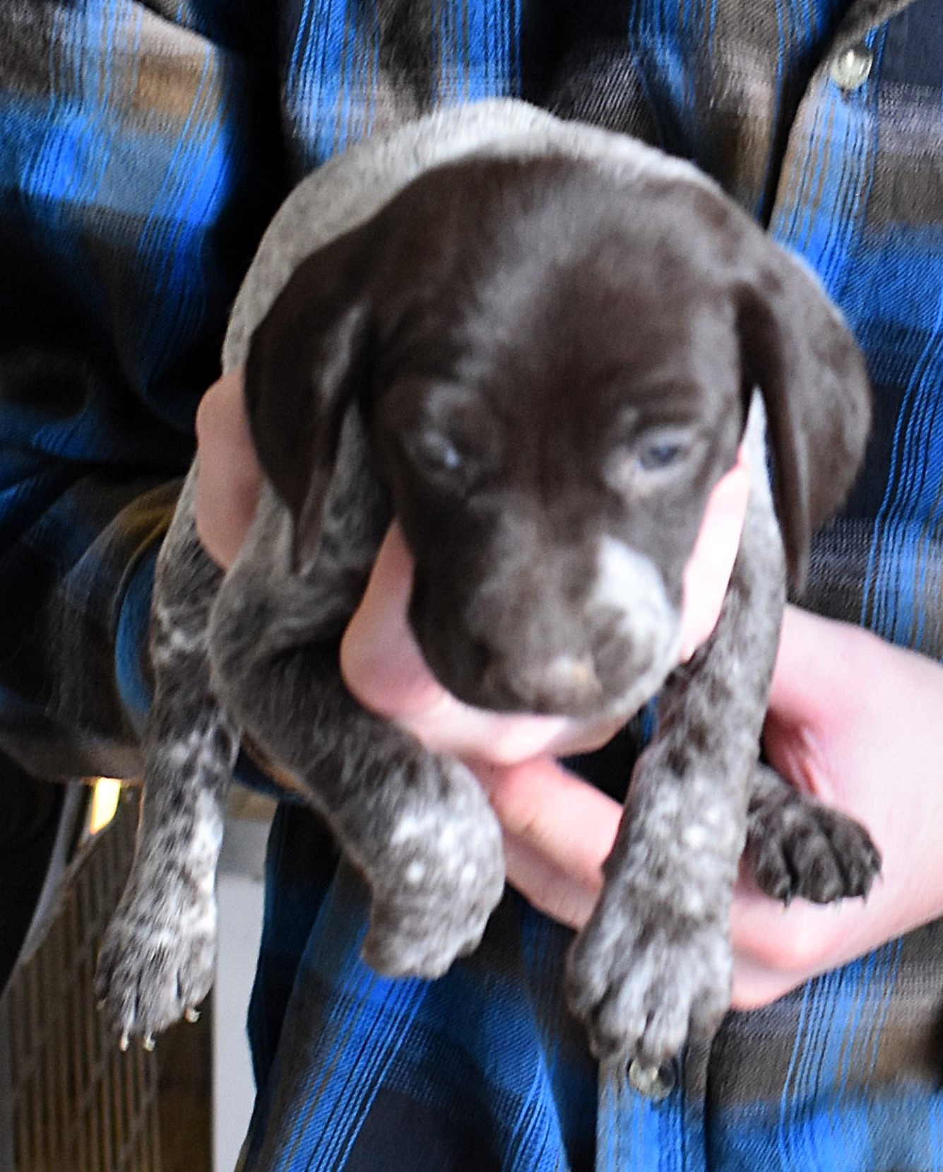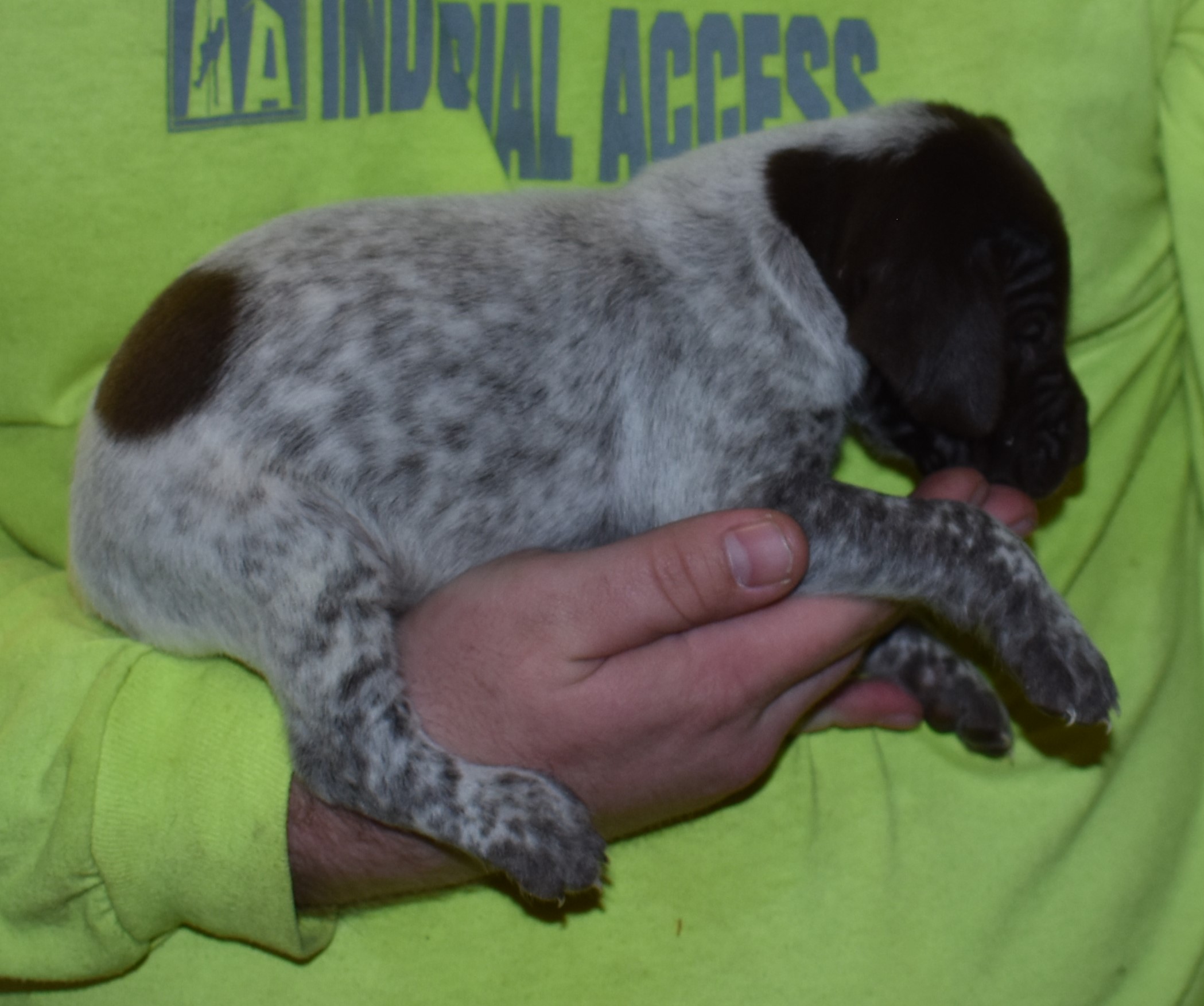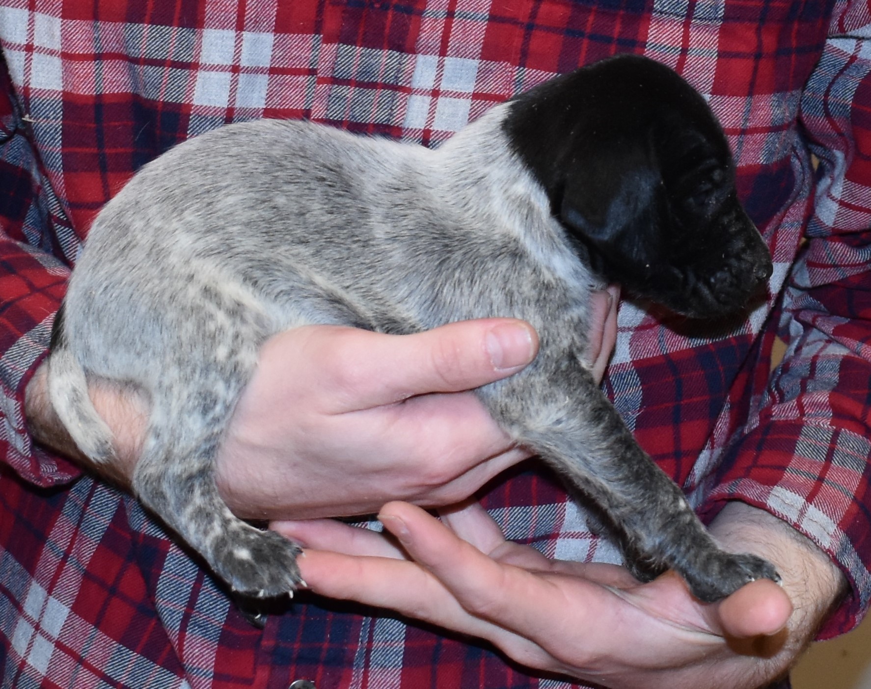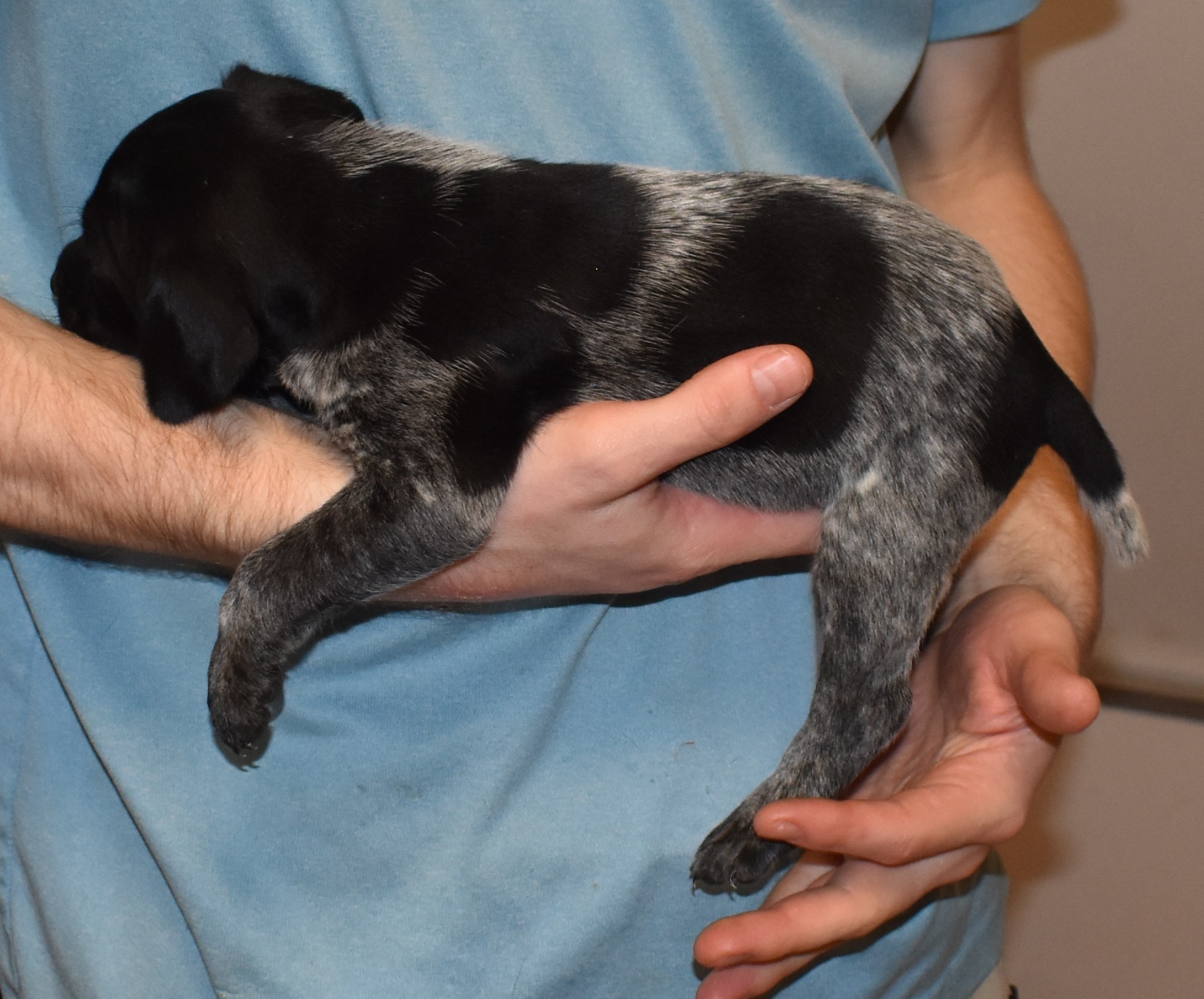 We have B-Atlas M2, a striking liver roan male GSP pup from Bailey and Atlas. As he grows, his white will develop into a roan/patched pattern. Bailey, the dam, is from some of the best GSP genetics in the country and the sire, Atlas, is a European import with a Deutsch Keuzar title. This litter will produce intelligent, beautiful companions and exceptional hunting dogs. Thanks to Cora for putting a deposit down to get this beautiful boy.