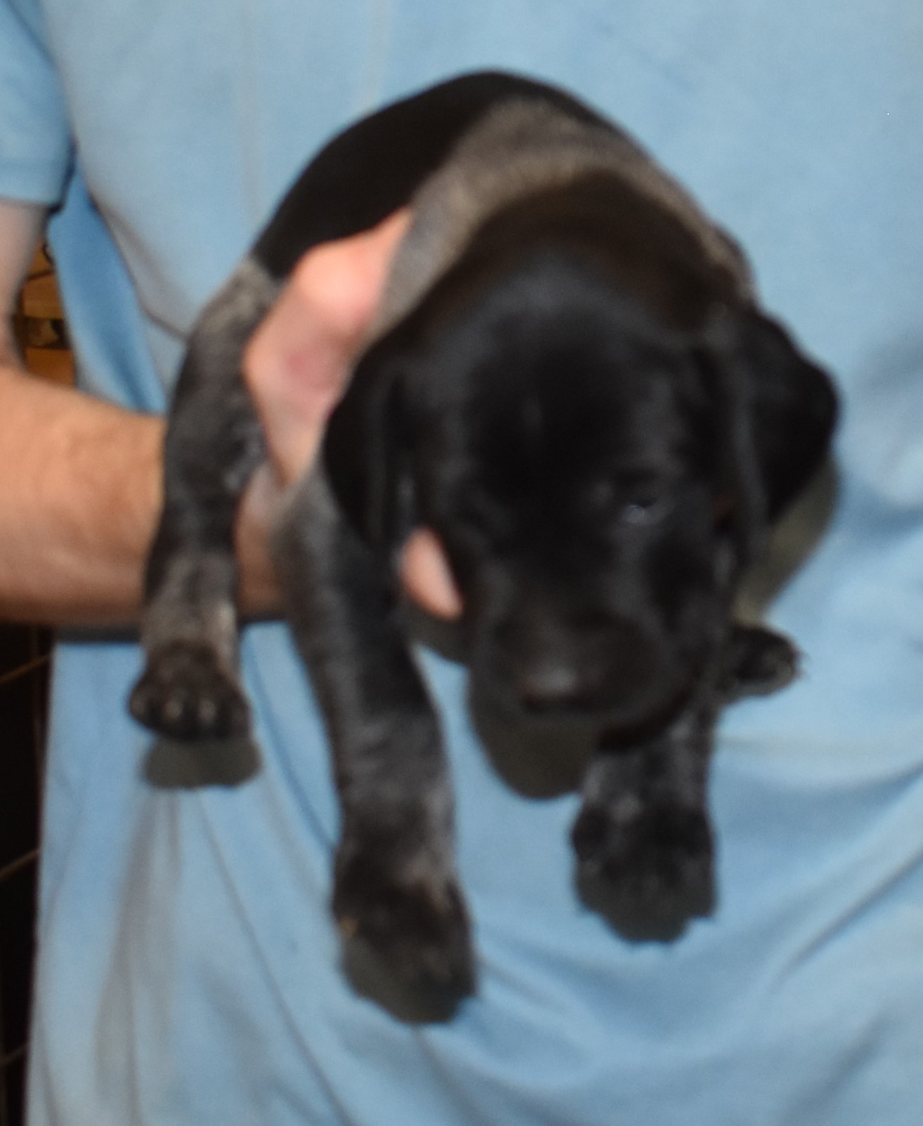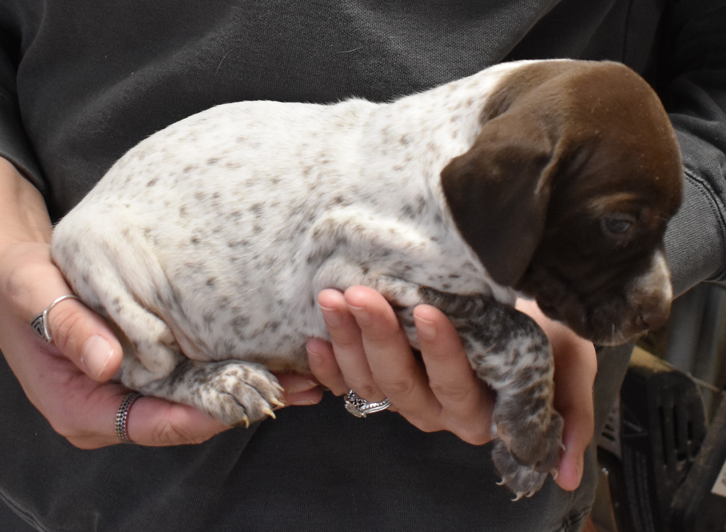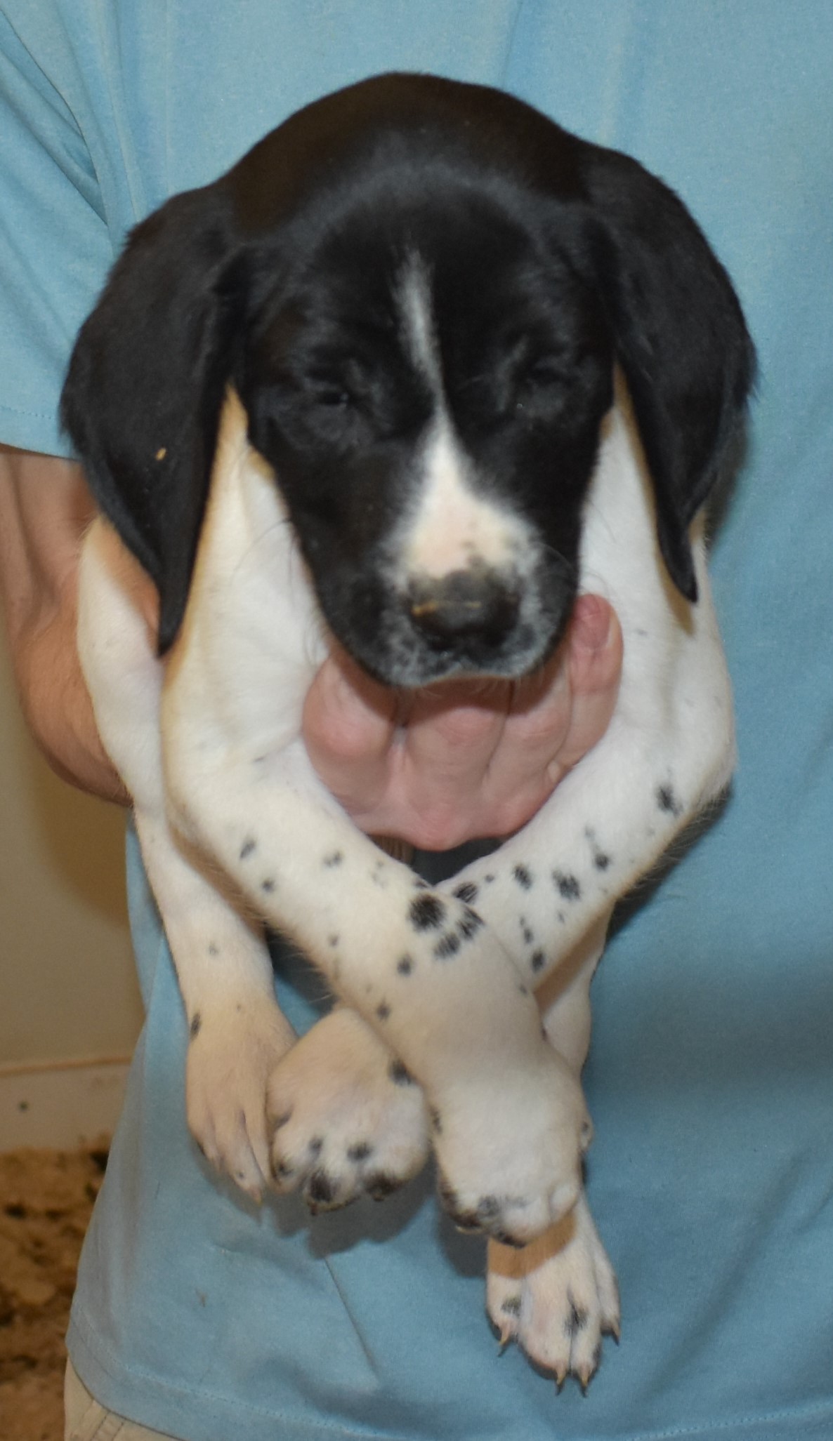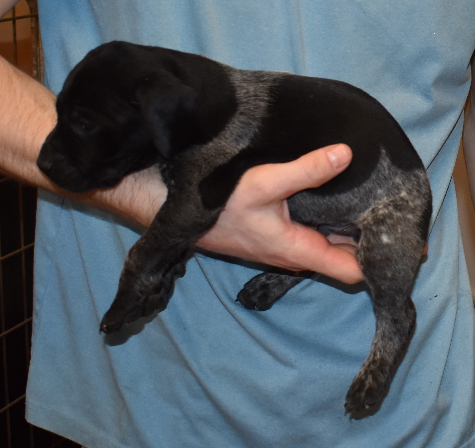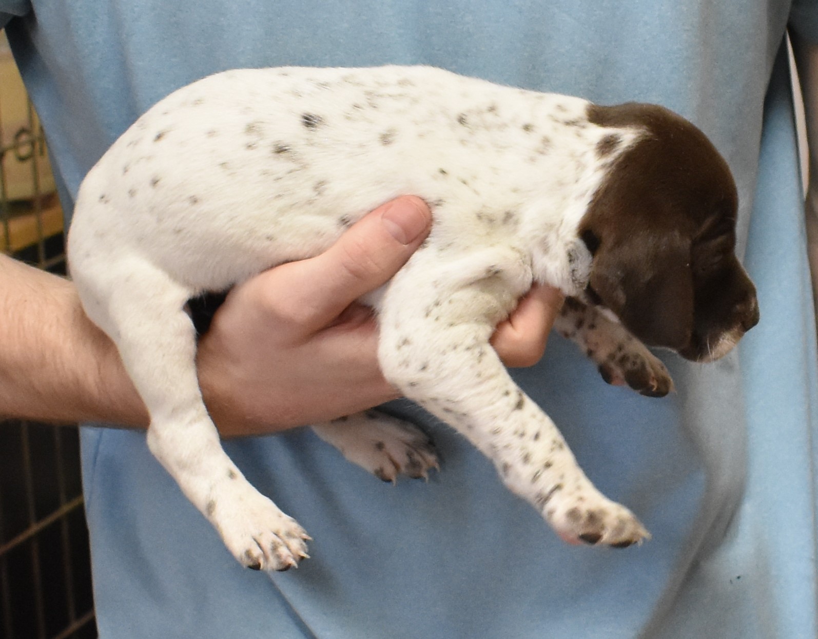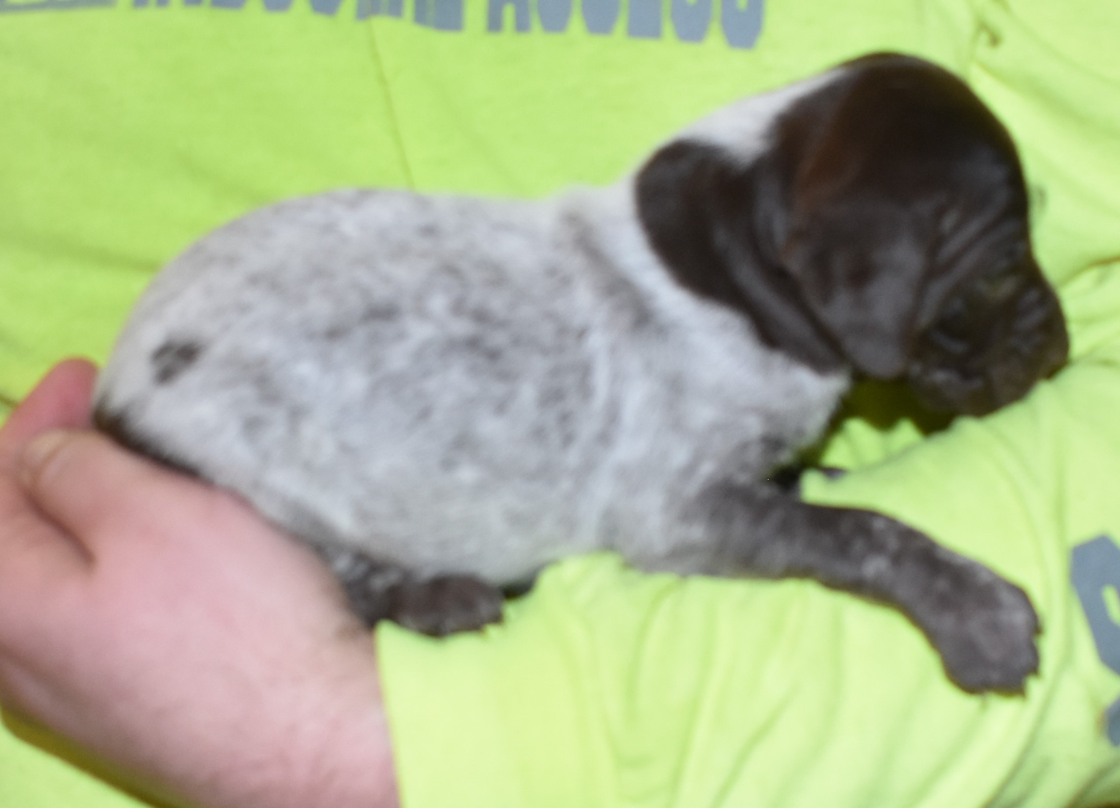 We have B-Atlas M2, a striking liver roan male GSP pup from Bailey and Atlas. As he grows, his white will develop into a roan/patched pattern. Bailey, the dam, is from some of the best GSP genetics in the country and the sire, Atlas, is a European import with a Deutsch Keuzar title. This litter will produce intelligent, beautiful companions and exceptional hunting dogs. Thanks to Cora for putting a deposit down to get this beautiful boy.