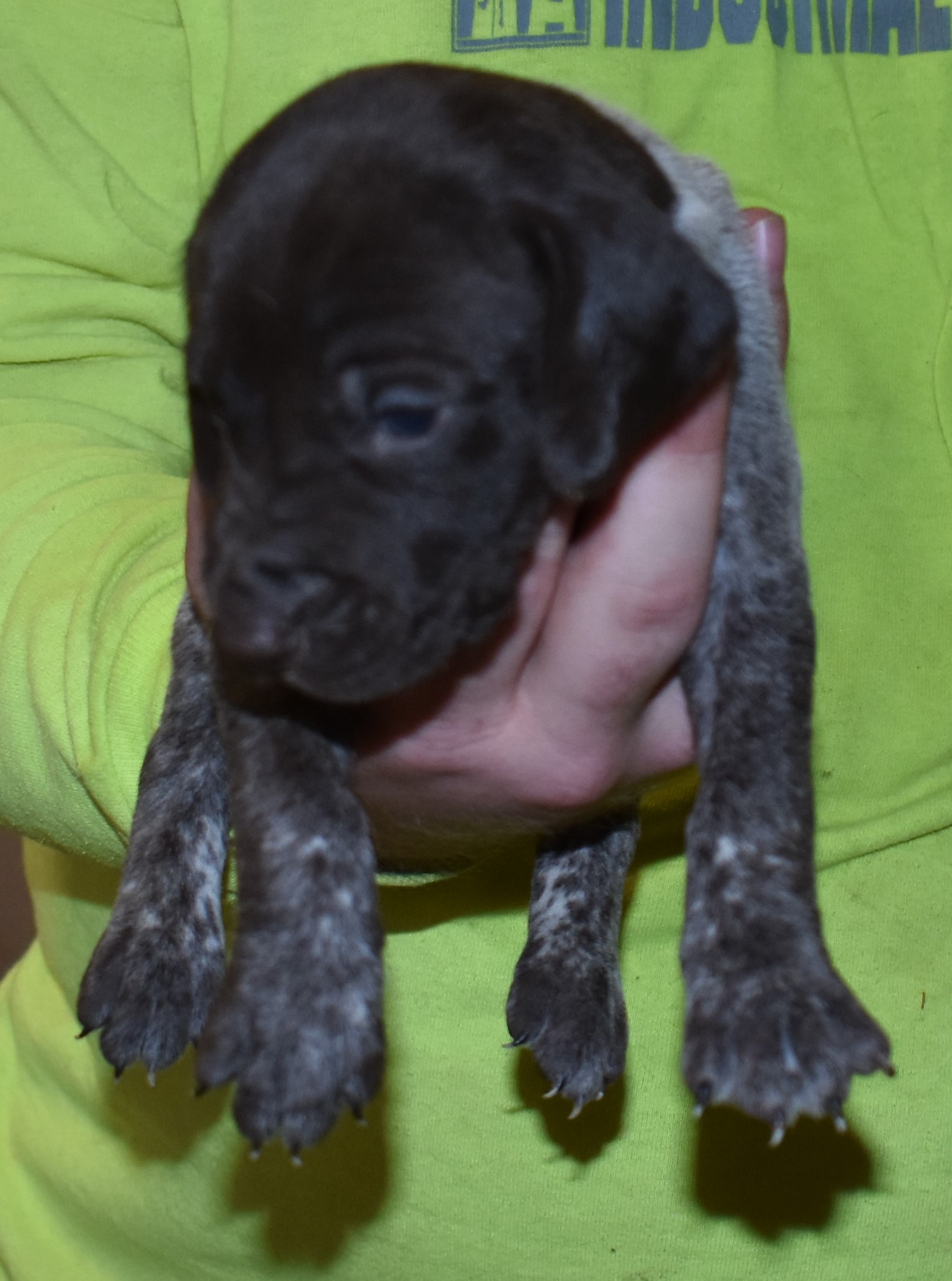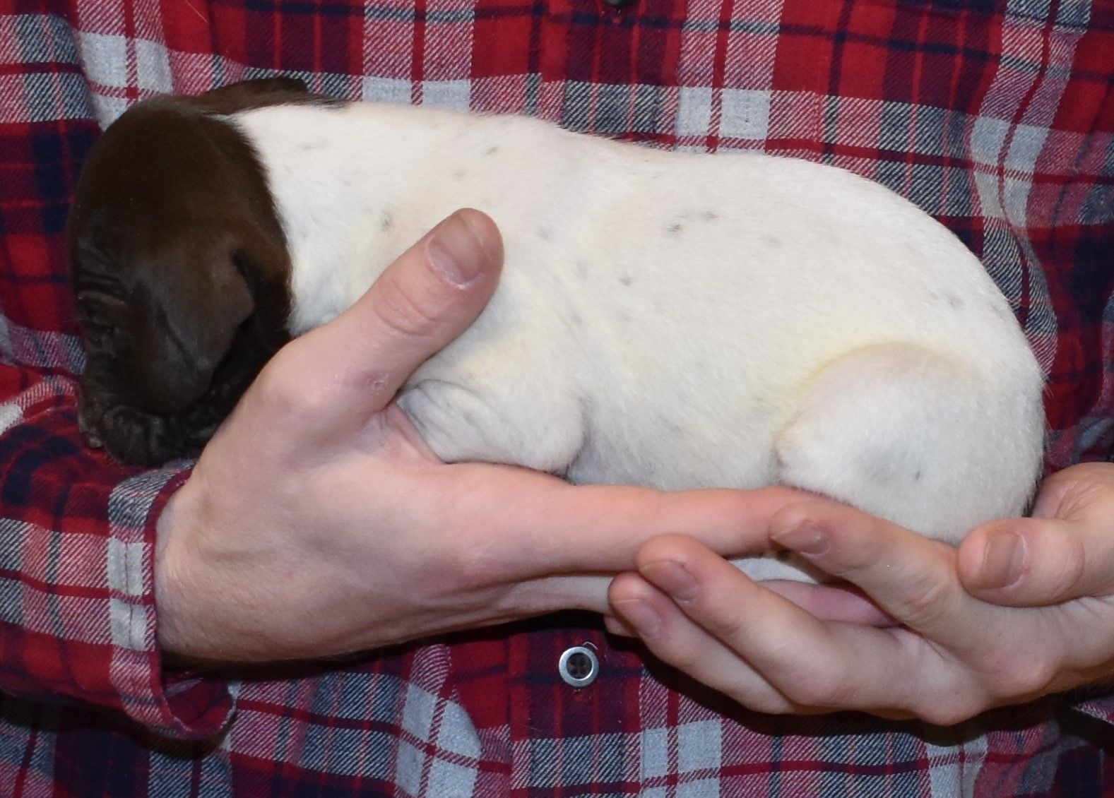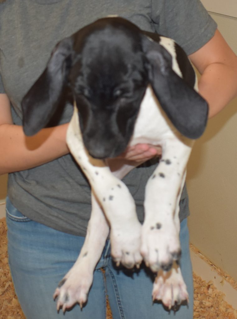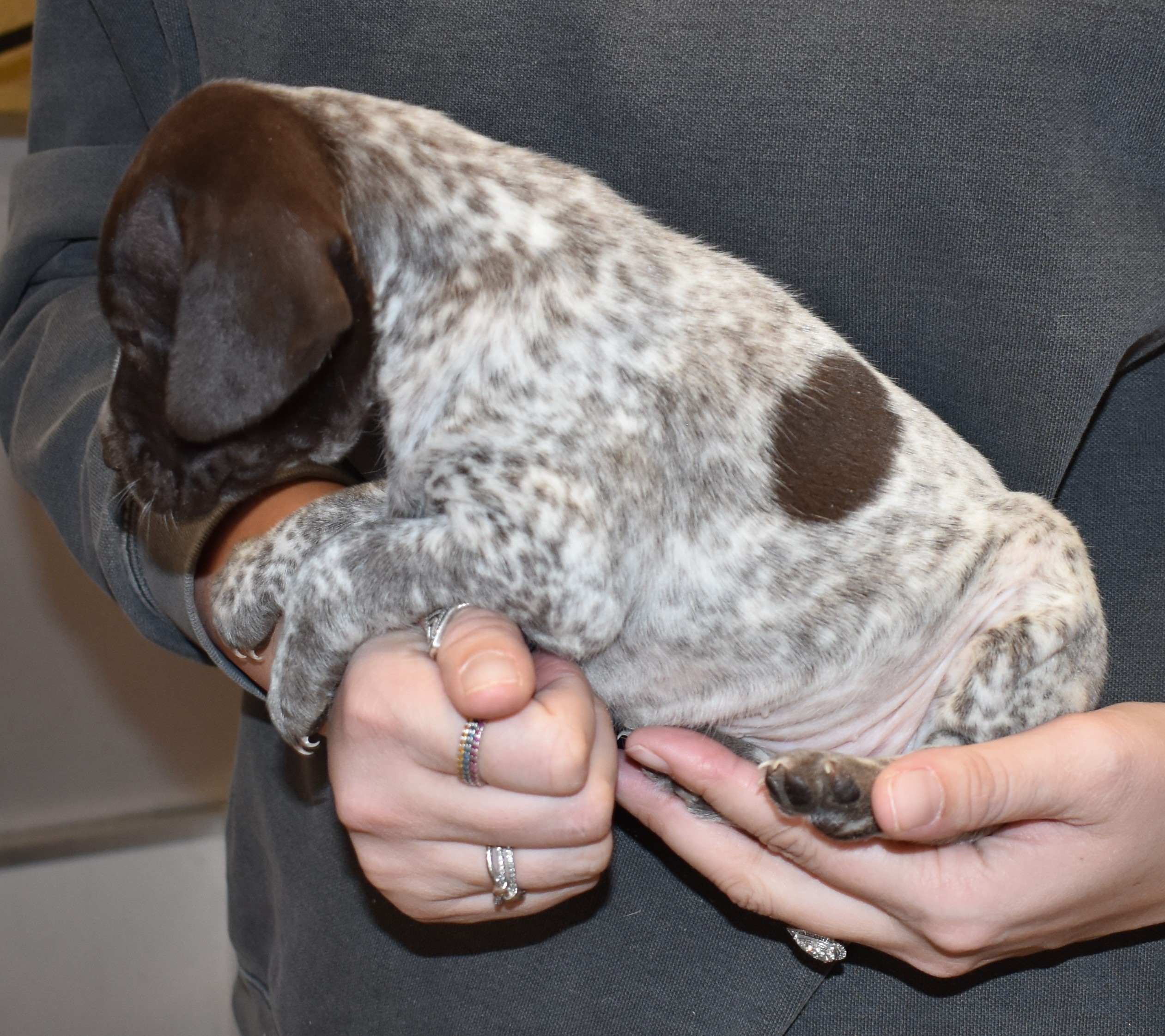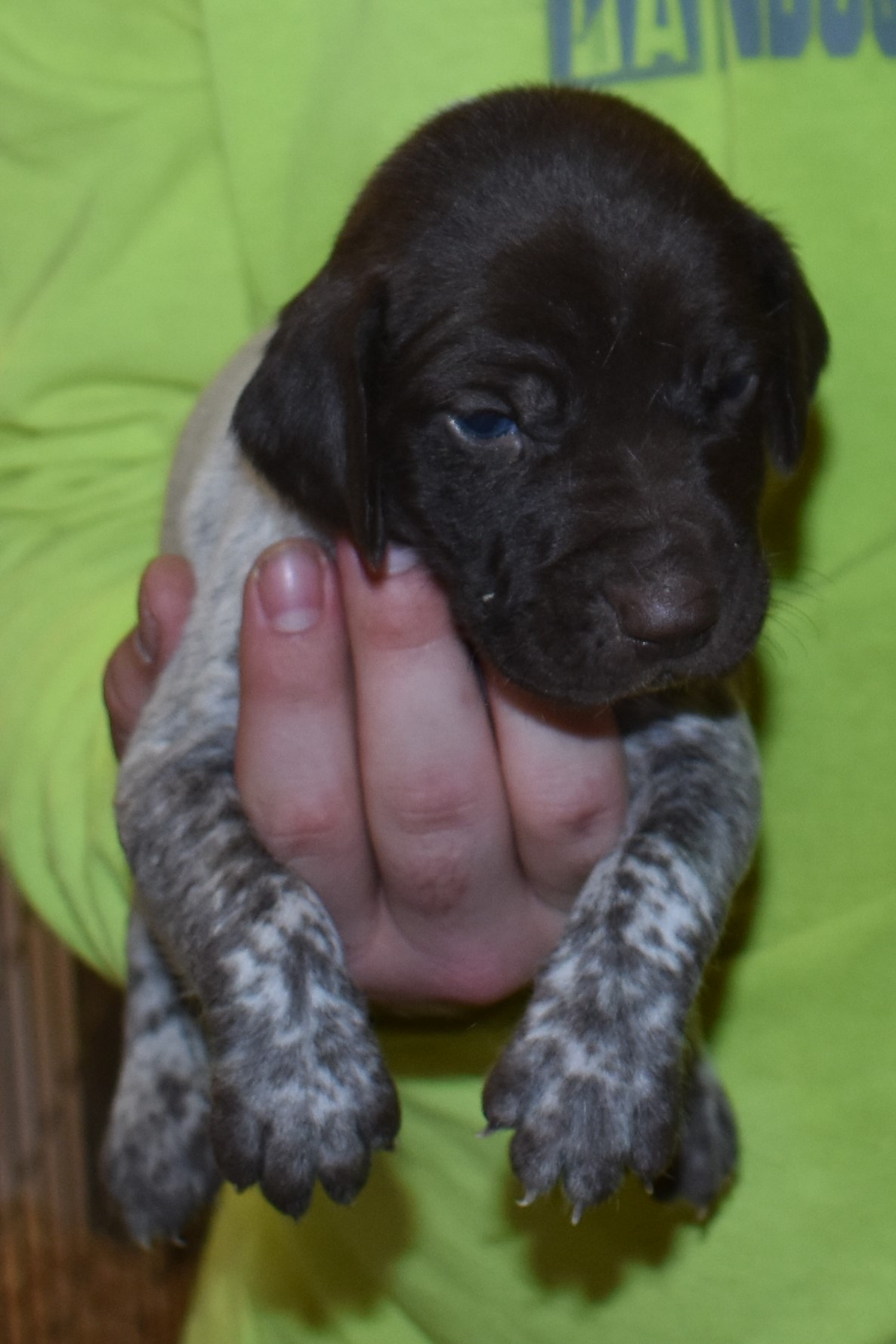 We have B-Atlas M2, a striking liver roan male GSP pup from Bailey and Atlas. As he grows, his white will develop into a roan/patched pattern. Bailey, the dam, is from some of the best GSP genetics in the country and the sire, Atlas, is a European import with a Deutsch Keuzar title. This litter will produce intelligent, beautiful companions and exceptional hunting dogs. Thanks to Cora for putting a deposit down to get this beautiful boy.