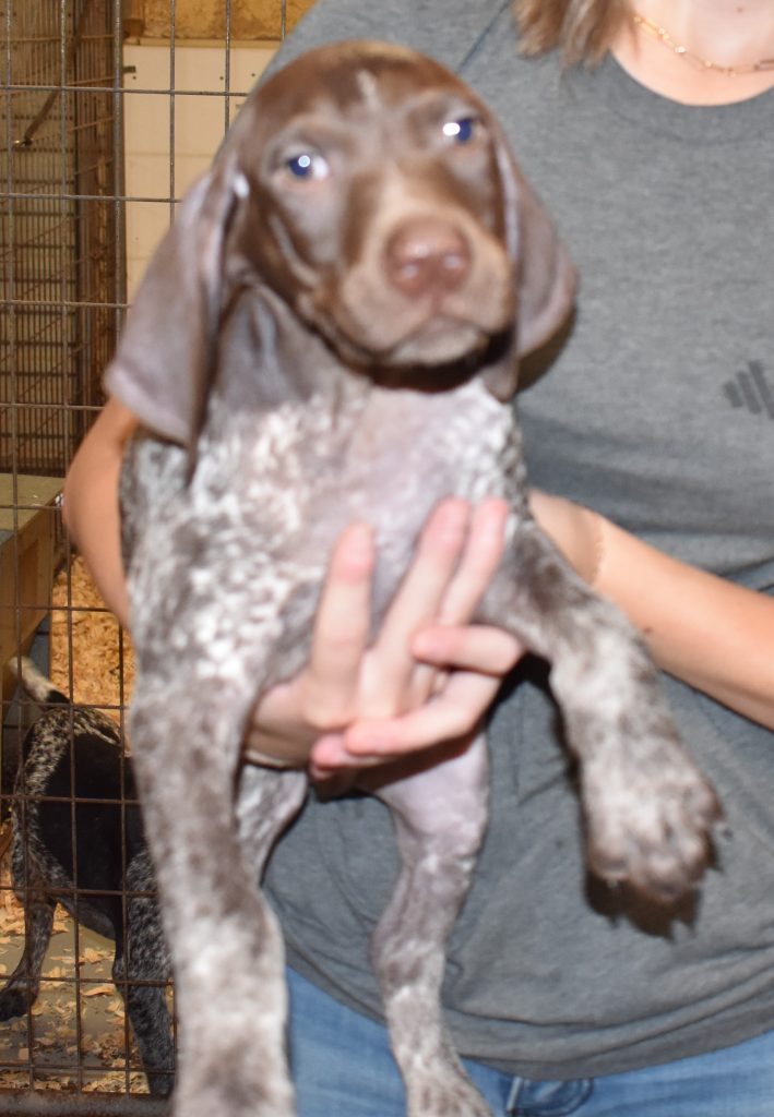 A-Macey F2 is available. She is gorgeous from Macey and Atlas. The sire is a European import with the Deutsch Keuzar designation. The dam is from a long line of great GSPs on the dam side and the sire’s side. These pups will be great companions and great in the field. The pup’s body is going to be liver ticked and roan and get darker as she grows. She is a great looking pup with a mostly liver head. Adam H will get this sweet girl. She will be a great addition to the family.