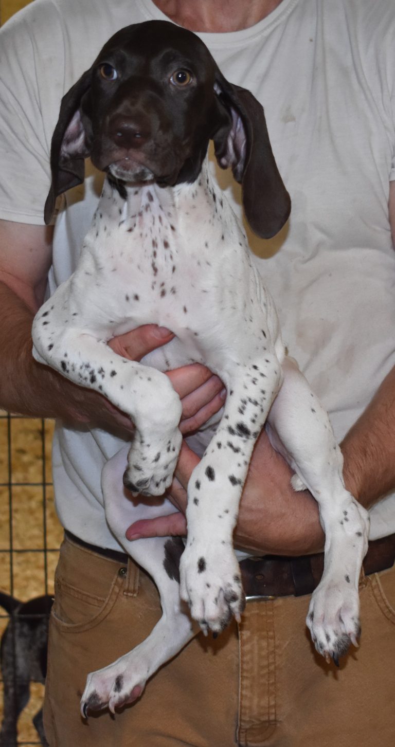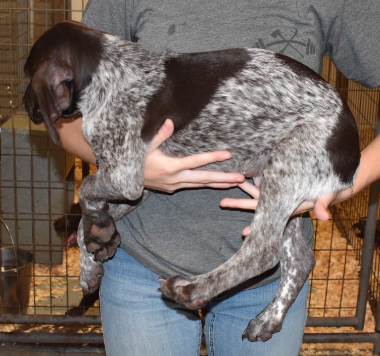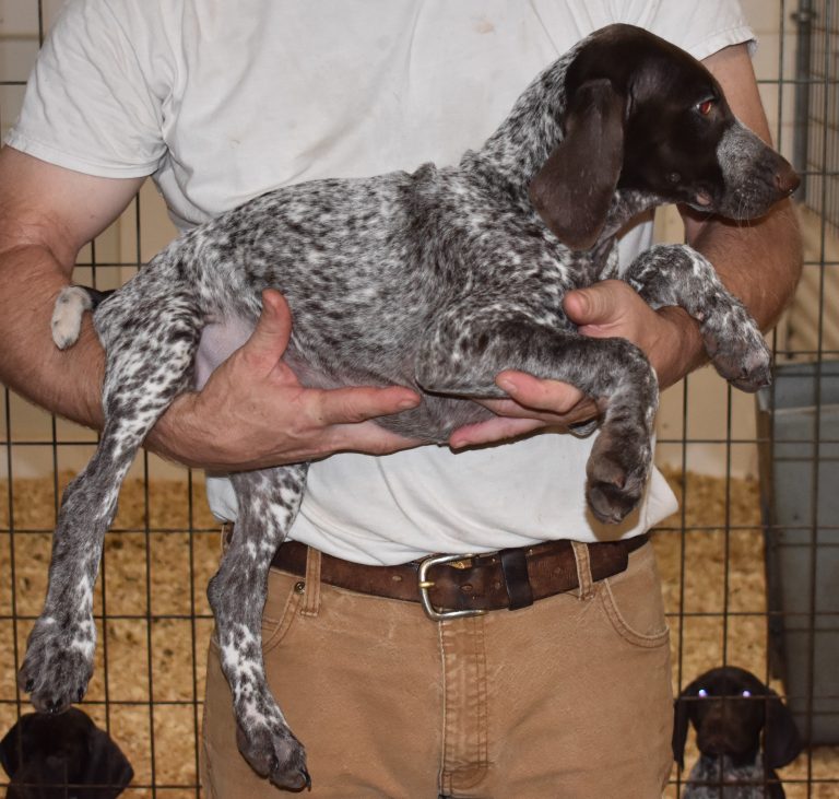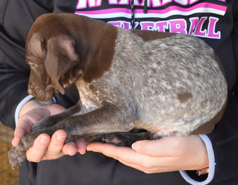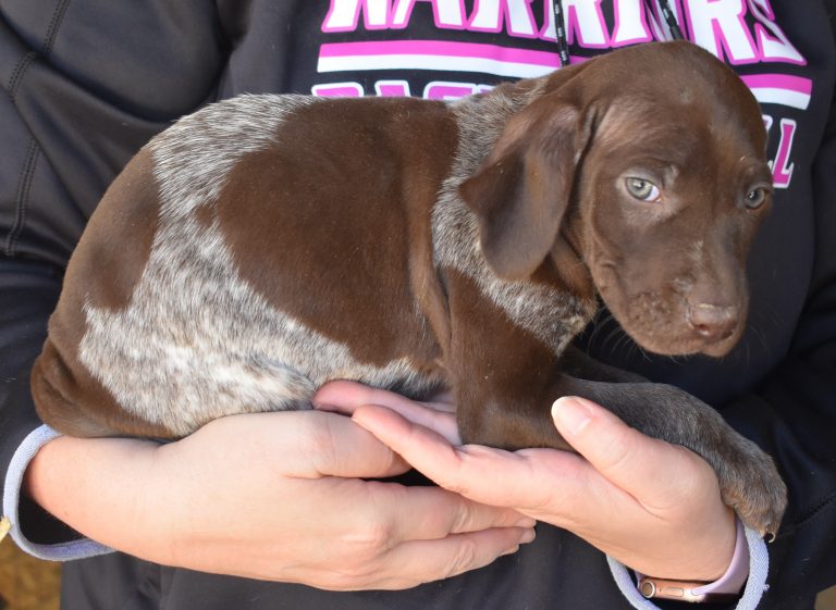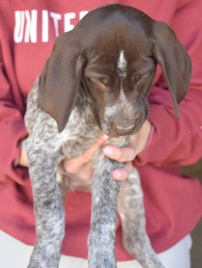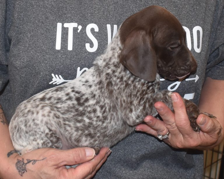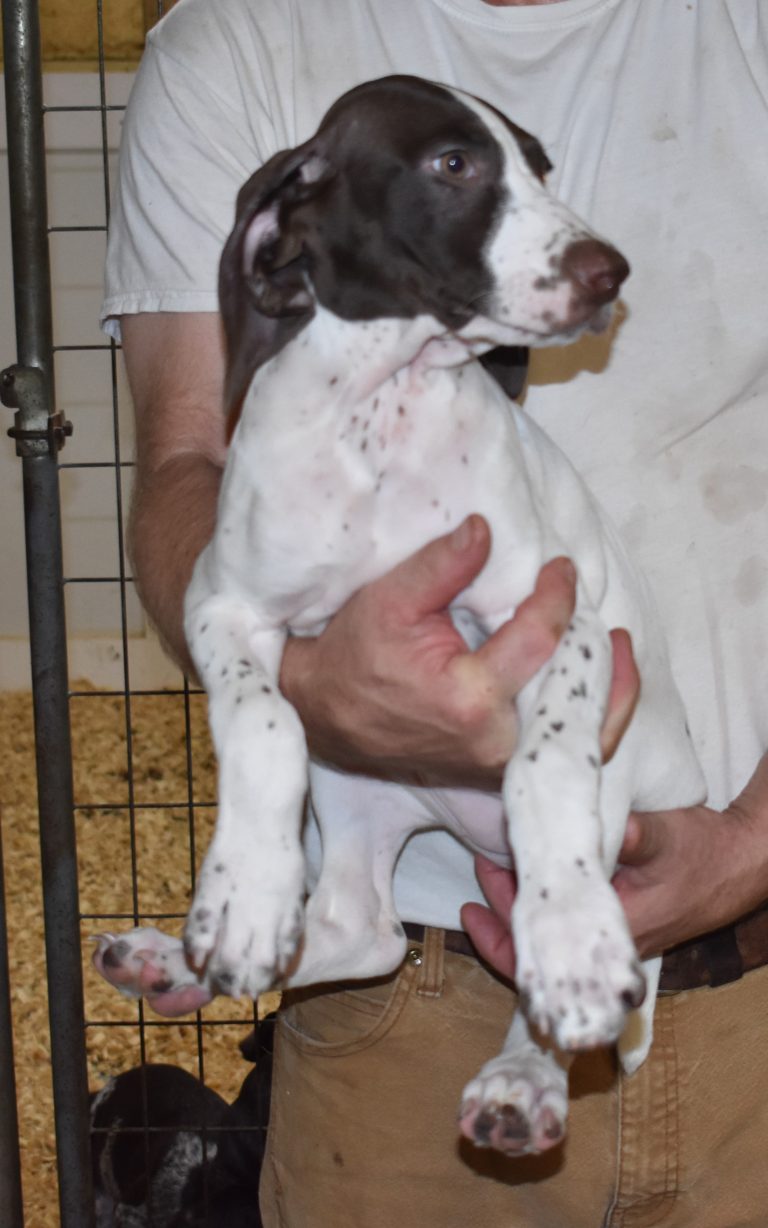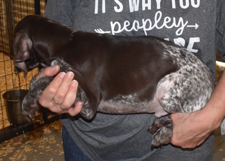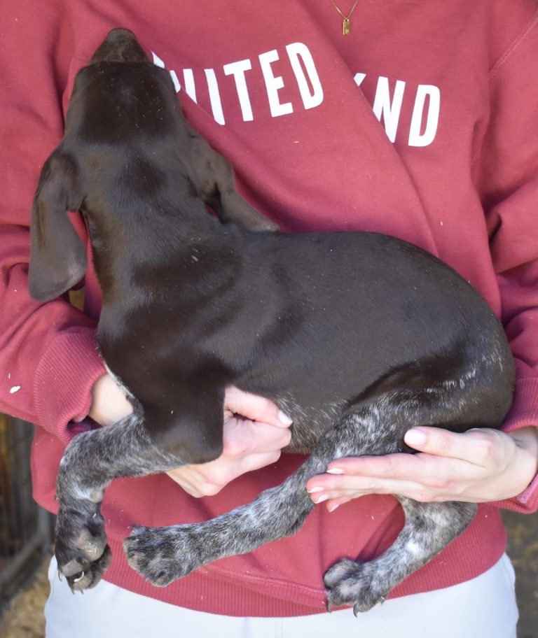 A-Maggie F1 is available. She is a beautiful pup. Her body is liver patched and roan with a couple of large patches. She is a great looking pup with a solid liver head. She was born to Maggie and Atlas on 1/21/26. Maggie is the daughter of the great one, Ruger. This pup is also the daughter of great hunting lines on the sire’s side who is Deutsch Kurzhaar import. Previous litters have strong hunting instincts and a pleasing personality. She will be available to go to her new home after 3/4/26. She is $2500 with breeding rights.