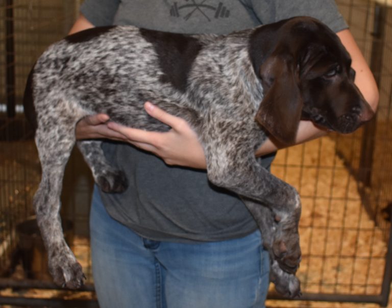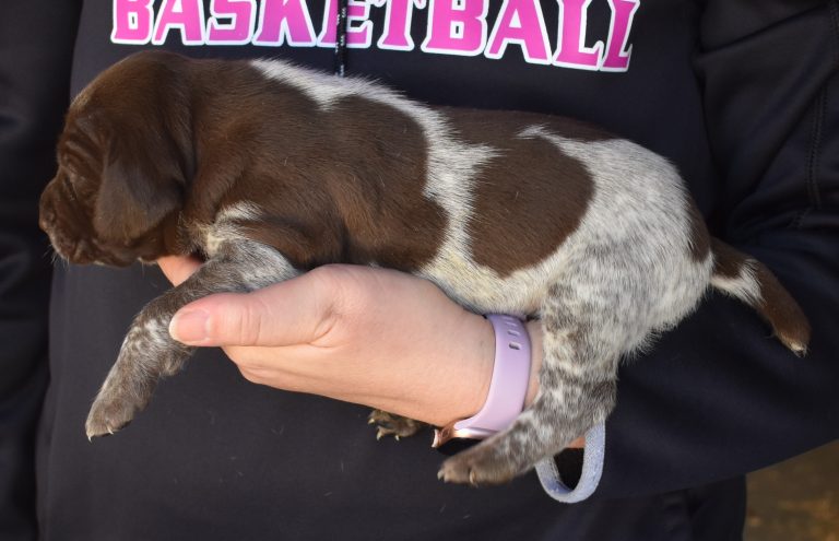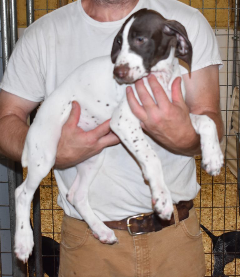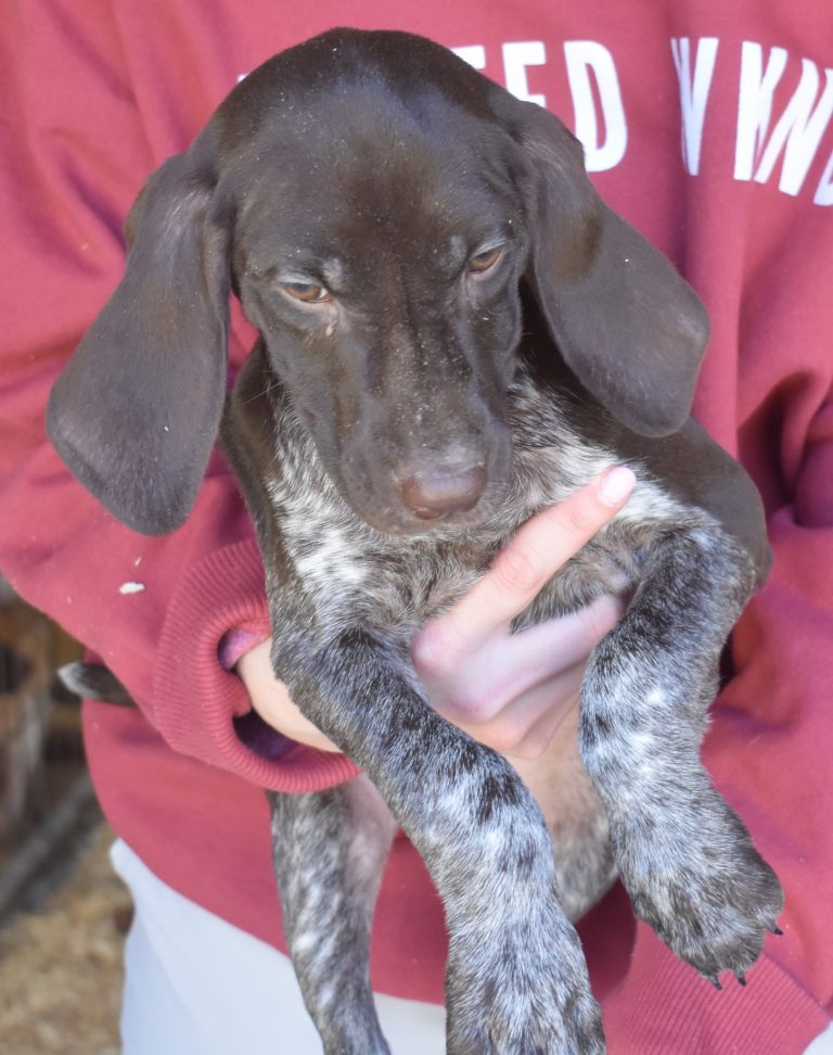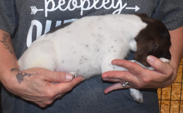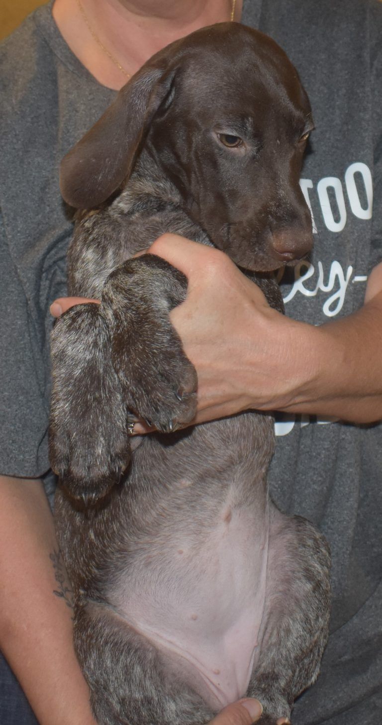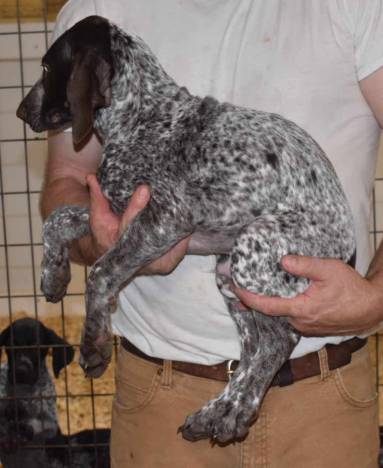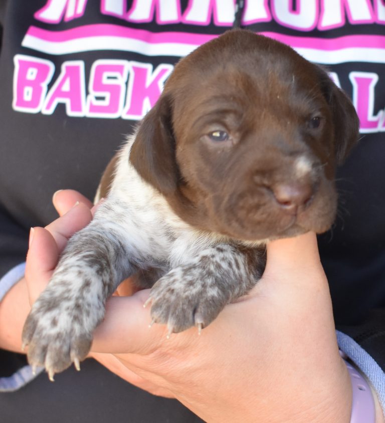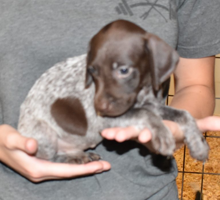 A-Maggie F1 is available. She is a beautiful pup. Her body is liver patched and roan with a couple of large patches. She is a great looking pup with a solid liver head. She was born to Maggie and Atlas on 1/21/26. Maggie is the daughter of the great one, Ruger. This pup is also the daughter of great hunting lines on the sire’s side who is Deutsch Kurzhaar import. Previous litters have strong hunting instincts and a pleasing personality. She will be available to go to her new home after 3/4/26. She is $2500 with breeding rights.