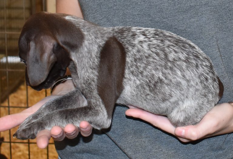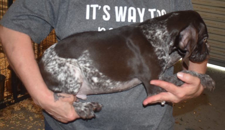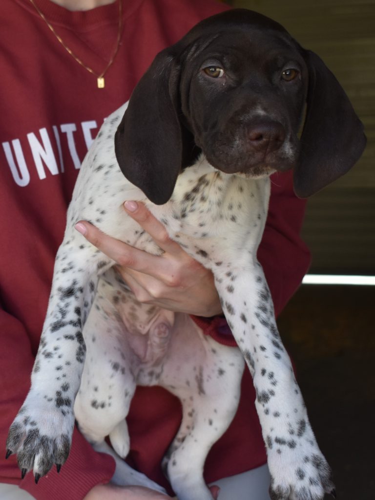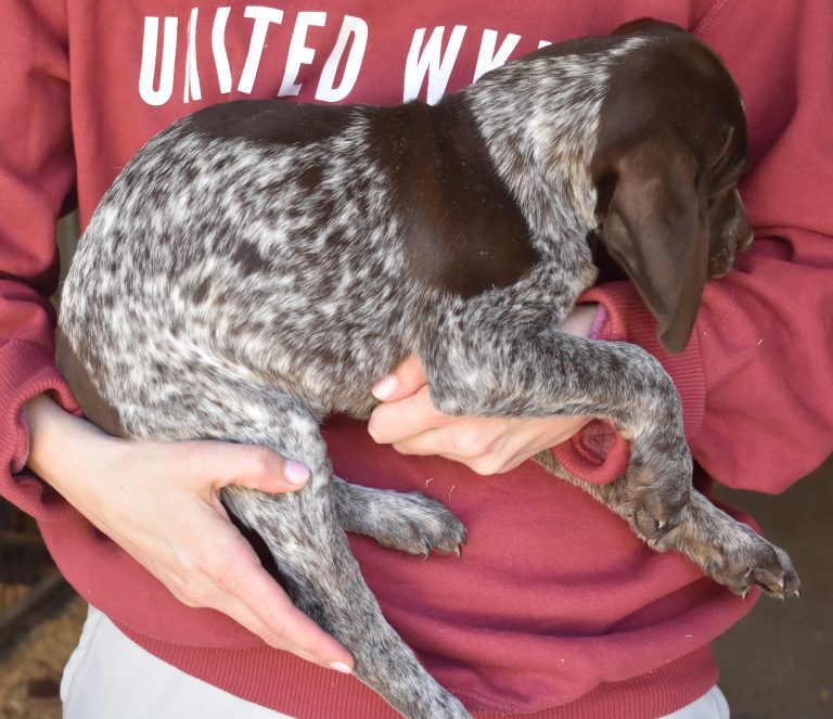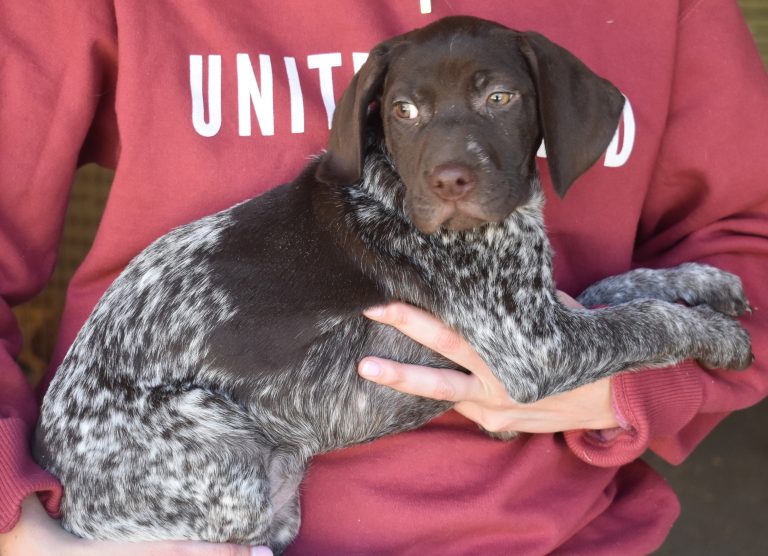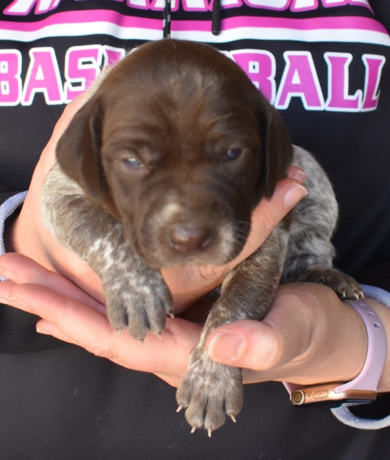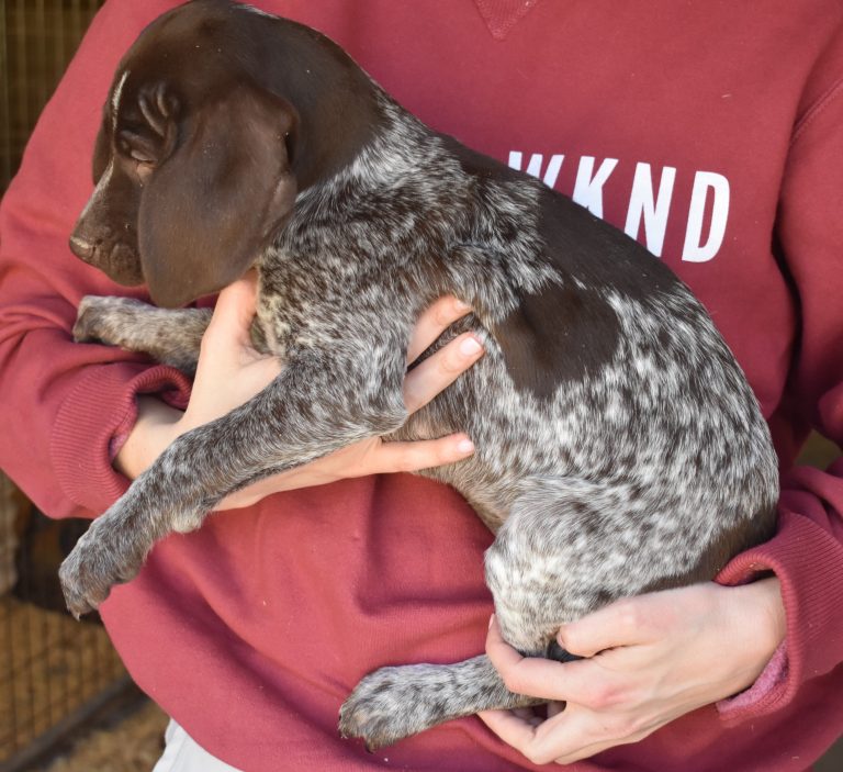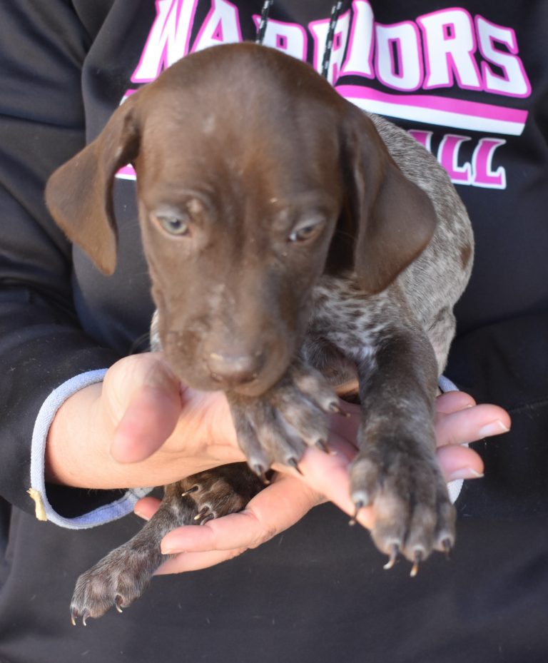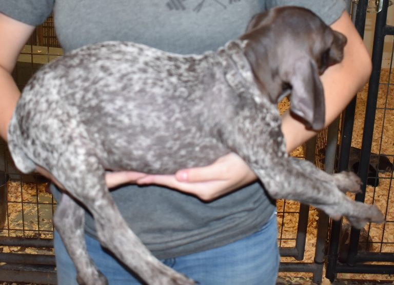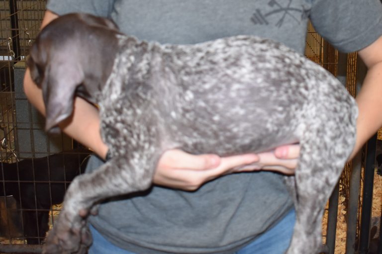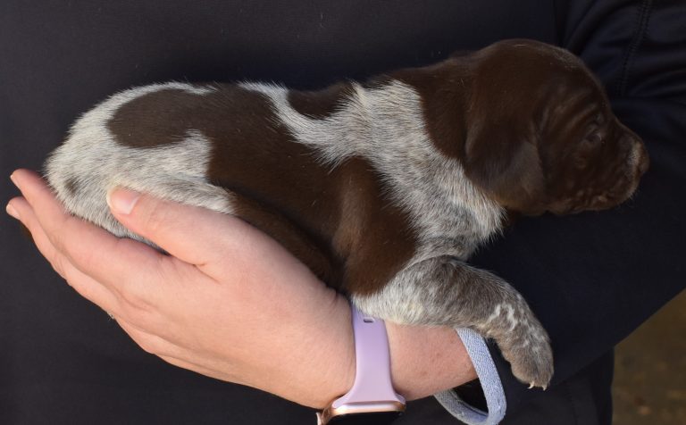 A-Maggie F1 is available. She is a beautiful pup. Her body is liver patched and roan with a couple of large patches. She is a great looking pup with a solid liver head. She was born to Maggie and Atlas on 1/21/26. Maggie is the daughter of the great one, Ruger. This pup is also the daughter of great hunting lines on the sire’s side who is Deutsch Kurzhaar import. Previous litters have strong hunting instincts and a pleasing personality. She will be available to go to her new home after 3/4/26. She is $2500 with breeding rights.