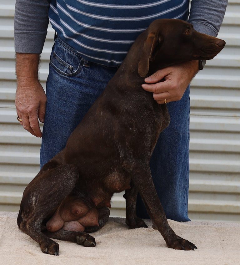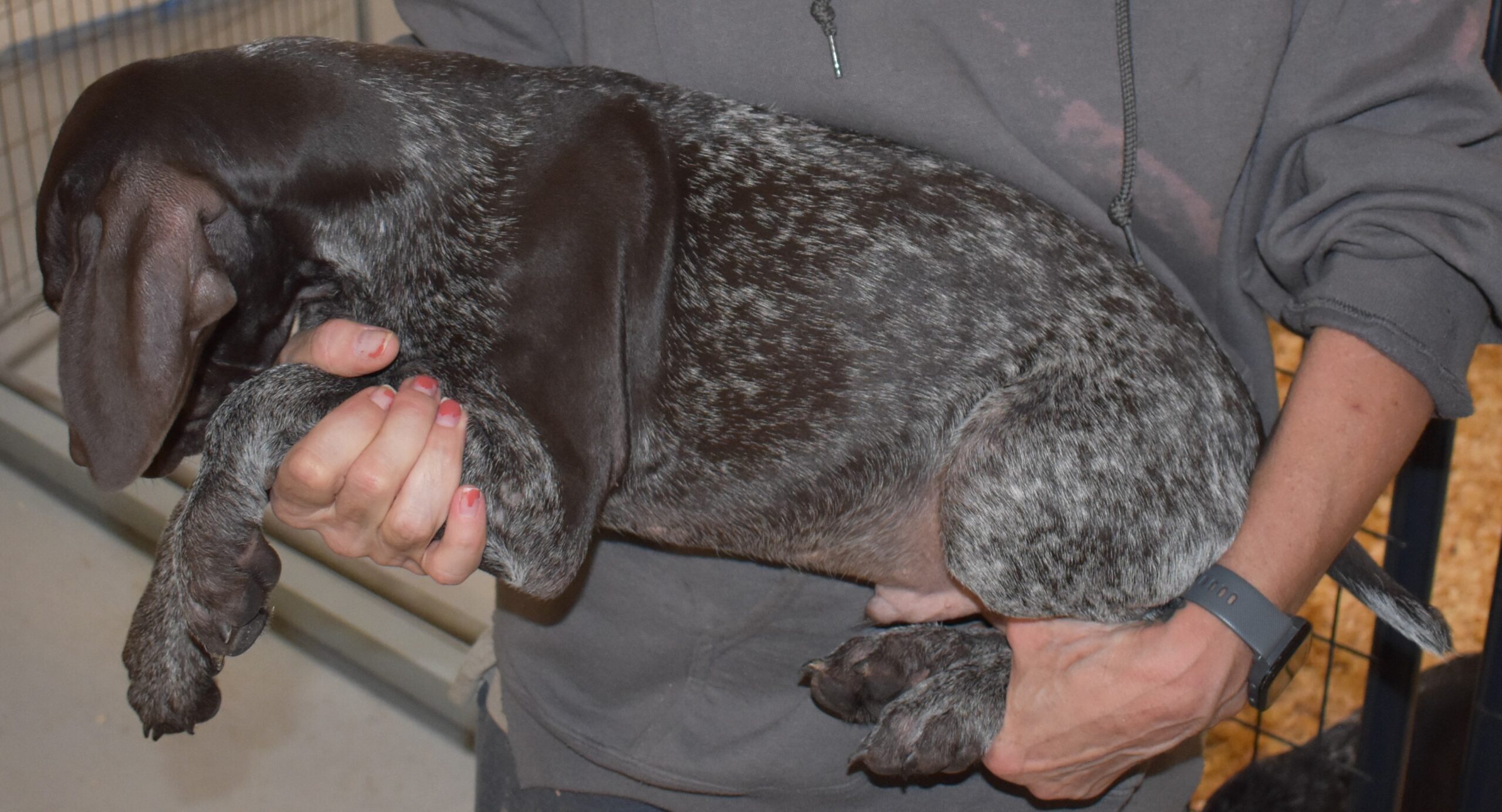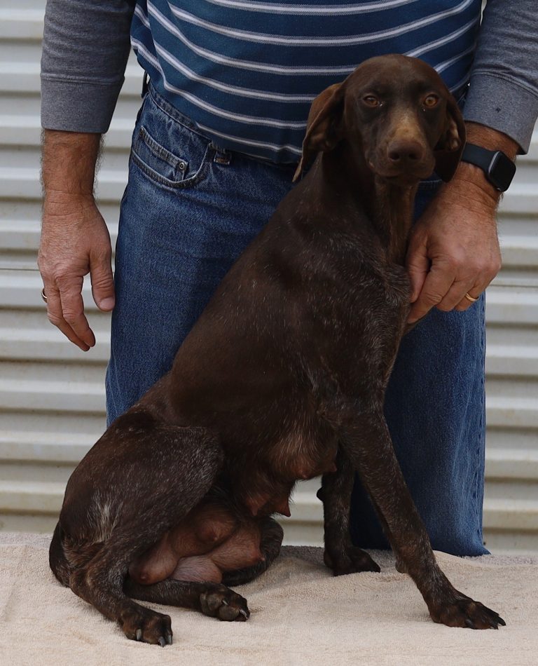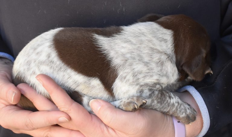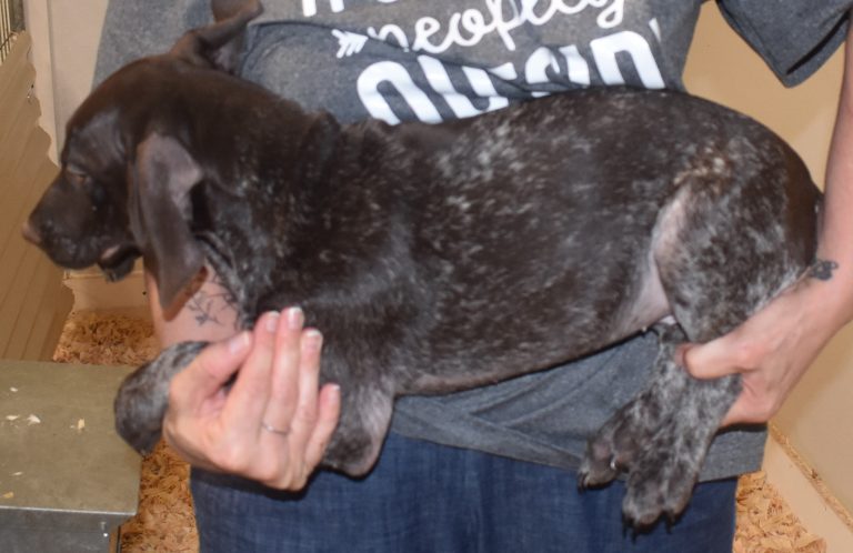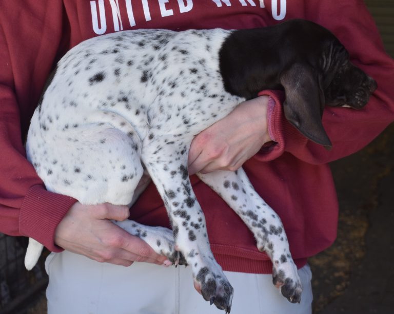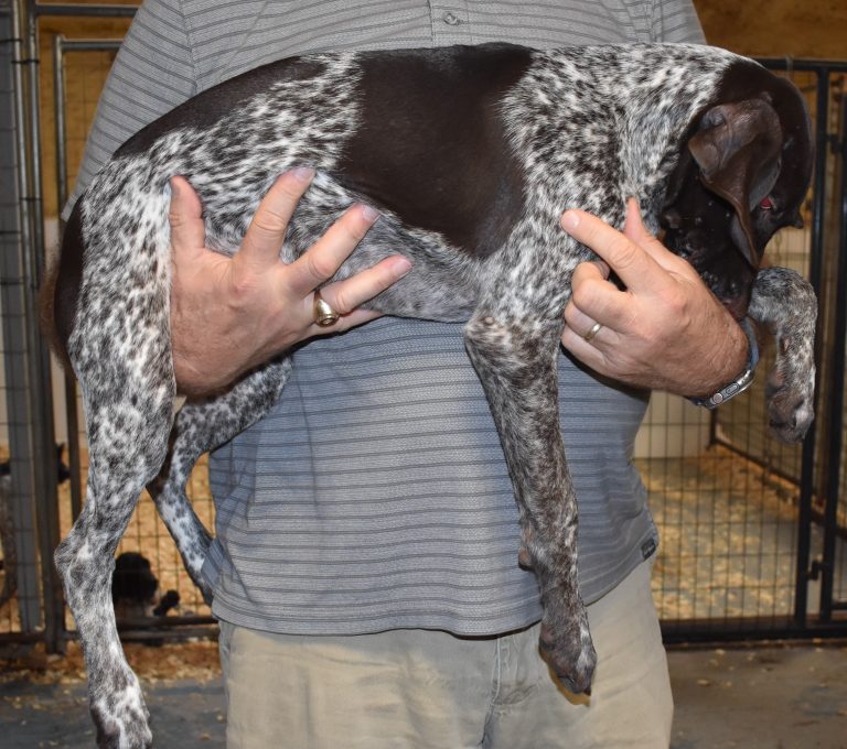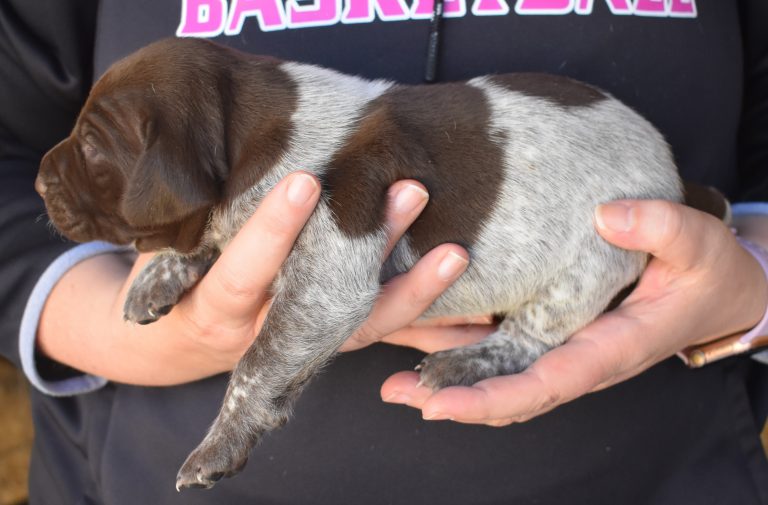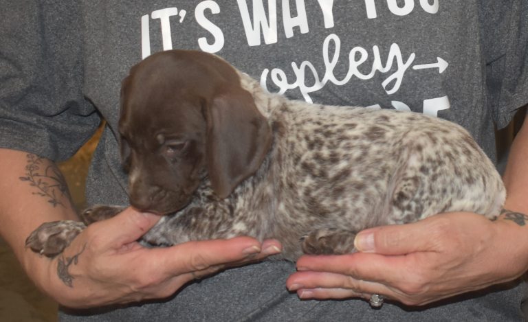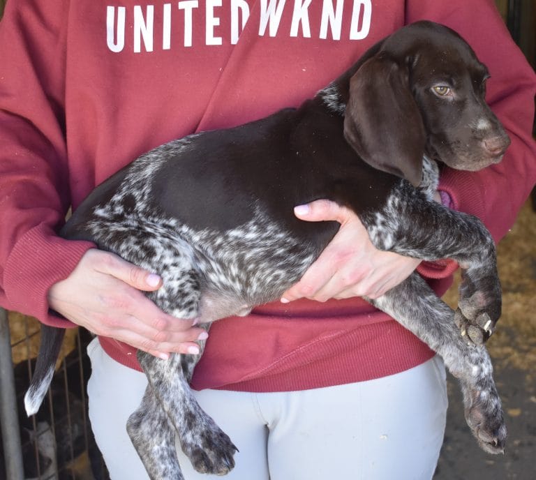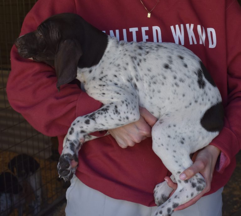 A-Maggie F1 is available. She is a beautiful pup. Her body is liver patched and roan with a couple of large patches. She is a great looking pup with a solid liver head. She was born to Maggie and Atlas on 1/21/26. Maggie is the daughter of the great one, Ruger. This pup is also the daughter of great hunting lines on the sire’s side who is Deutsch Kurzhaar import. Previous litters have strong hunting instincts and a pleasing personality. She will be available to go to her new home after 3/4/26. She is $2500 with breeding rights.