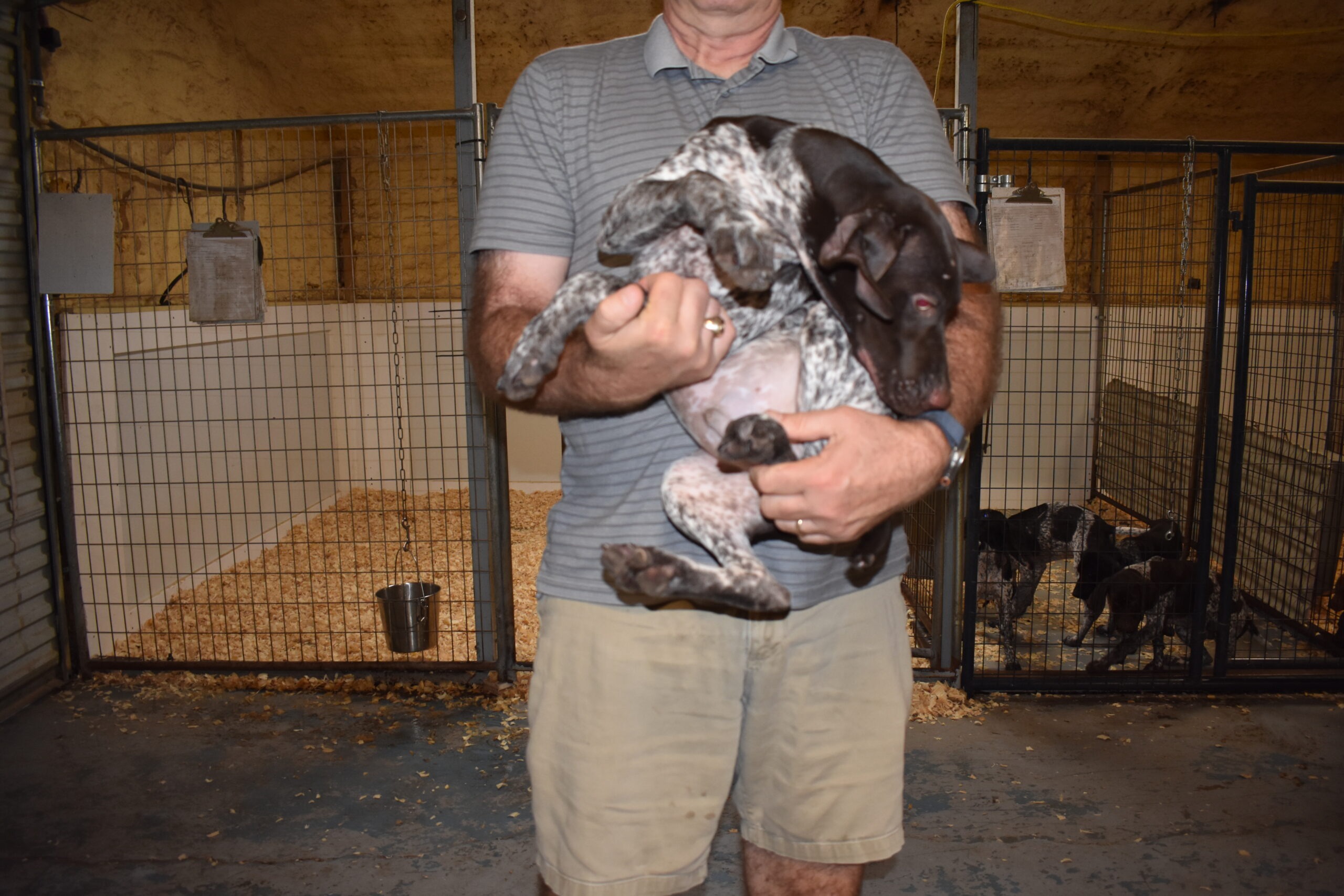 A-Bailey F1 is available. She is gorgeous from Bailey and Atlas. The sire is a European import with the Deutsch Keuzar. The dam is from a long line of great GSPs on the dam side and the sire’s side. These pups will be great companions and great in the field. The pup’s body is liver roan. She is a great looking pup with a mostly liver head. Susan and Bill made a trip out to choose this beautiful girl. She will be a great pup for you I know.