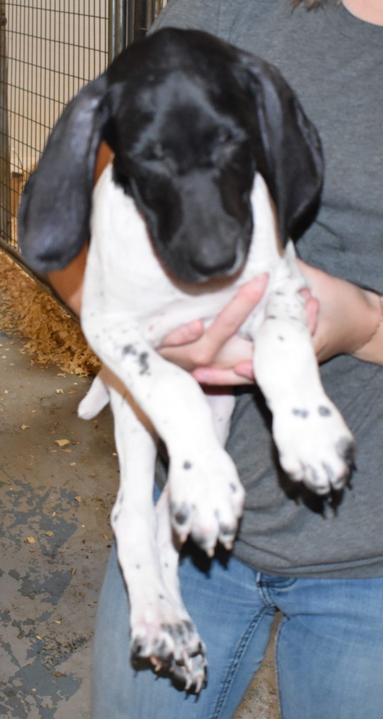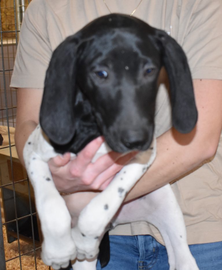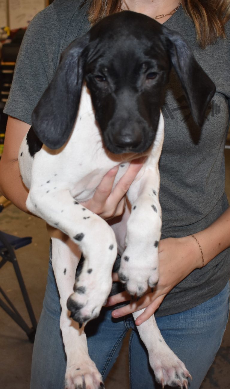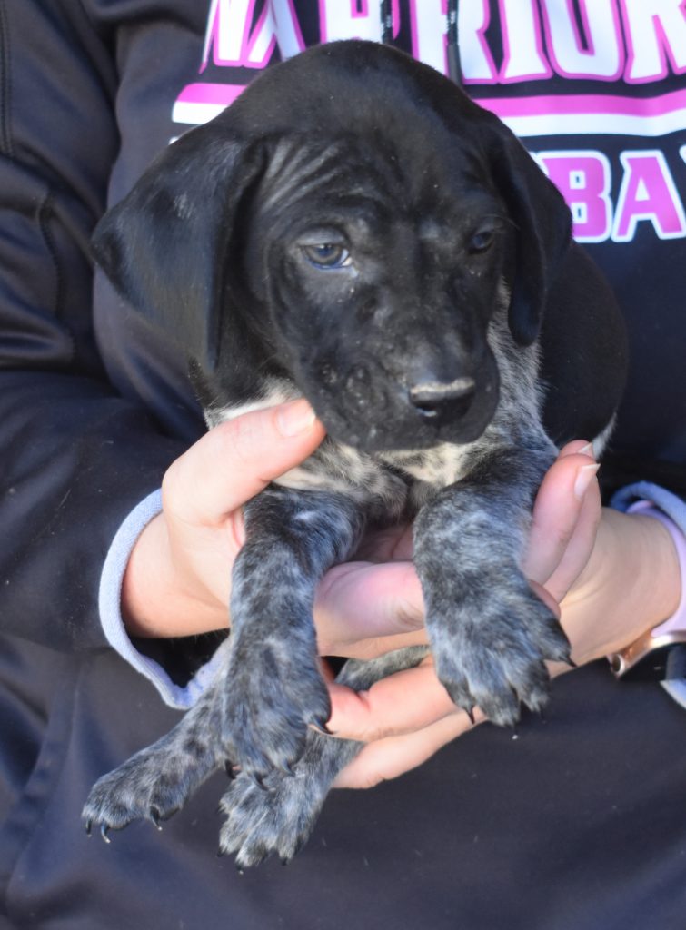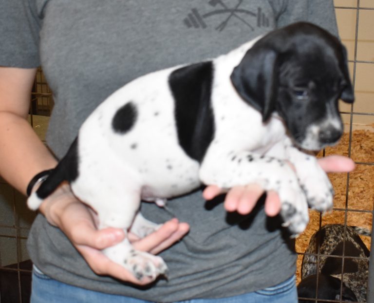 A-Maggie F4 is available. She is a beautiful pup. Her body is black patched and ticked with a couple of large patches. She is a great looking pup with a solid black head. She was born to Maggie and Deuce on 1/21/26. Maggie is the daughter of the great one, Ruger. This pup is also the daughter of great hunting lines on the sire’s side. The sire is the son of a top 5 field trial dog in the country. Previous litters have strong hunting instincts and a pleasing personality. She will be available to go to her new home after 3/4/26. She is $2500 with breeding rights.