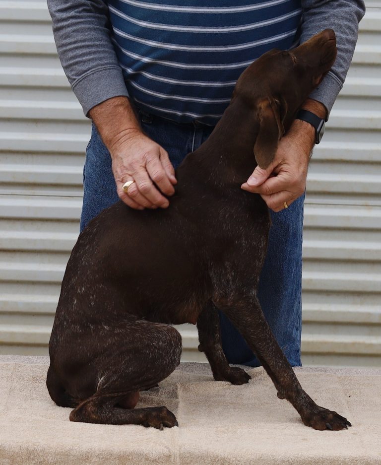 A-Macey F4 is available. She is gorgeous from Macey and Atlas. The sire is a European import with the Deutsch Keuzar. The dam is from a long line of great GSPs on the dam side and the sire’s side. These pups will be great companions and great in the field. The pup’s body is liver roan. She is a great looking pup with a mostly liver head. Crystal brought Ron and Hazel (a previous pup of ours) out to choose “her” pup. This sweet girl will make a great addition.