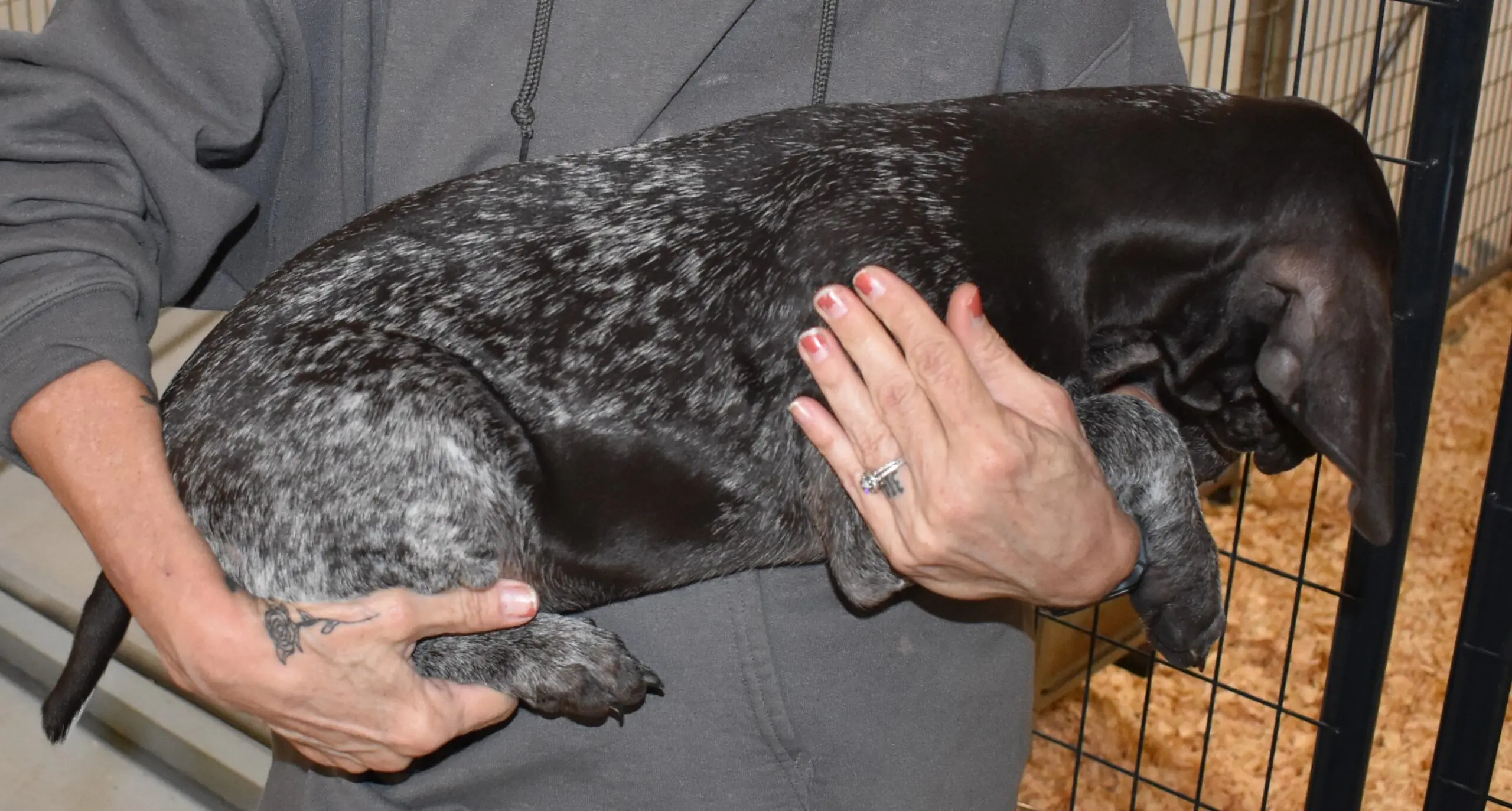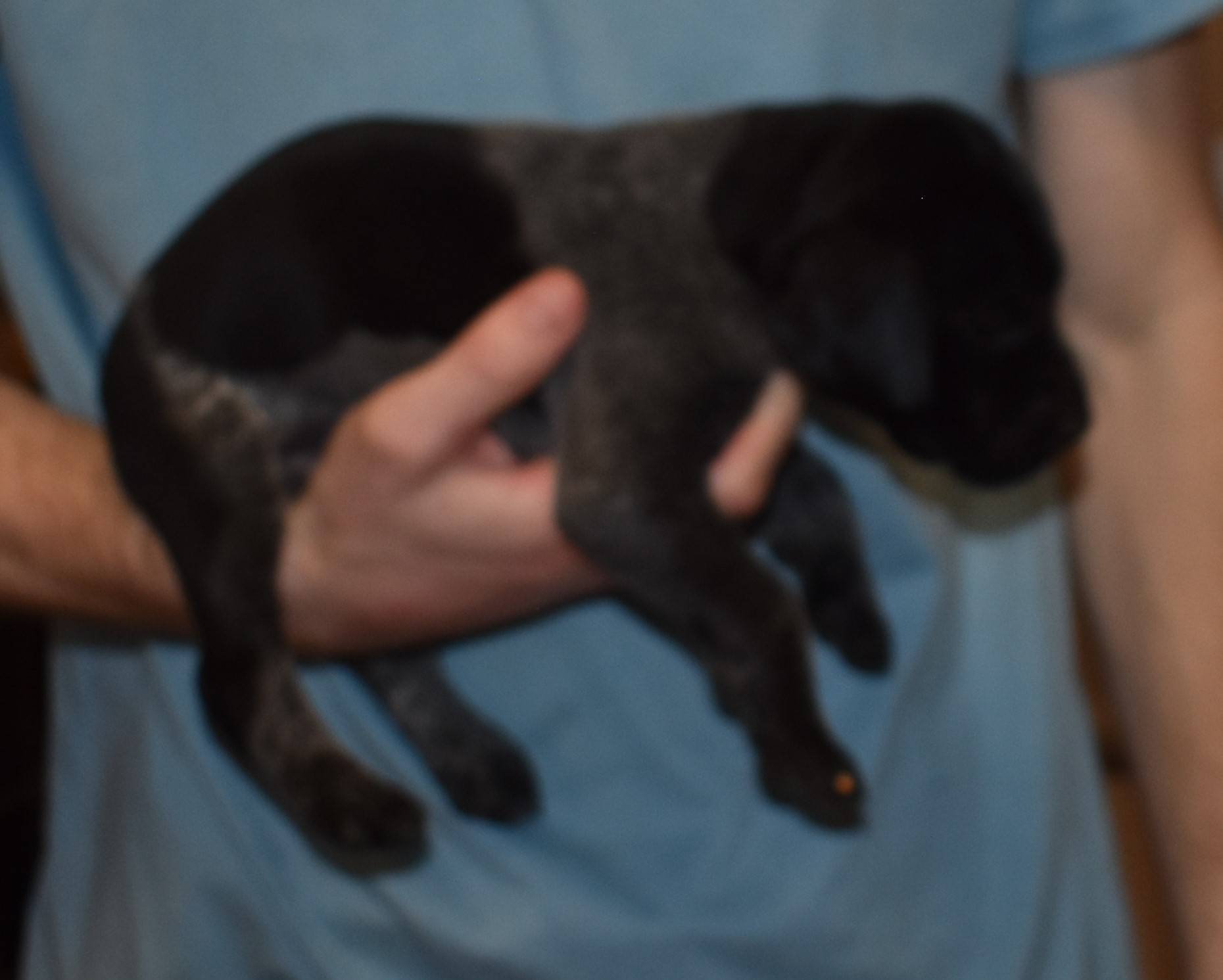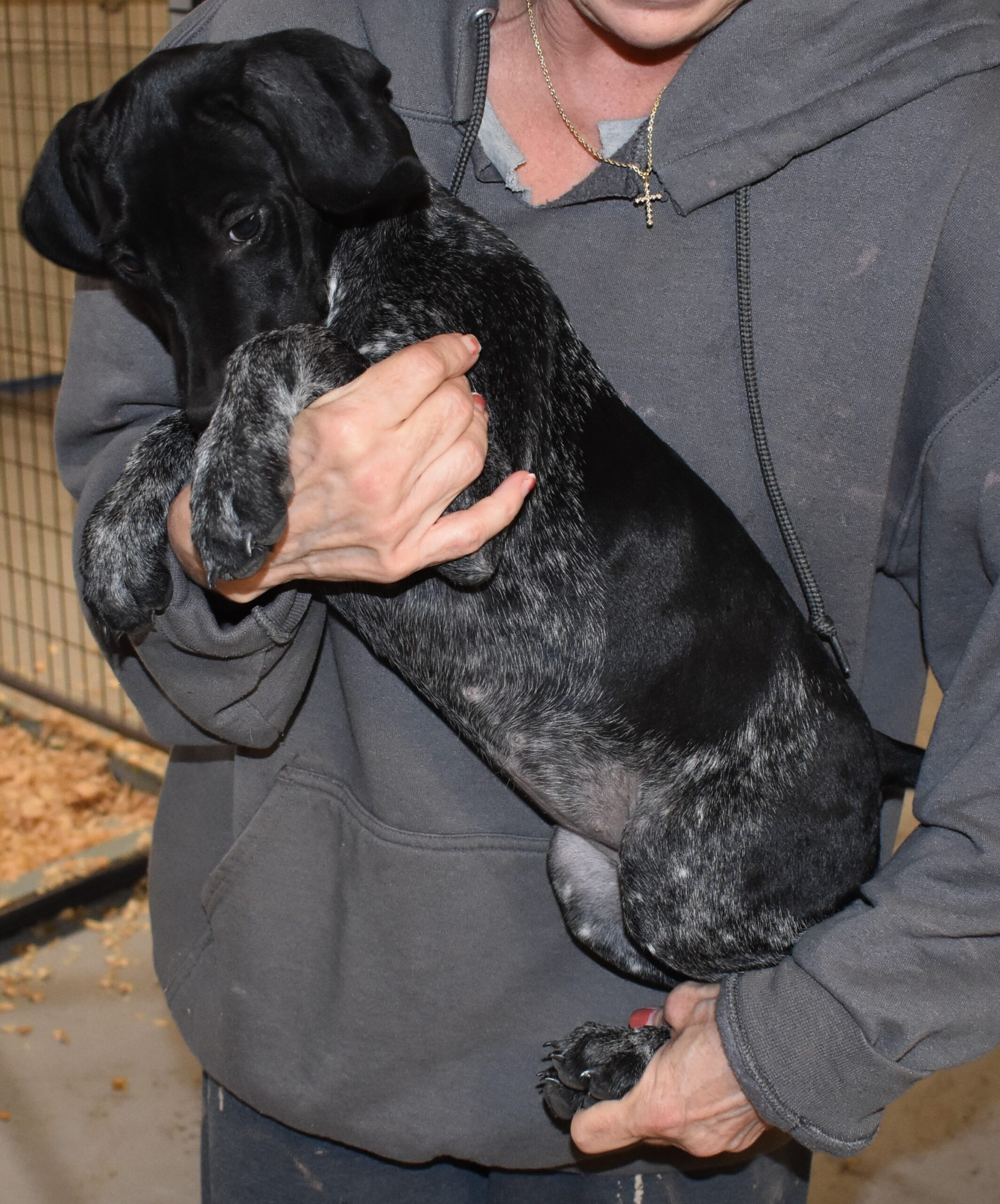 D-Maggie F1 is available. She is gorgeous from Maggie and Deuce. The sire is from one of the top field trial dogs in the country. The dam is from a long line of accomplished field trial dogs. These pups will be great companions and great in the field. The pup’s body is black roan. She is a great looking pup with a solid black head. It was a true pleasure getting to meet Javid and a sincere appreciation for giving this sweet girl a new home. She will be a great addition to the home.