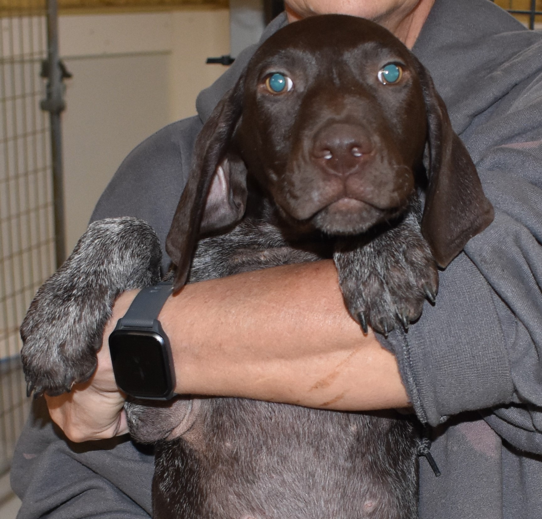 A-Sis F1 is available. She is gorgeous from Sis and Atlas. The sire is a European import with the Deutsch Keuzar. The dam is from a long line of great GSPs. The dam’s dad is a top field trial dog in the country. These pups will be great companions and great in the field. The pup’s body is going to become more liver ticked as she grows. She is a great looking pup with a mostly liver head. Wow! Amy came up with Michelle who came up to get her pup and Amy got this beauty too. Thanks to Randy and Amy!