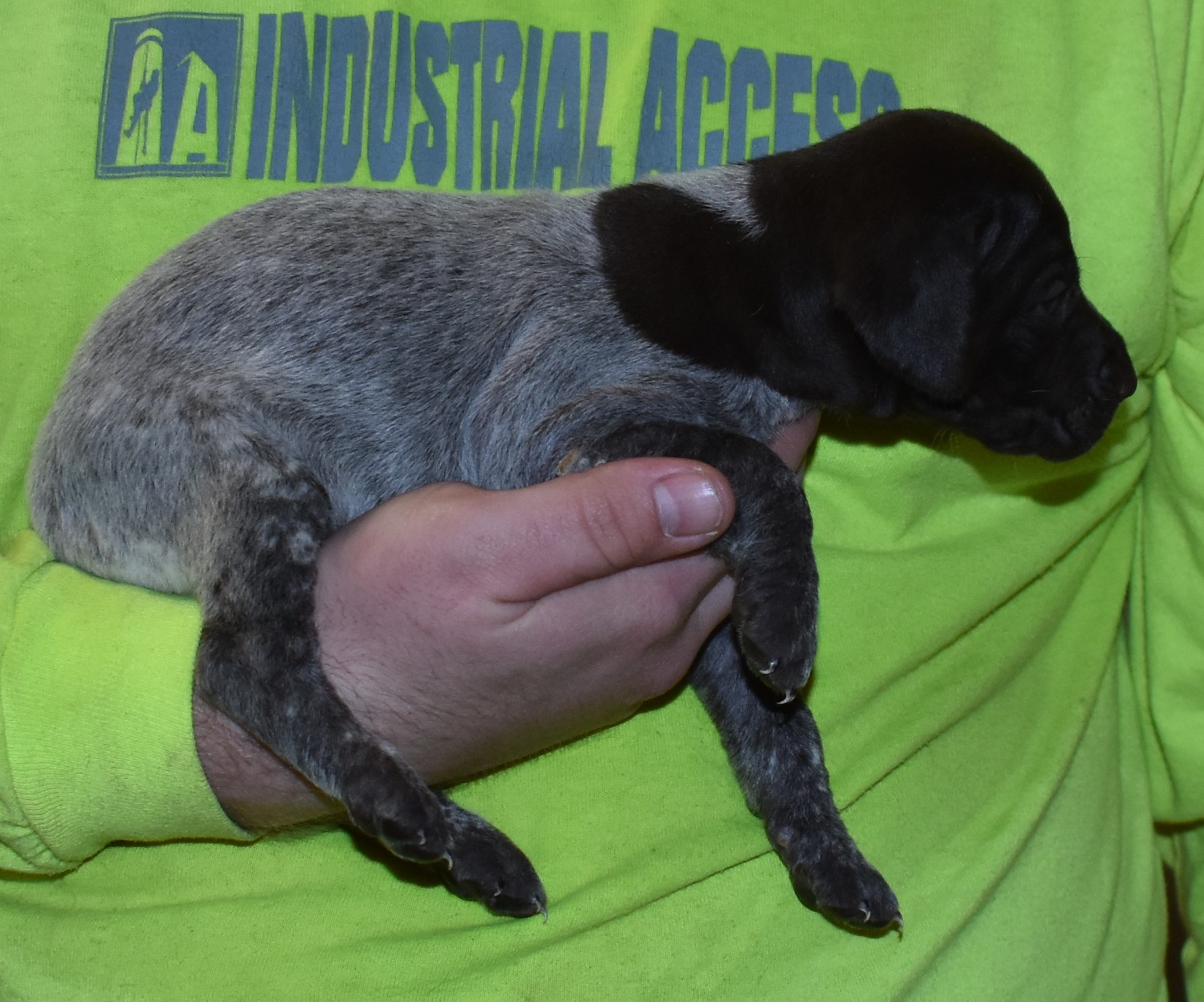(SOLD) L-Deuce M3 is available. He is a beautiful pup. His body is black roan with a large patch. He is a great looking pup with a solid black head. He was born to Lacey and Deuce on 2/2/25. Lacey is the daughter of the great one, Ruger. This pup is also the daughter of great hunting lines on the sire’s side who is the son of a top five field trial dog in the country right now. Previous litters have strong hunting instincts and a pleasing personality. He will be available to go to his new home after 3/17/25. He is $2000 with breeding rights. It was great to have Greyson out to choose this gorgeous boy. And thanks for Nicole and Clay for joining on the visit. I can’t wait to see what this boy looks like as he grows. Send me some pictures.