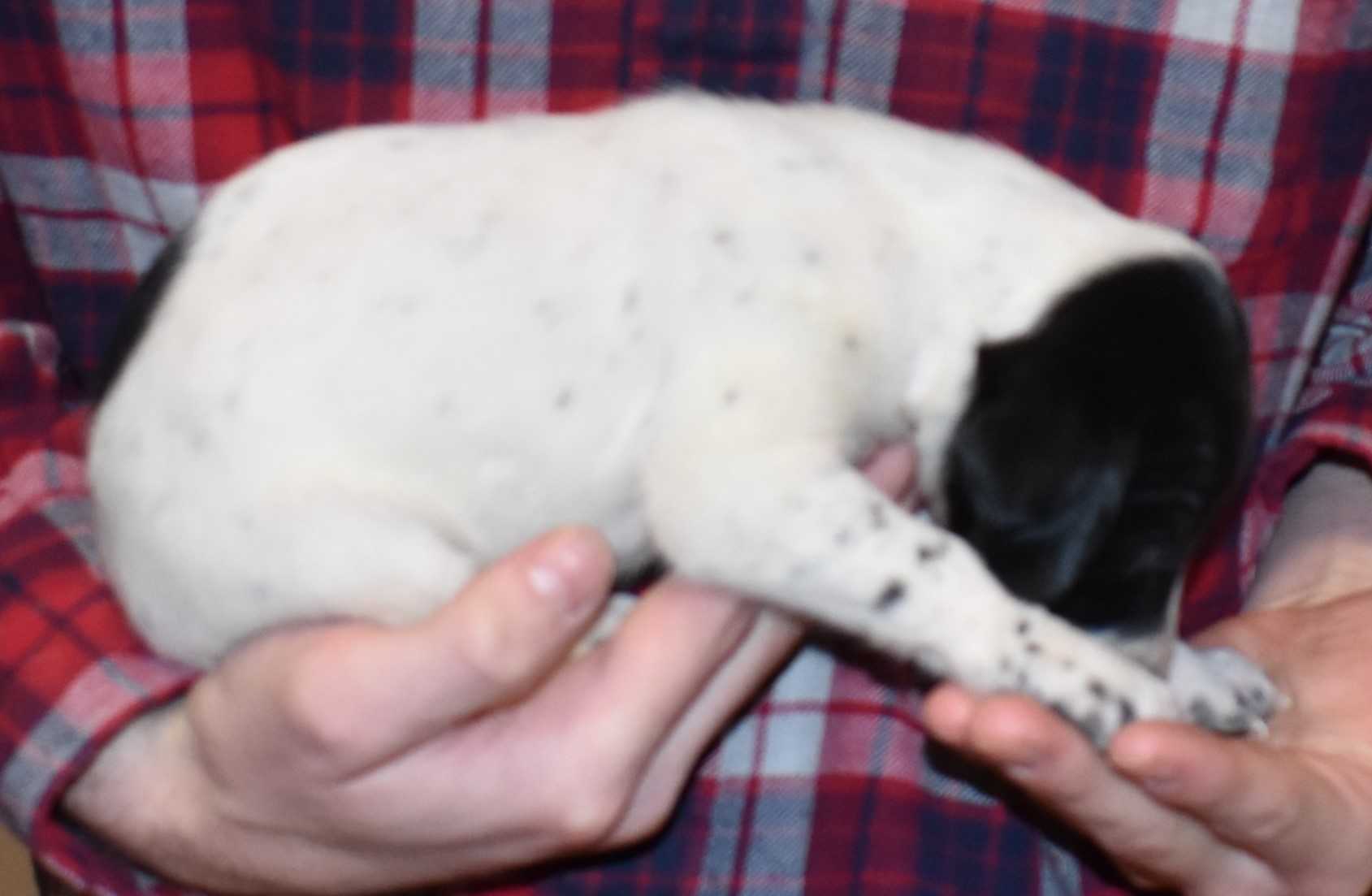 S-Remi M3 is a black patched male from Sis and Remi. The white will become ticked as he grows. The dam of this litter is from a top 10 field trial dog. This pup is going to be a sweet and smart boy. The sire of the litter is a third generation from our kennels and has always produced beautiful, smart companions and hunting dogs. He was born 6/2/25. He will be ready to go to his new home after 7/14/25. He is $2500 with breeding rights and $2300 without. Get your deposit in soon. Email [email protected] or call/text 678-316-2858. Another lucky pup that got to home with Michael, Haley, and Macey. Two is a great number to have!