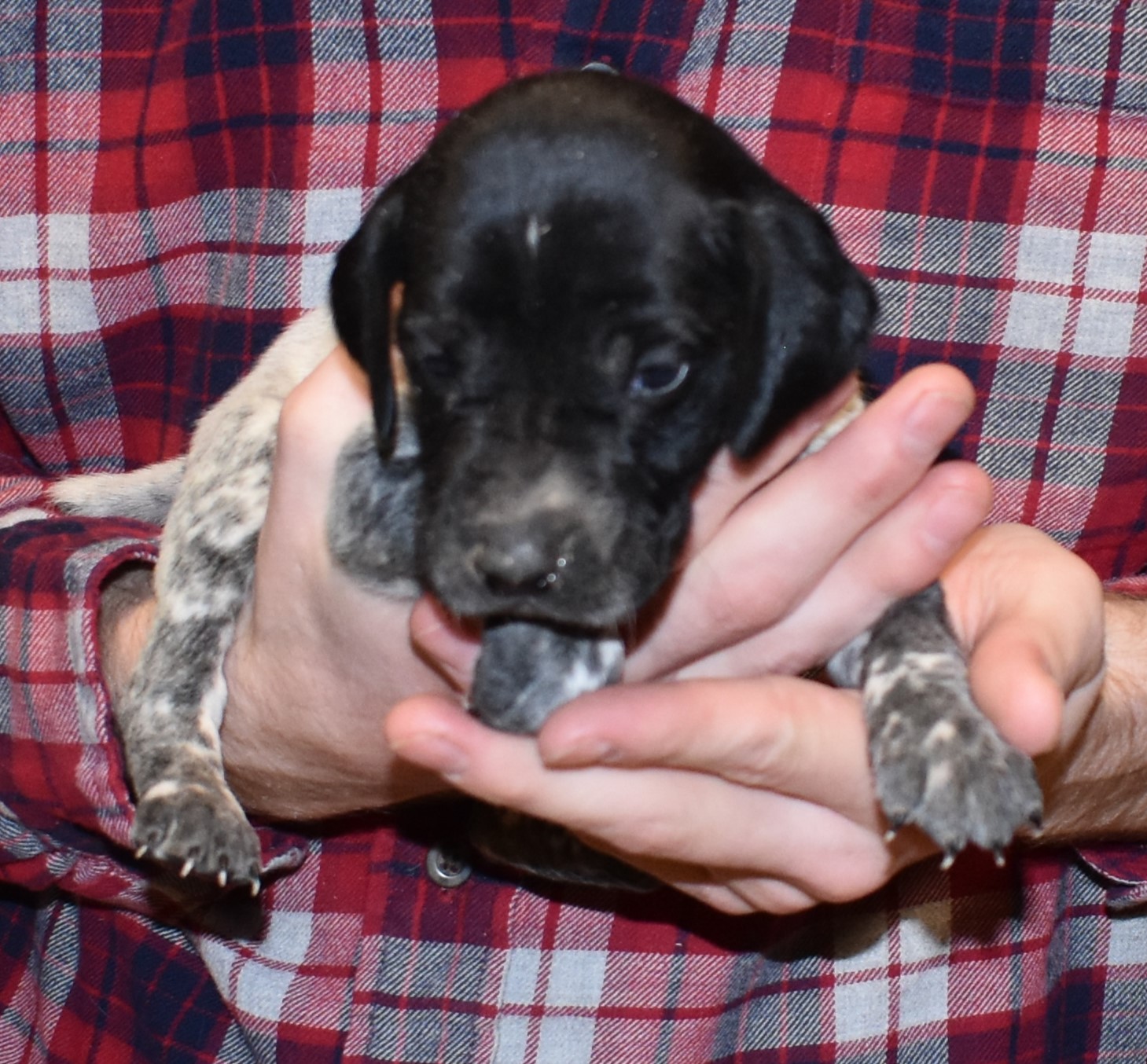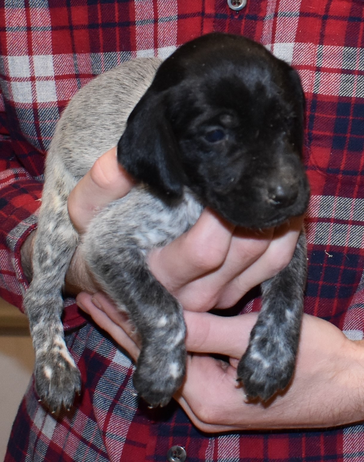 Meet S-Remi M1, a striking black patched male GSP pup from Sis and Remi. As he grows, his white patches will develop into a charming ticked pattern. Sis, his dam, is a descendant of a top 10 field trial dog, ensuring high potential and admirable traits. Remi, his sire, is a third-generation dog from our kennels, renowned for producing intelligent, beautiful companions and exceptional hunting dogs.
