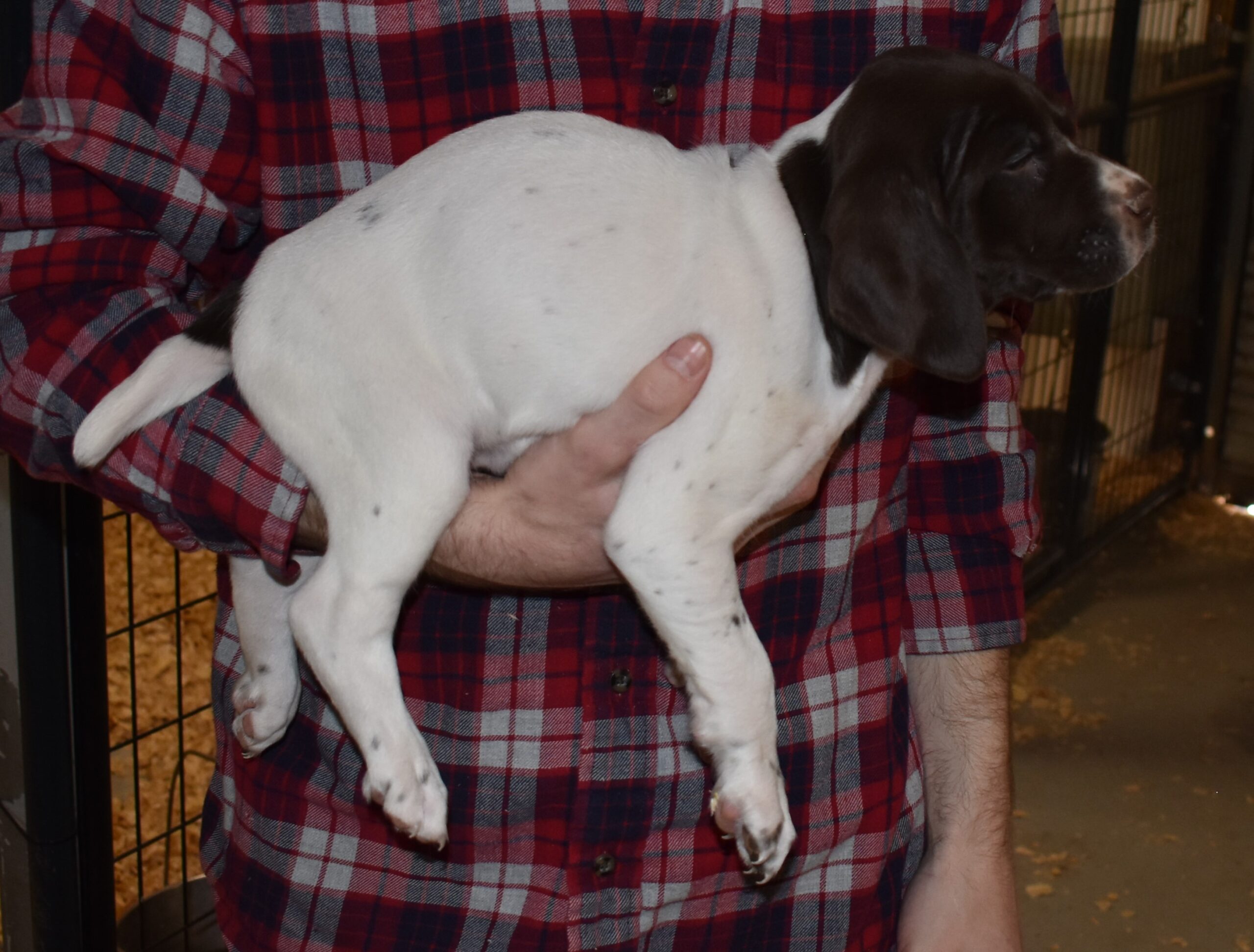 Meet B-Atlas M4, a striking liver roan male GSP pup from Bailey and Atlas. As he grows, his white will develop into a gorgeous roan pattern. Bailey, the dam, is from some of the best GSP genetics in the country and the sire, Atlas, is a European import with a Deutsch Keuzar title. This litter will produce intelligent, beautiful companions and exceptional hunting dogs. Thanks to Kevin, Jessica, and their sweet girls for coming back for their second dog from our kennels. He is going to be a great addition to the family.